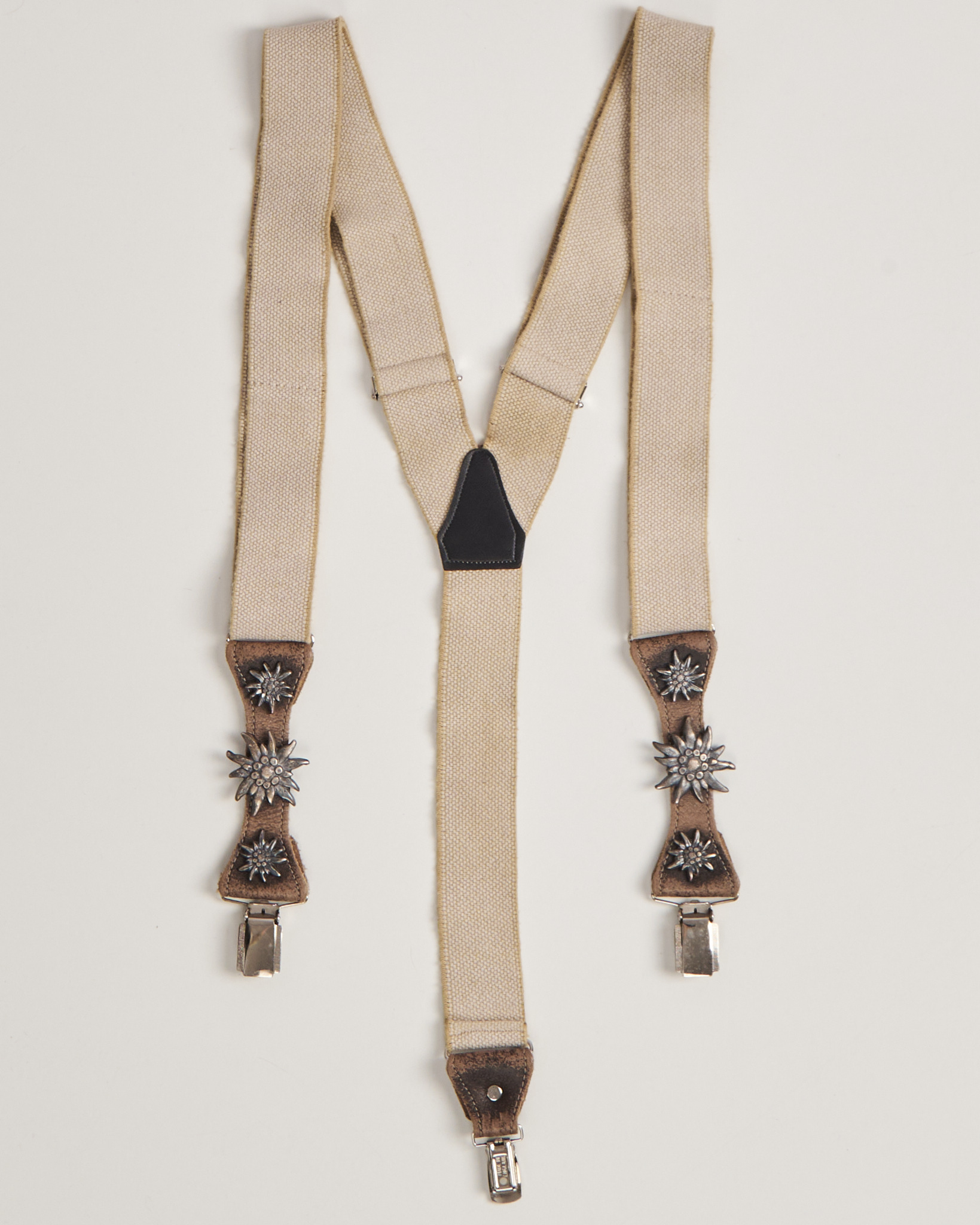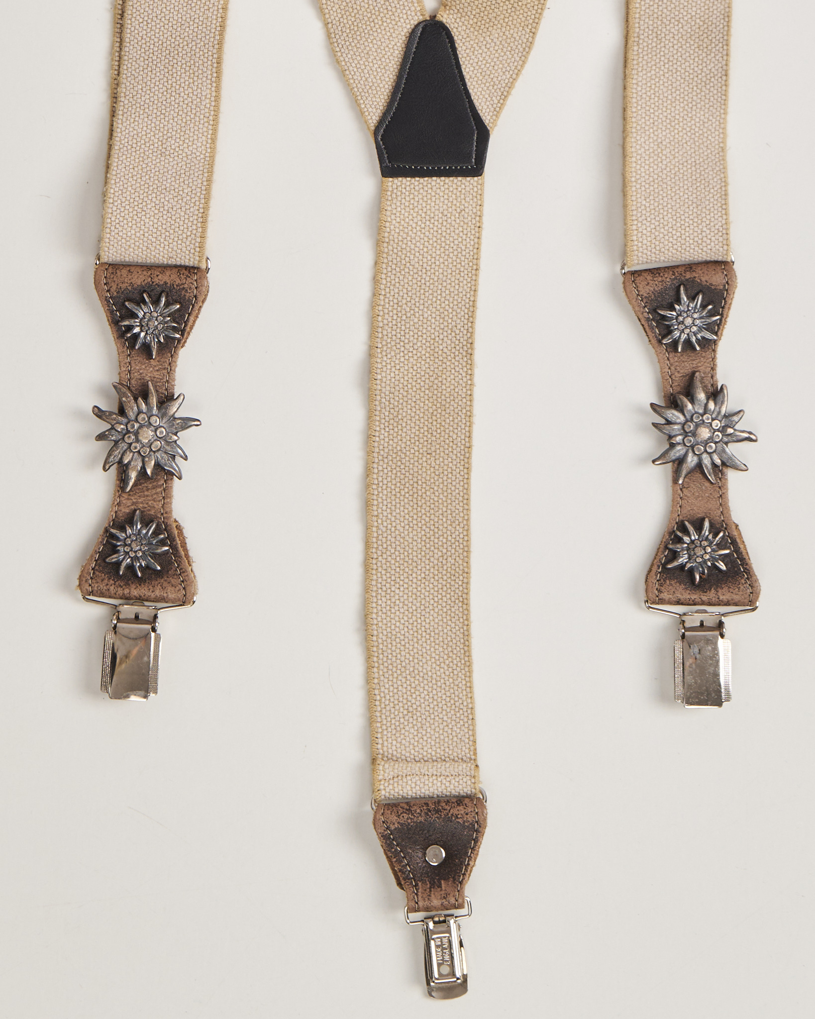 Подтяжки в стиле бохо с регулируемой посадкой. Кожаные вставки дополнены металлическими эдельвейсами с рельефным декором. Надёжные зажимы фиксируются чётко и обеспечивают стабильную посадку.
