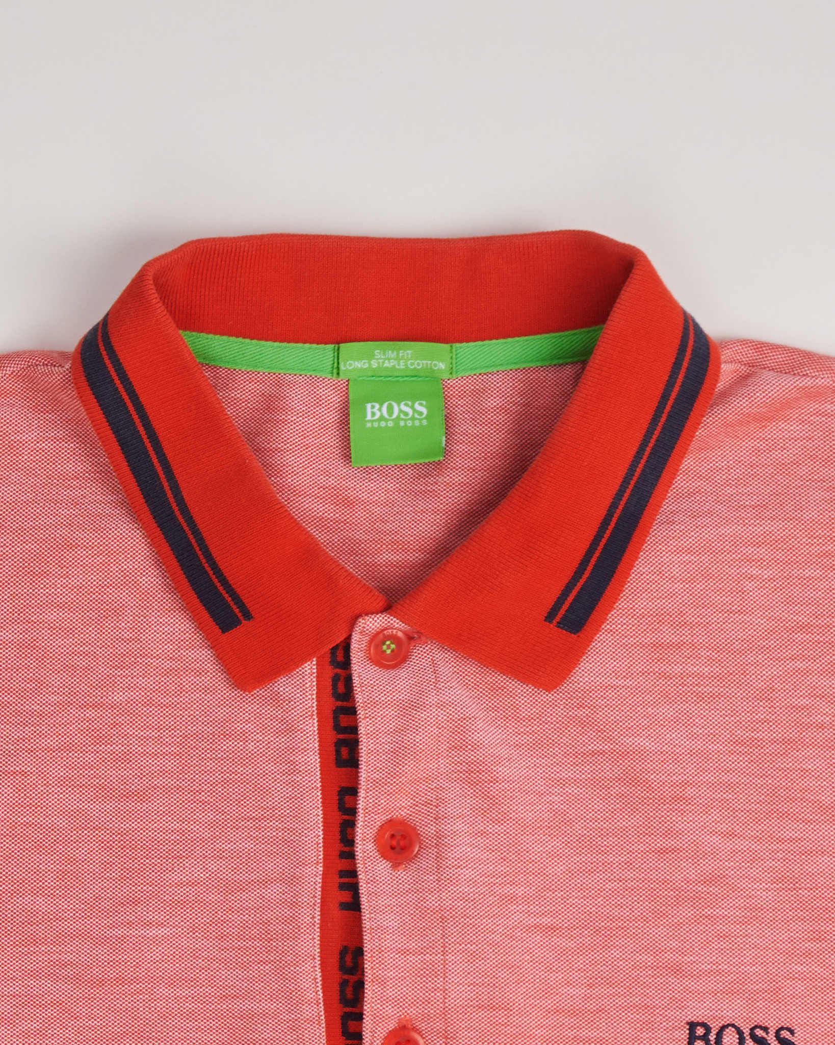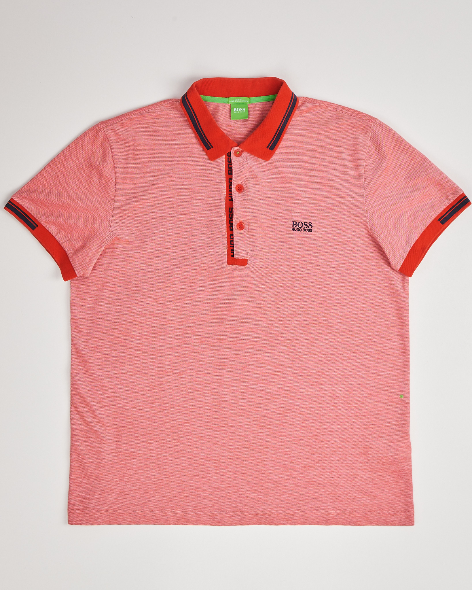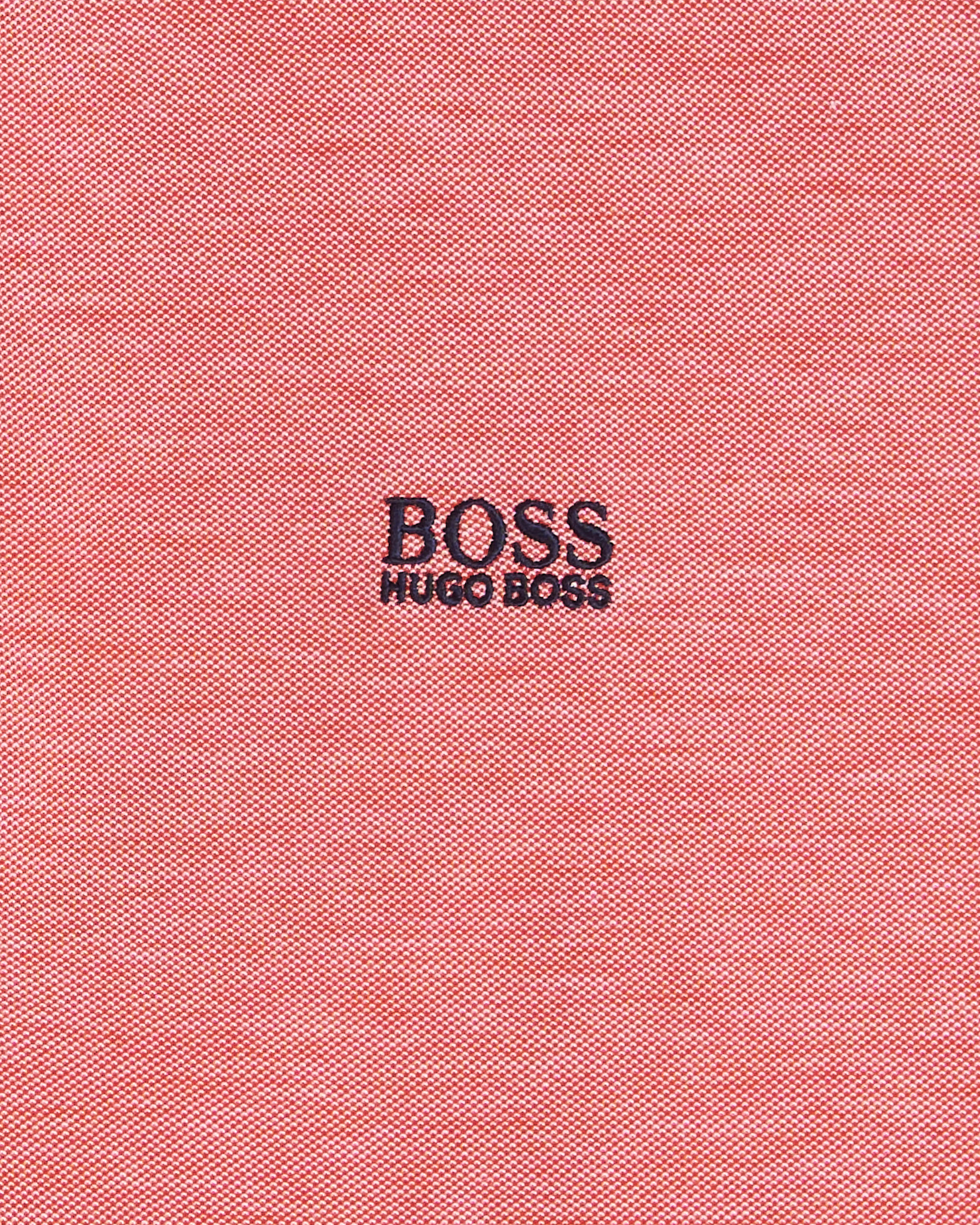 Поло из хлопка Hugo Boss темно - розового цвета. Прямая посадка. На груди вышит логотип. Брендированные пуговицы. Внутренняя часть воротника украшена яркой зеленой вставкой.