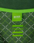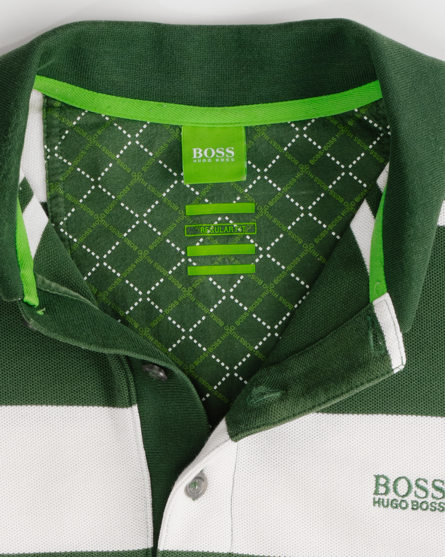 Поло выполнено из 100% хлопка. Горизонтальная широкая полоска в зелёно-молочной гамме. Классический воротник и планка на пуговицах. Посадка свободная.