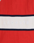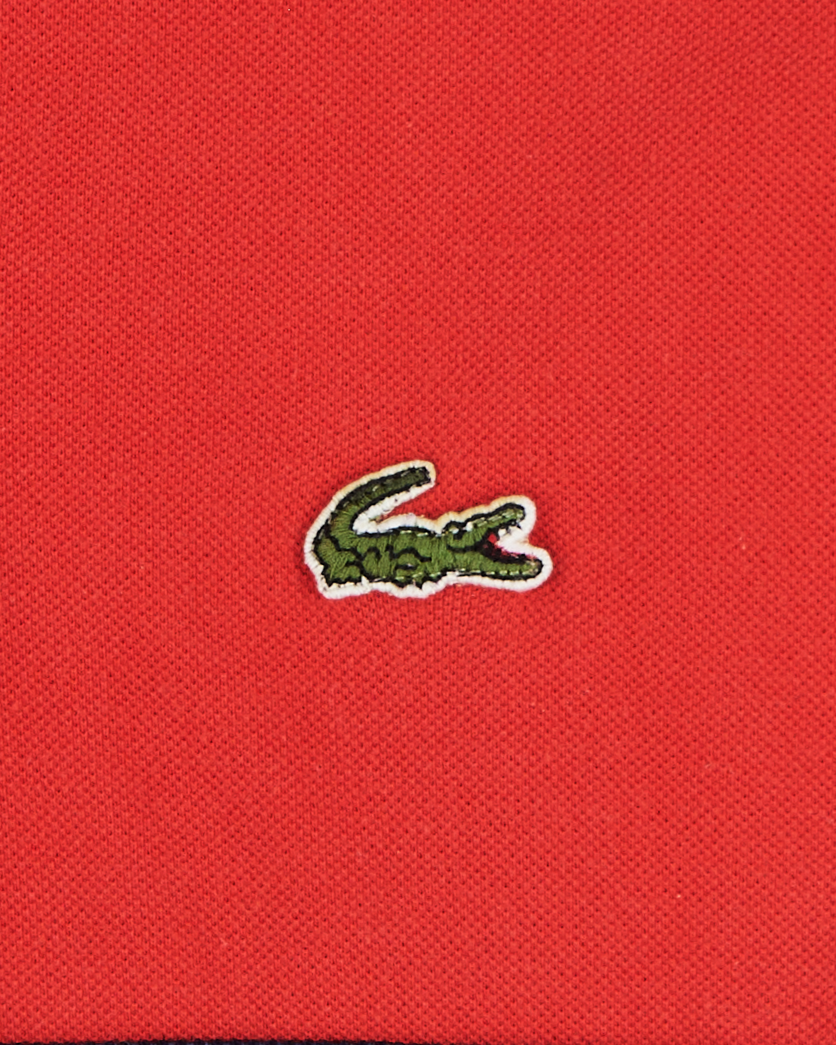 Поло Lacoste из плотного хлопка красного цвета. Посадка свободная, контрастное сочетание белого и красного цвета, на спине вышивка с названием бренда. Фирменный патч крокодила на груди.