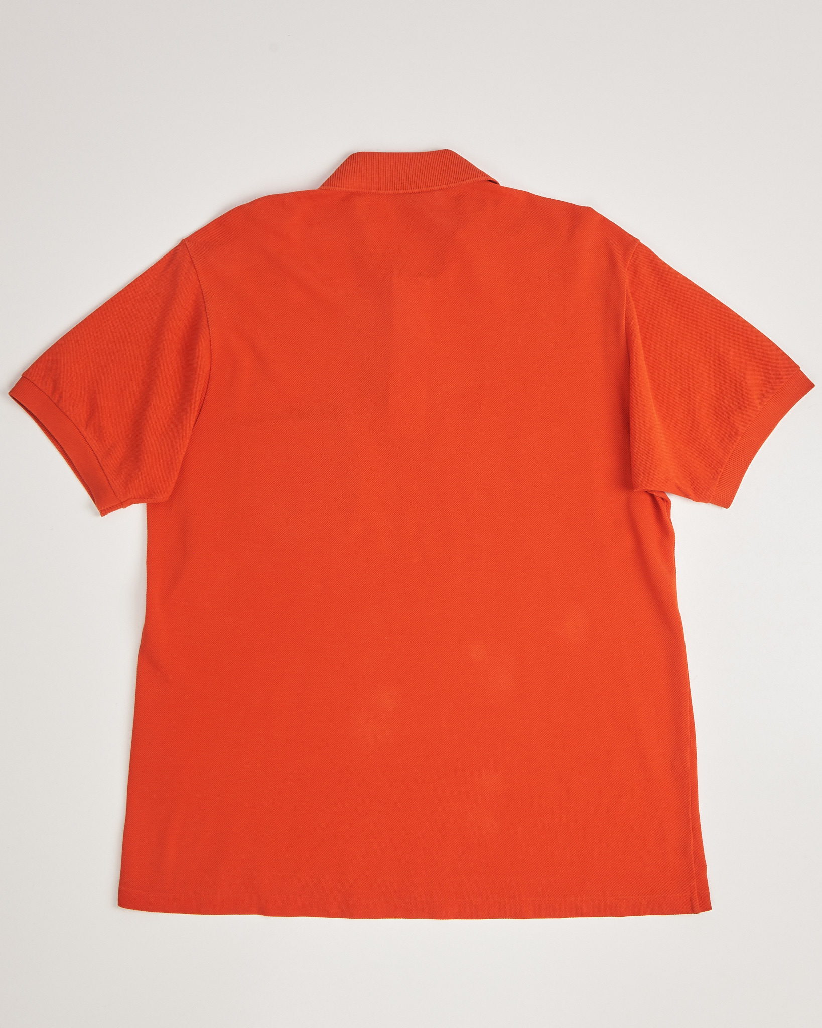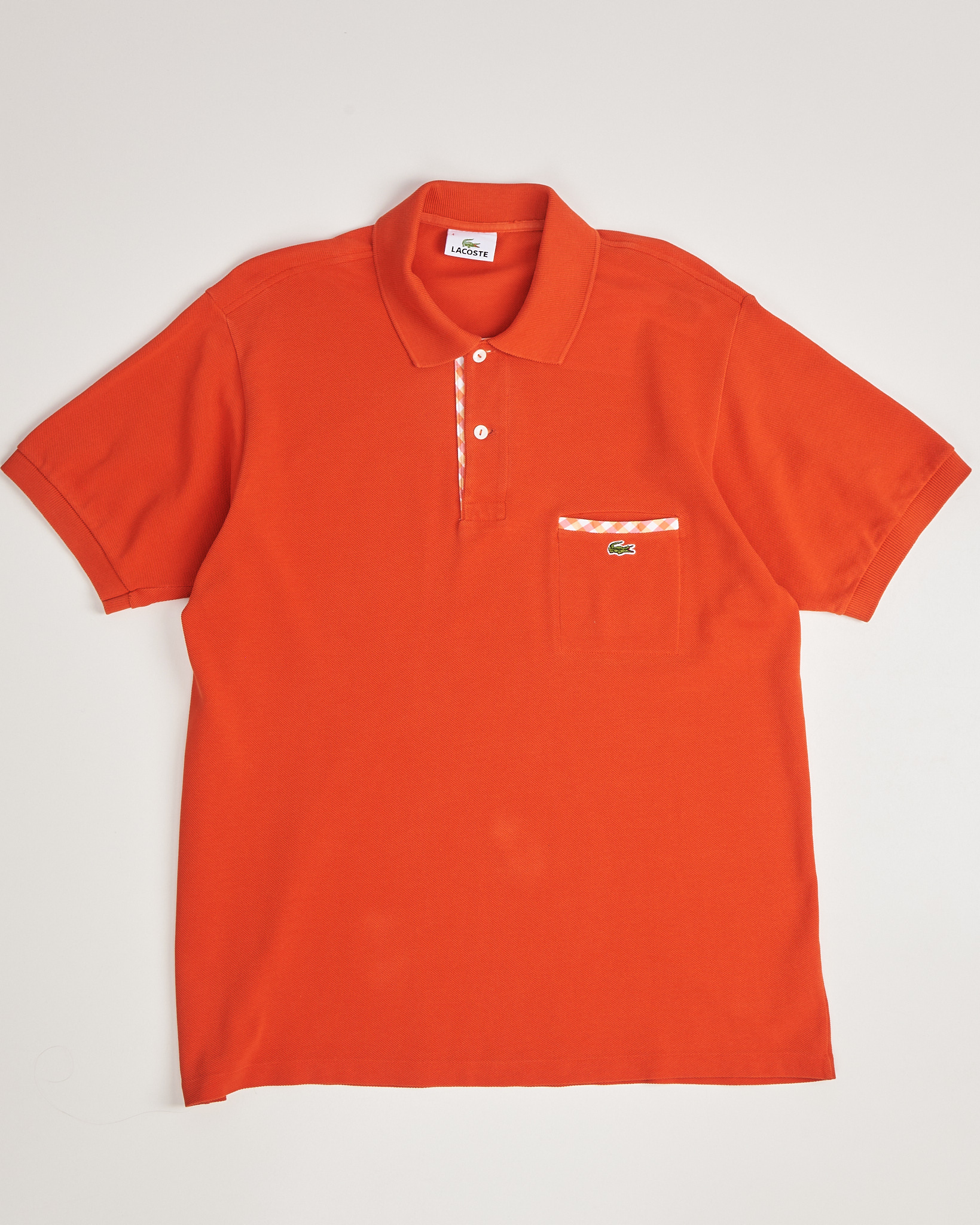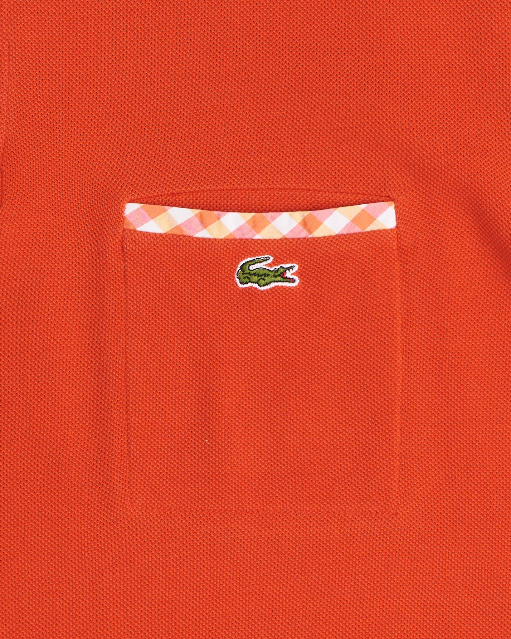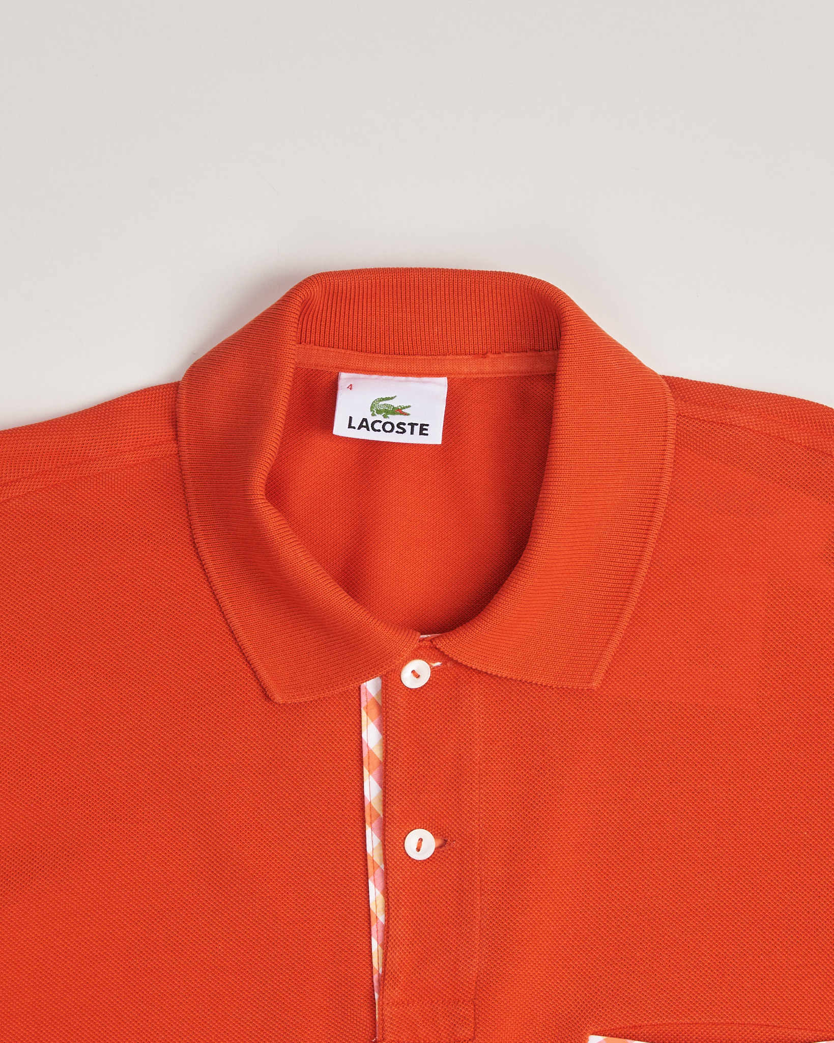 Поло Lacoste темно - оранжевого цвета. Свободный силуэт. Короткий рукав с аккуратной манжетой. Застежка на две пуговицы. Внутренняя планка и край нагрудного кармана оформлены контрастной вставкой в клетку. На кармане расположен вышитый логотип.