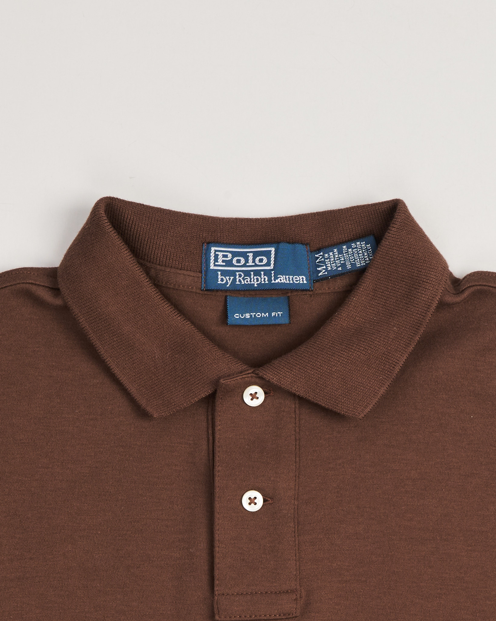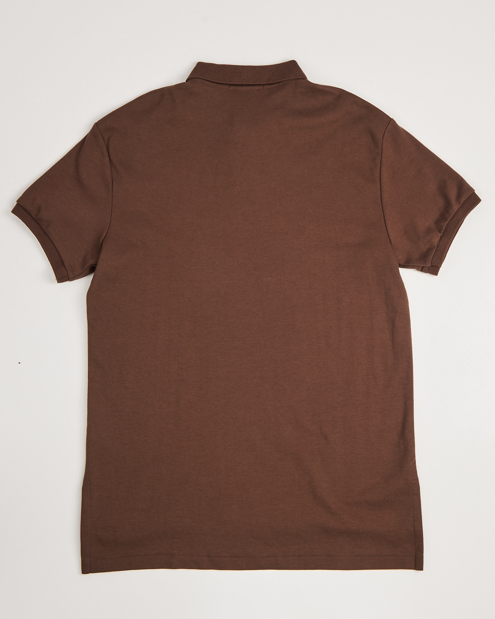 Поло из хлопка Ralph Lauren коричневого цвета. Посадка custom fit. Классический воротник. Планка на двух контрастных пуговицах. На груди фирменный логотип. Низ с небольшими боковыми разрезами.