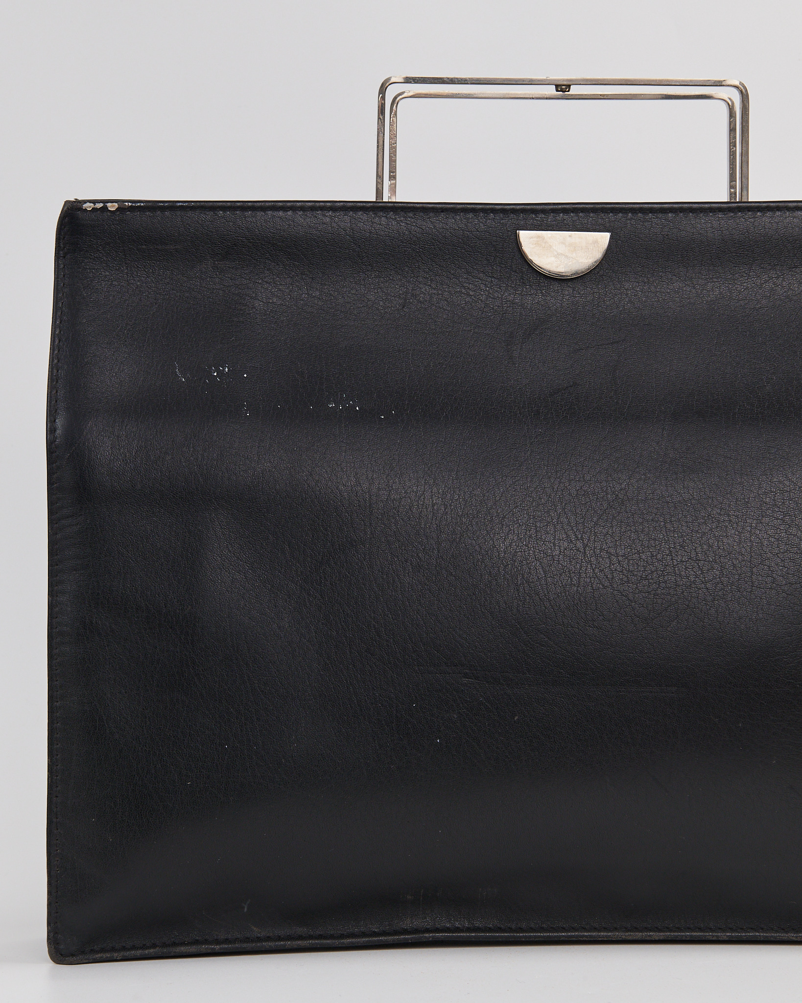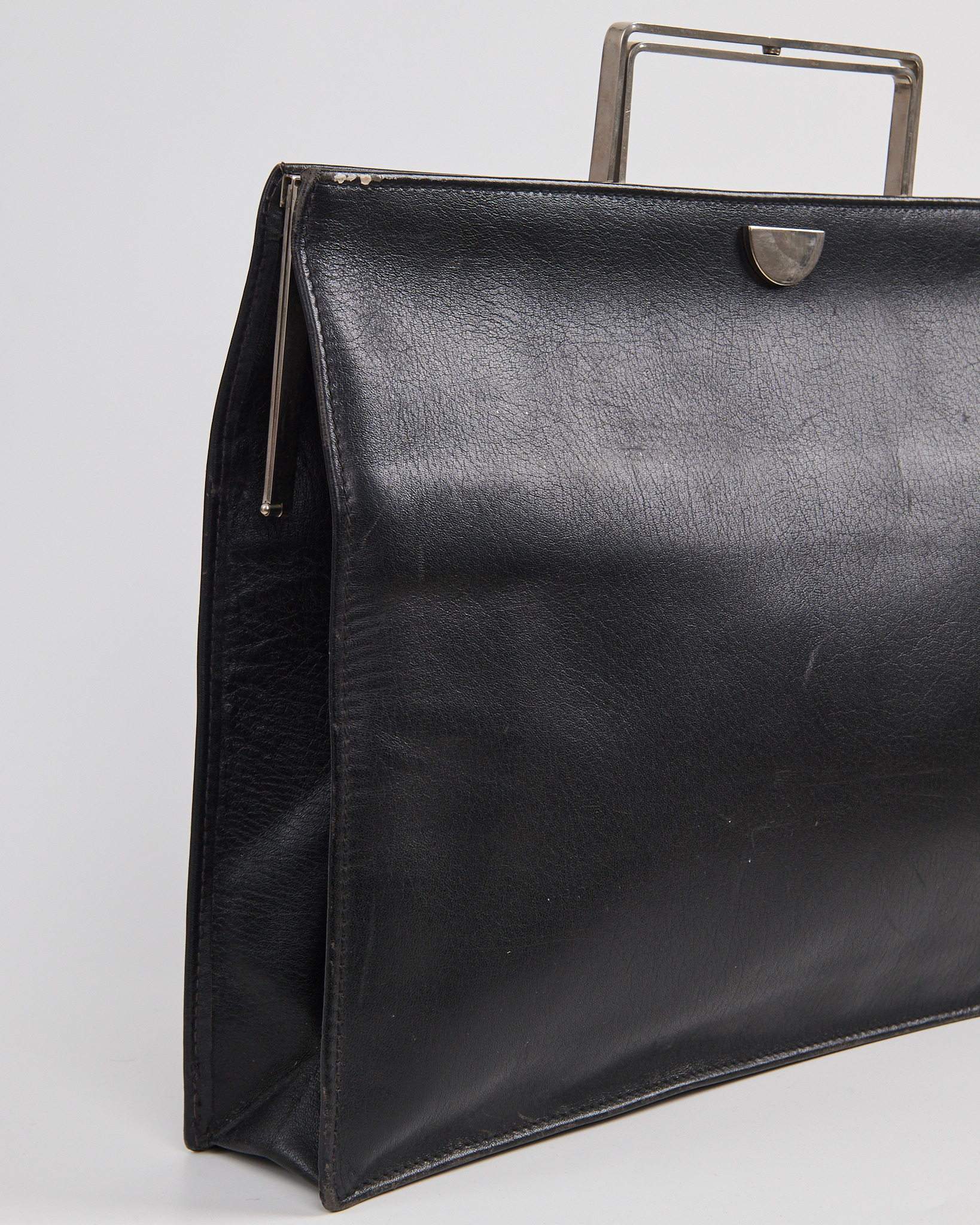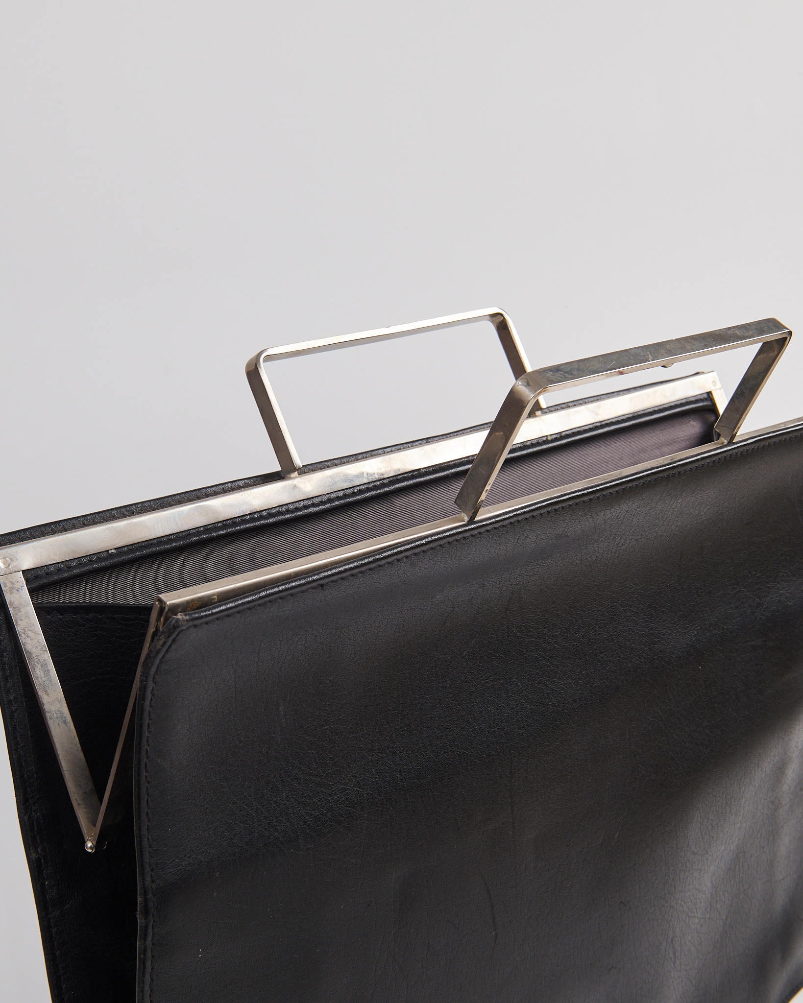 Портфель выполнен в глубоком чёрном оттенке. Жёсткая металлическая рамка формирует четкий силуэт и служит акцентной деталью конструкции. Внутри — вместительное отделение