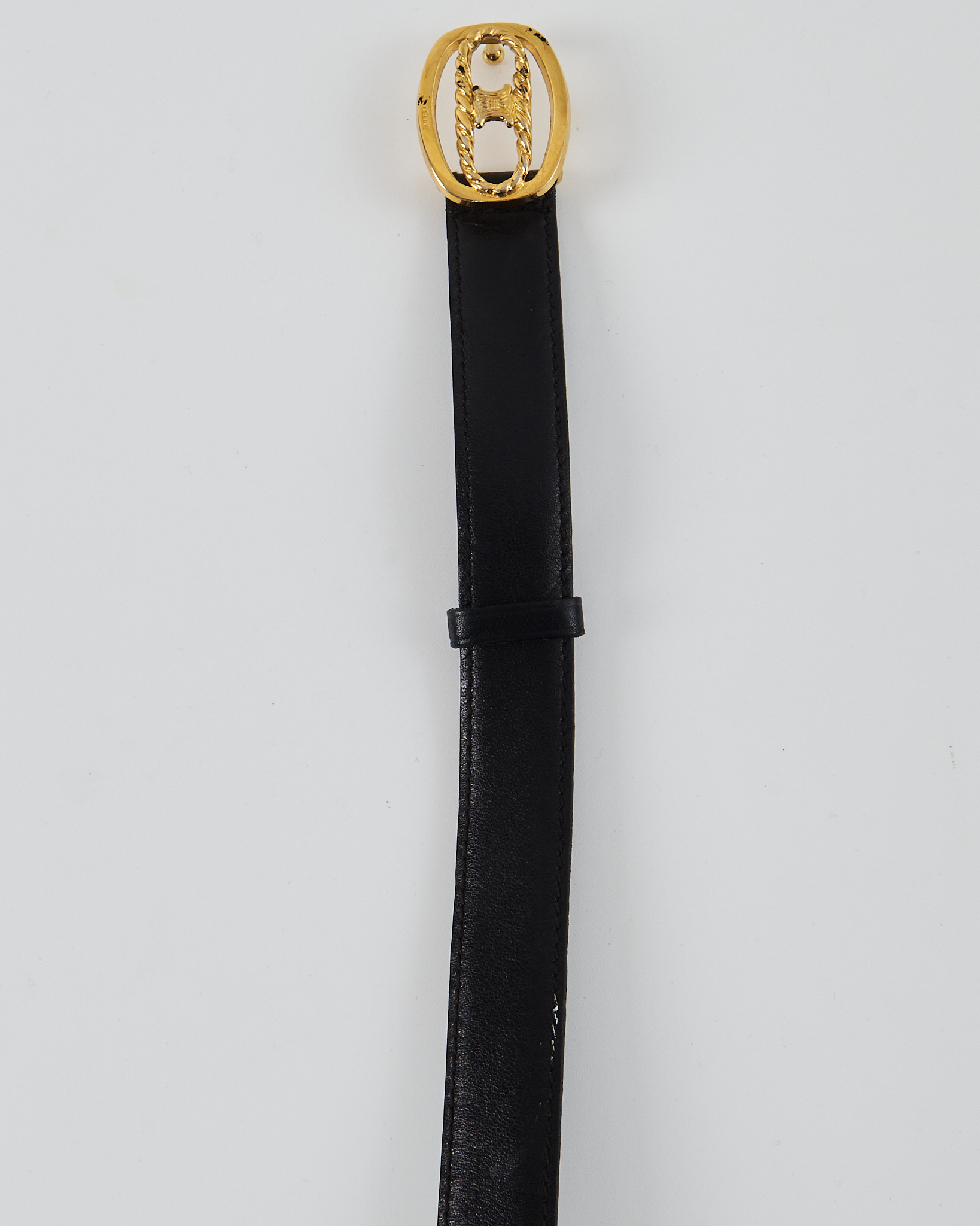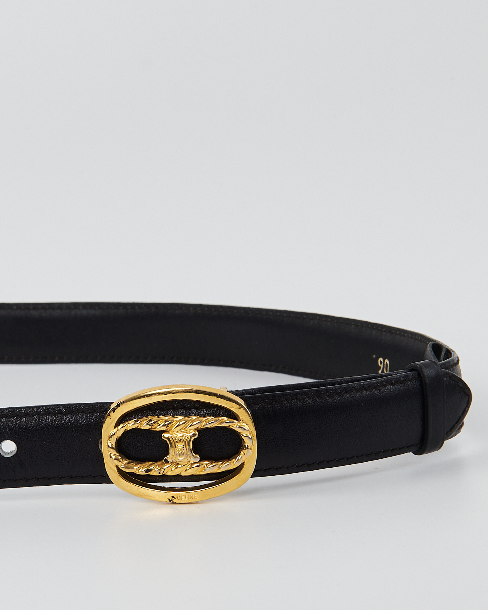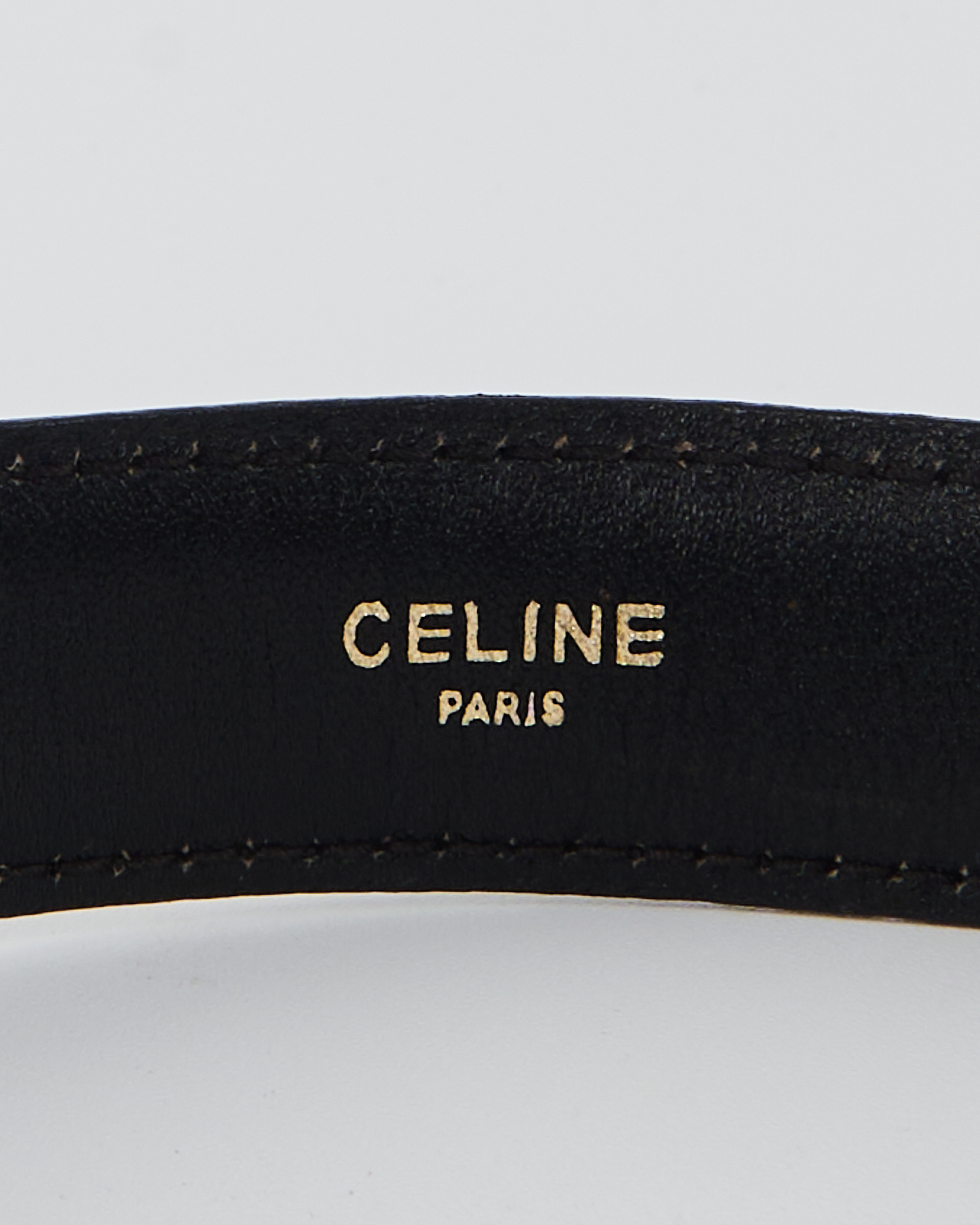 Ремень Celine с золотой пряжкой. Плотный, гладкий материал с мягкой пластинкой и деликатным блеском. С овальной золотистой пряжкой с логотипом бренда.