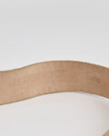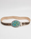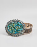 Ремень из натуральной кожи с широкой овальной пряжкой, украшенной бирюзовой крошкой и металлическим обрамлением. Пряжка собрана из множества камней, каждый из которых отличается оттенком и рисунком. Тиснёный орнамент на коже и металлические заклёпки.