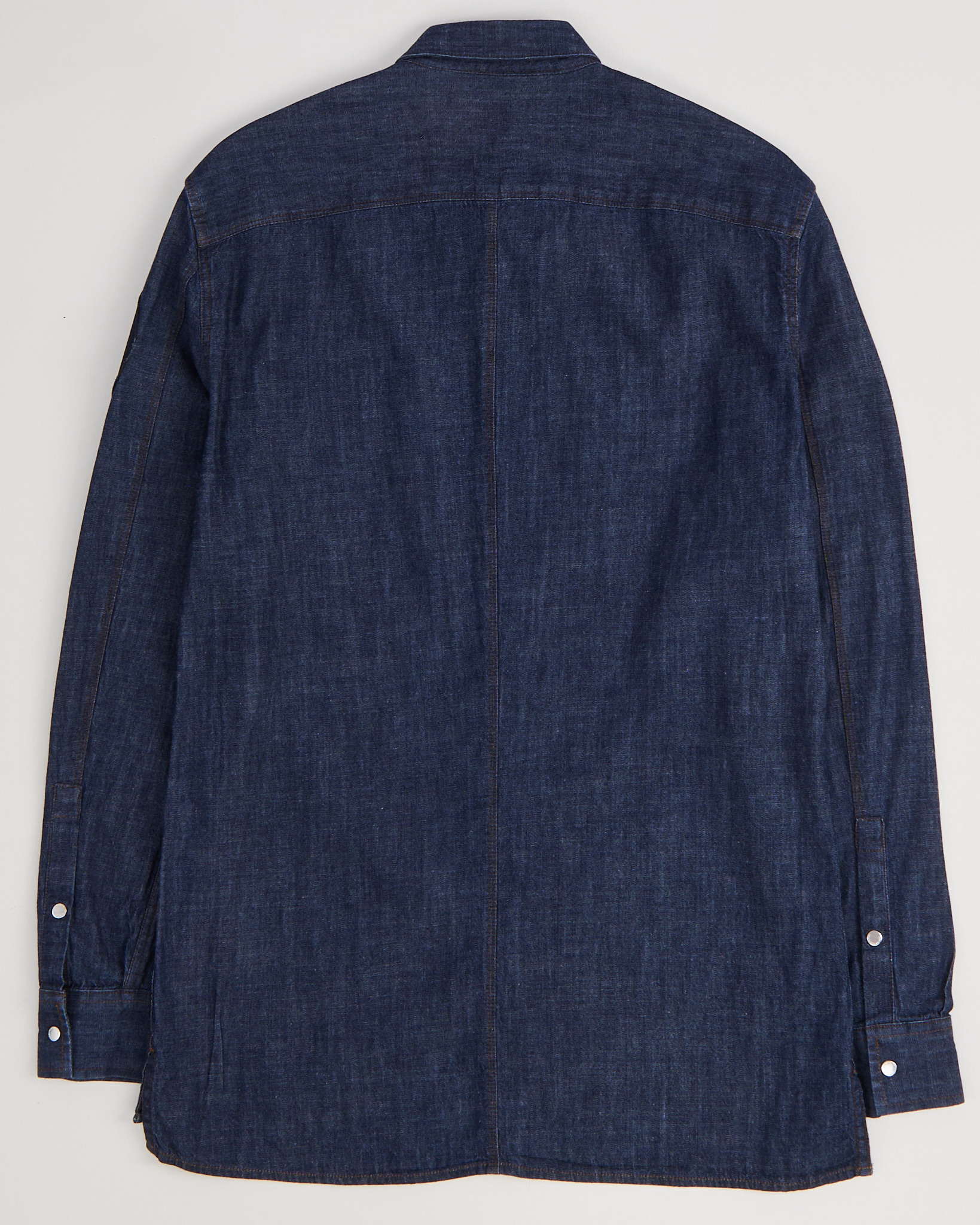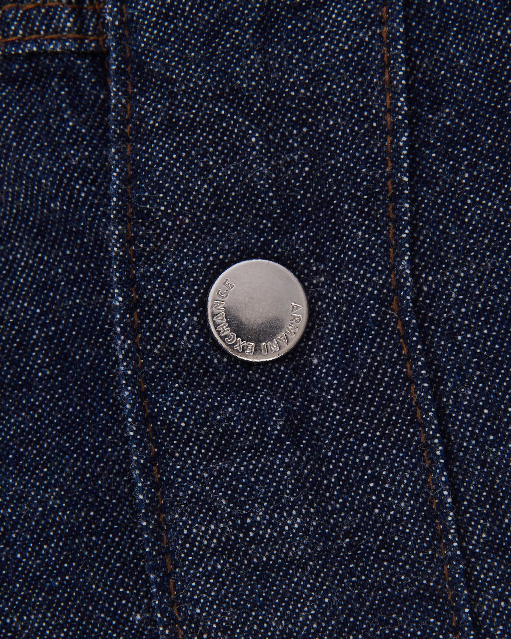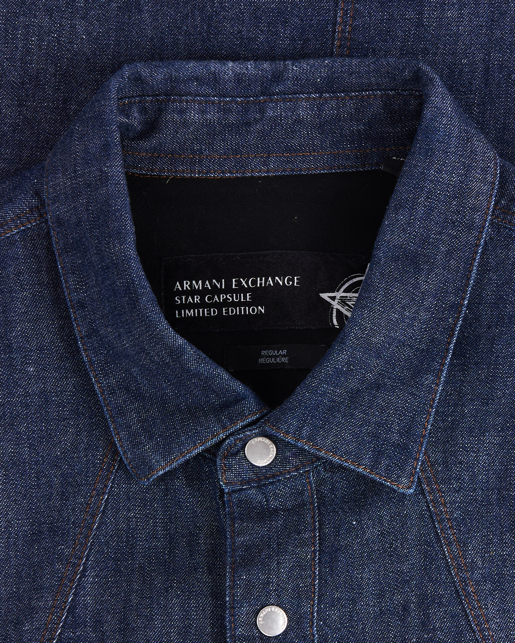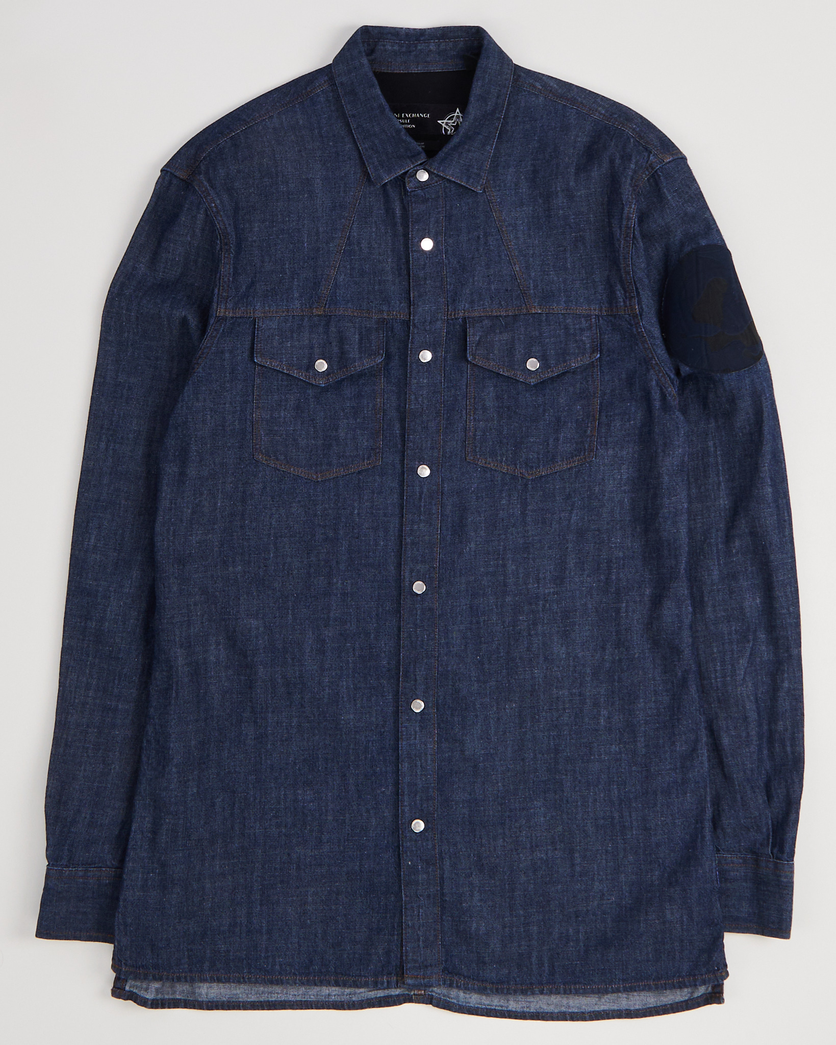 Рубашка из хлопка Armani Exchange темно - синего цвета. Застежка на металлические брендированные кнопки по всей длине. Двойная отстрочка контрастной нитью. Кокетка с геометричной линией. На рукаве текстильная круглая нашивка с рельефным узором. Сзади тканевая пластина с логотипом бренда.