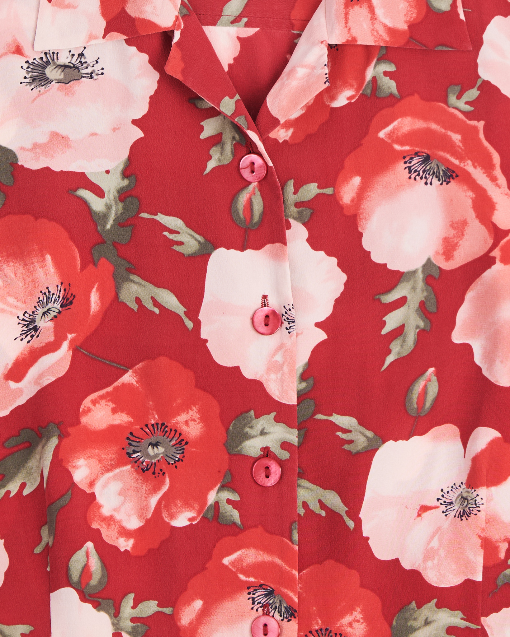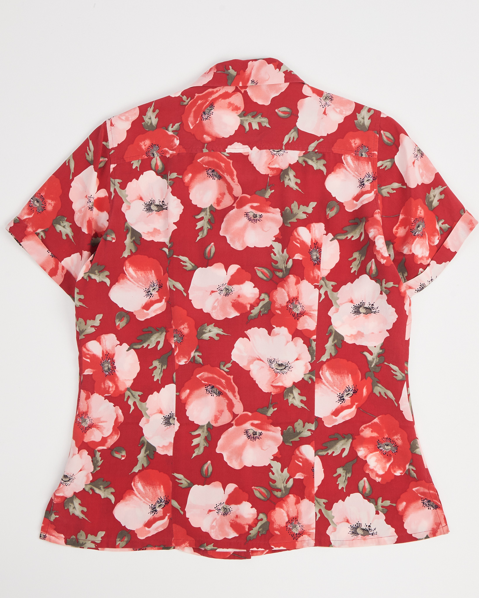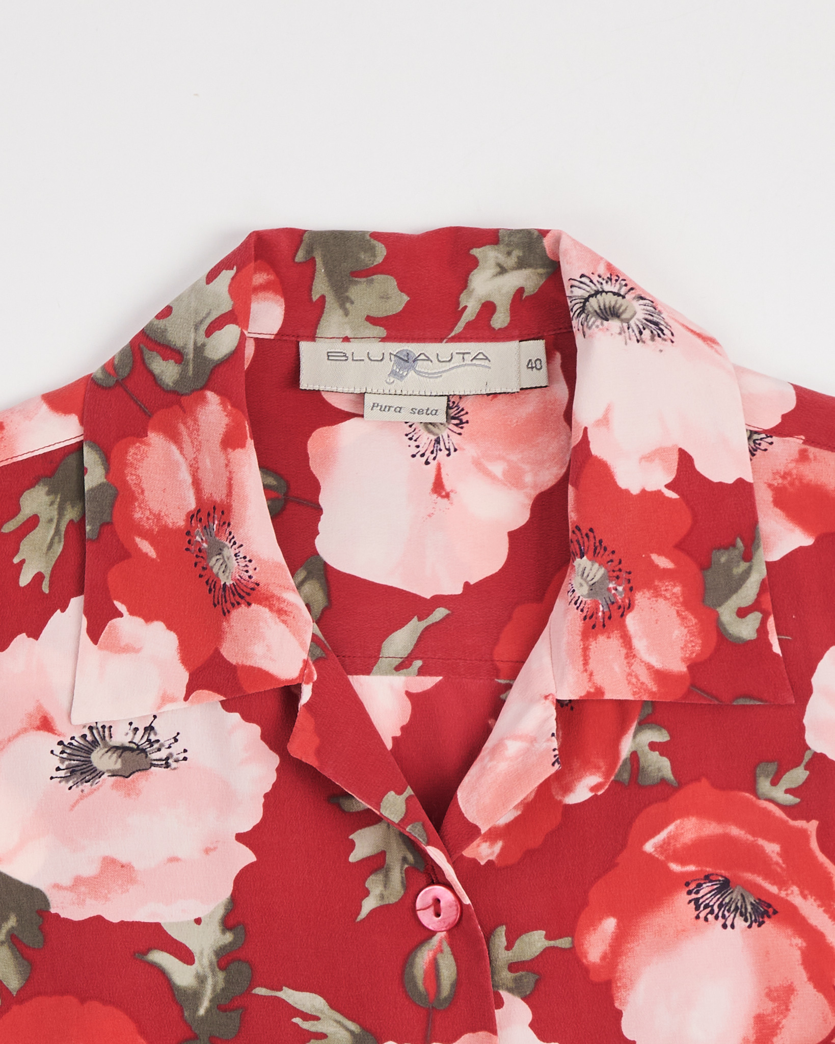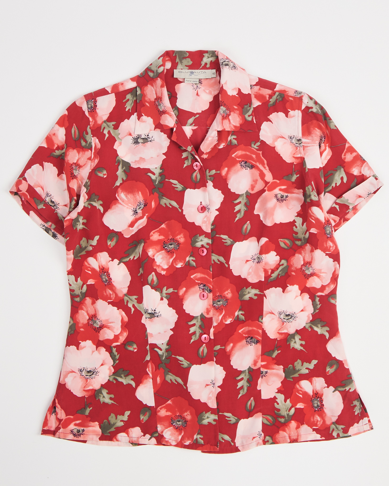 Рубашка из шелка Blunauta красного цвета с цветочным принтом. Полуприлегающая посадка. Отложной воротник. Застежка на пуговицы в тон. Короткий рукав. Легкая сборка по бокам.