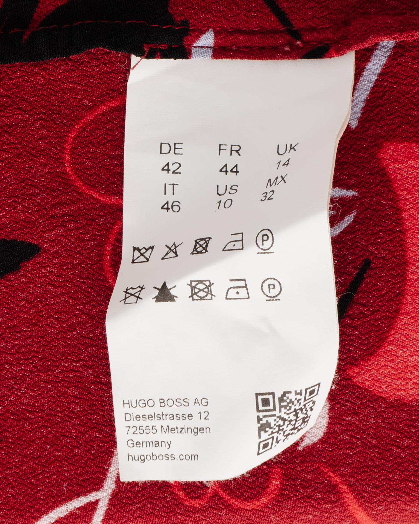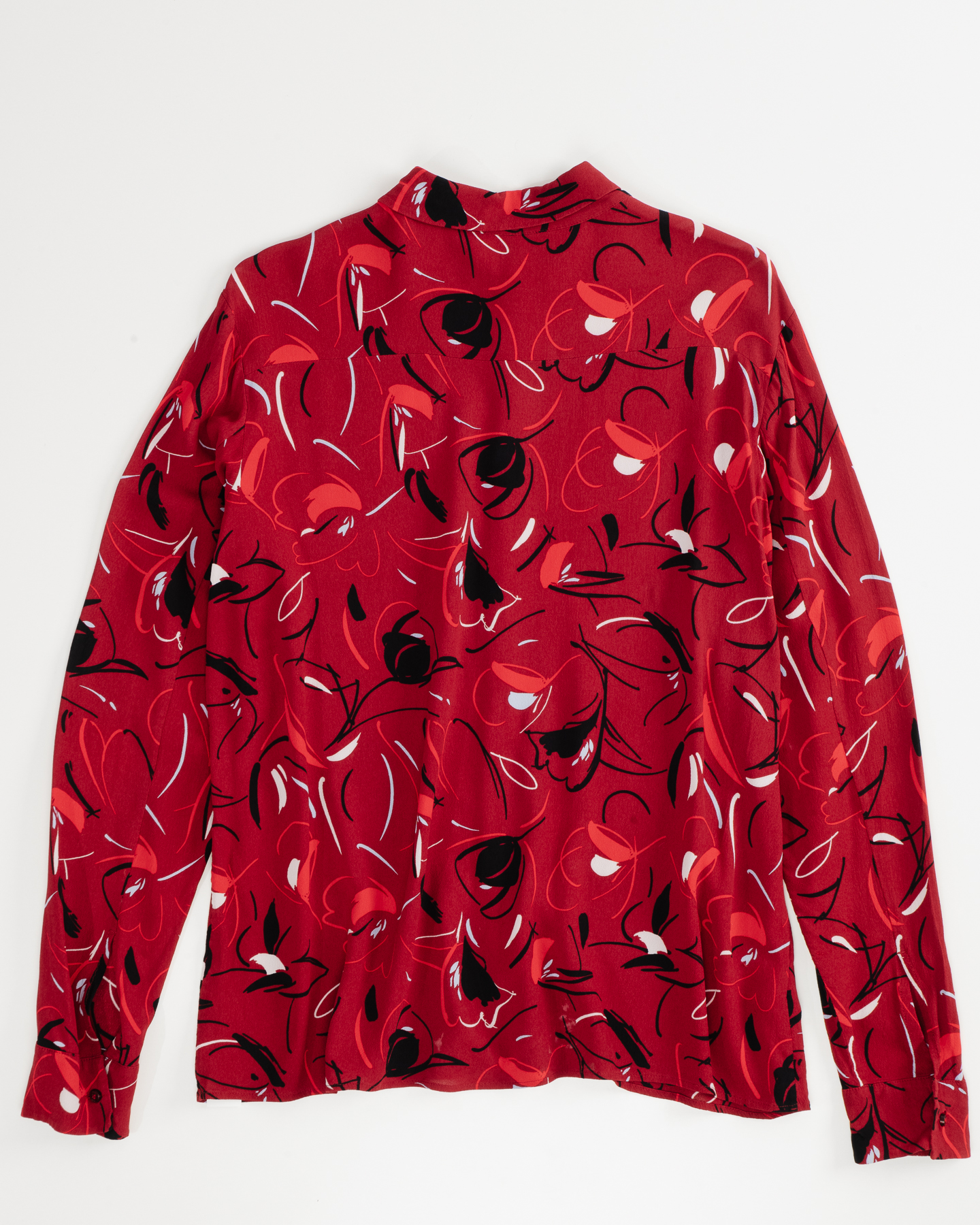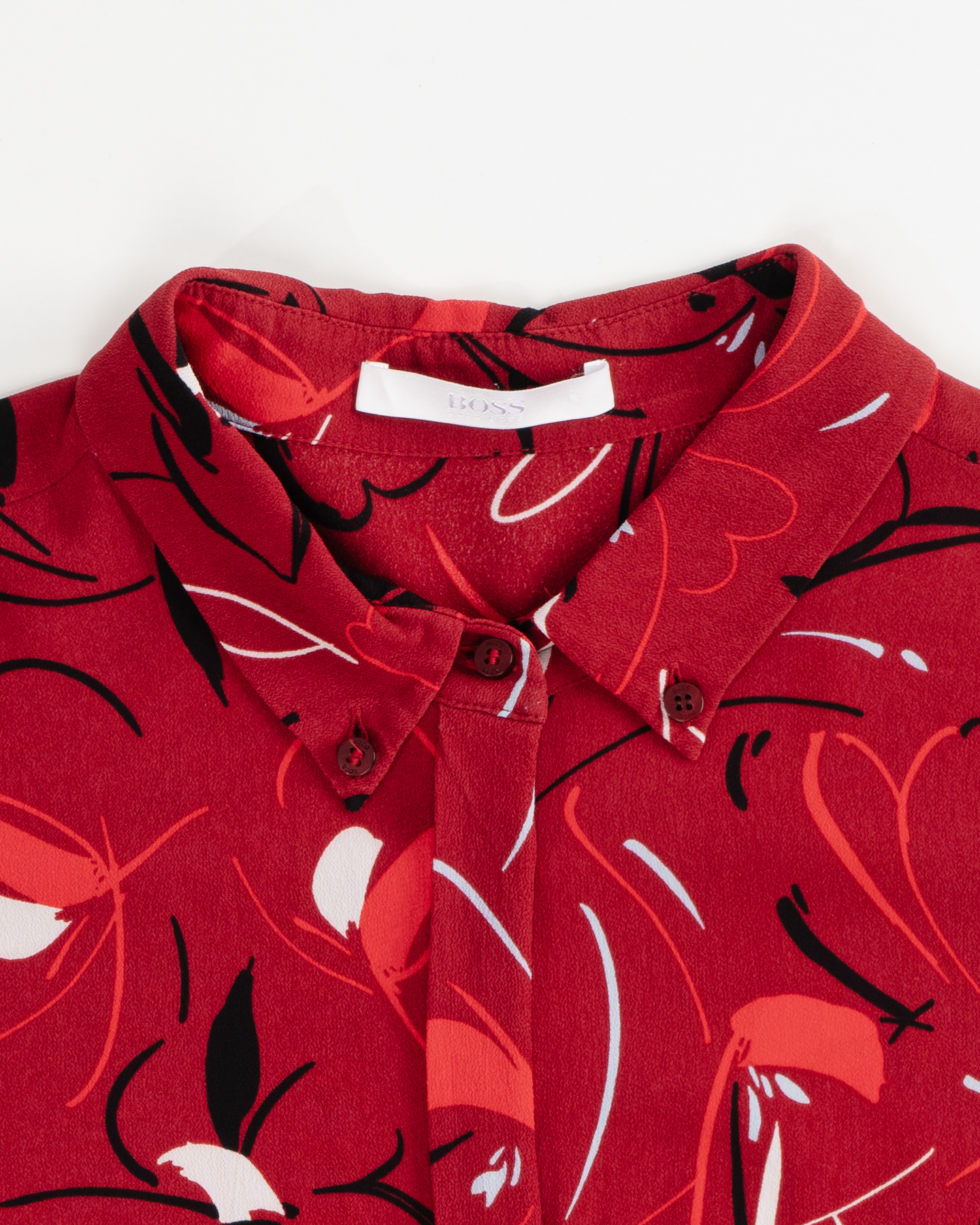 • Рубашка украшена ярким абстрактным принтом в оттенках красного, чёрного и белого.