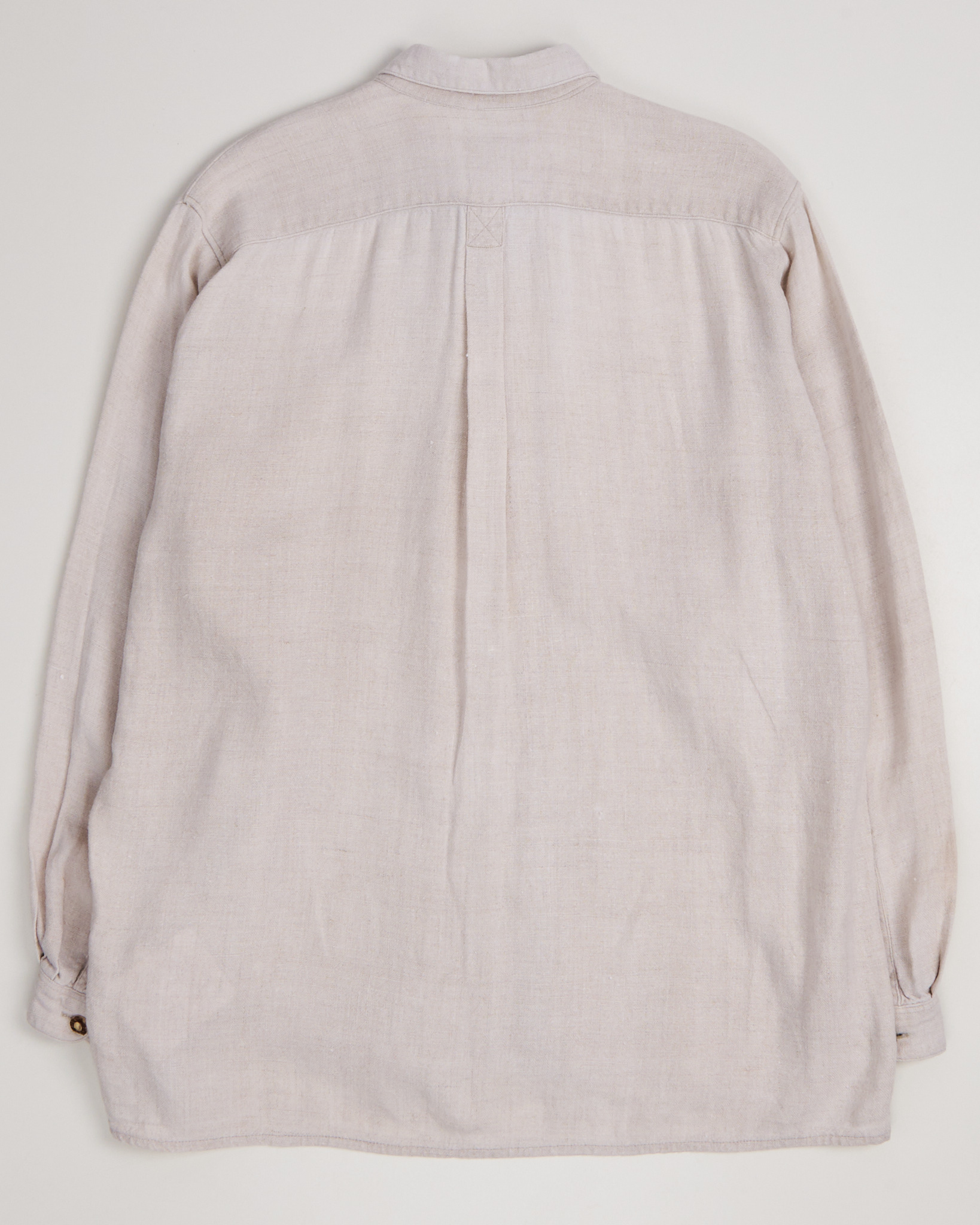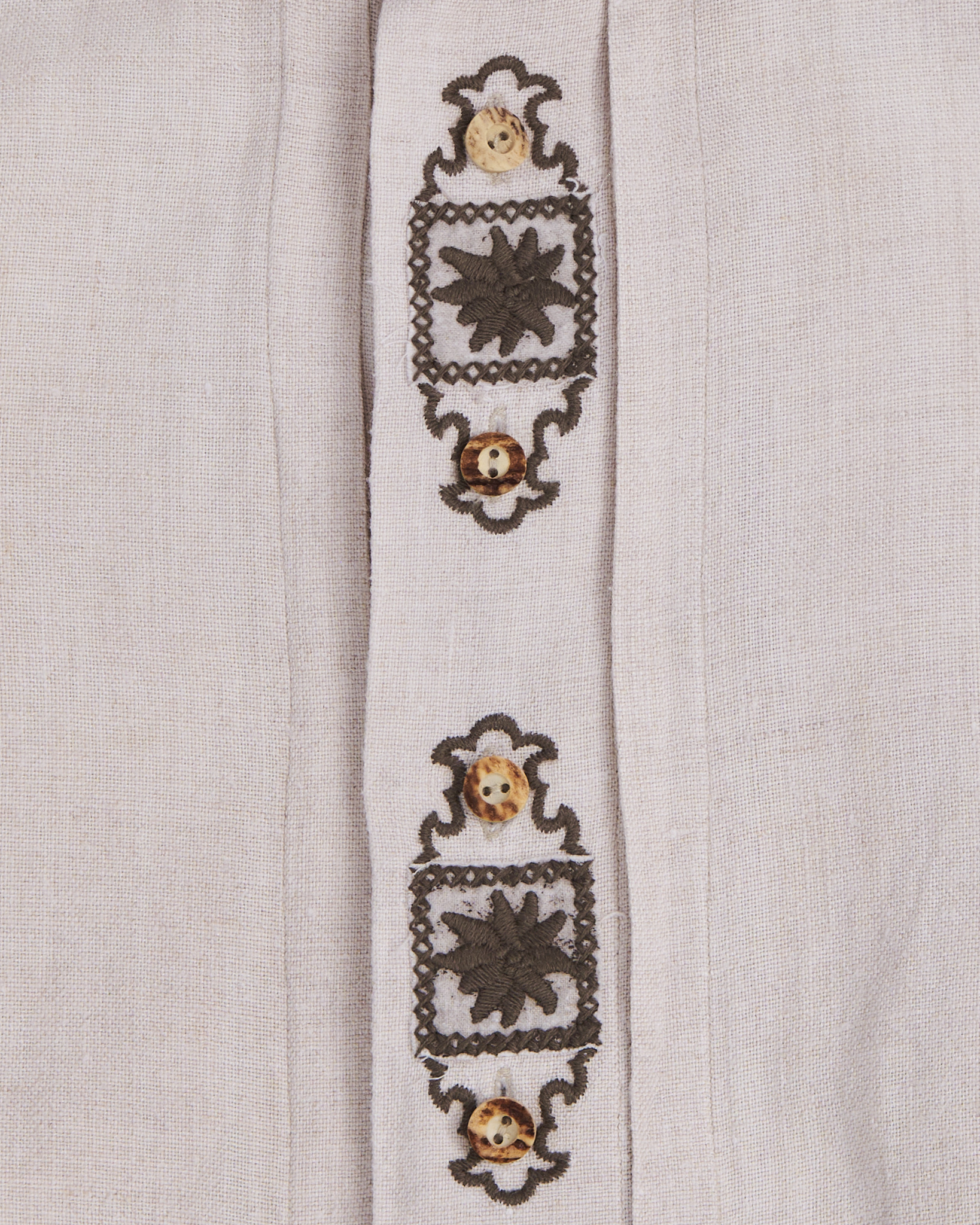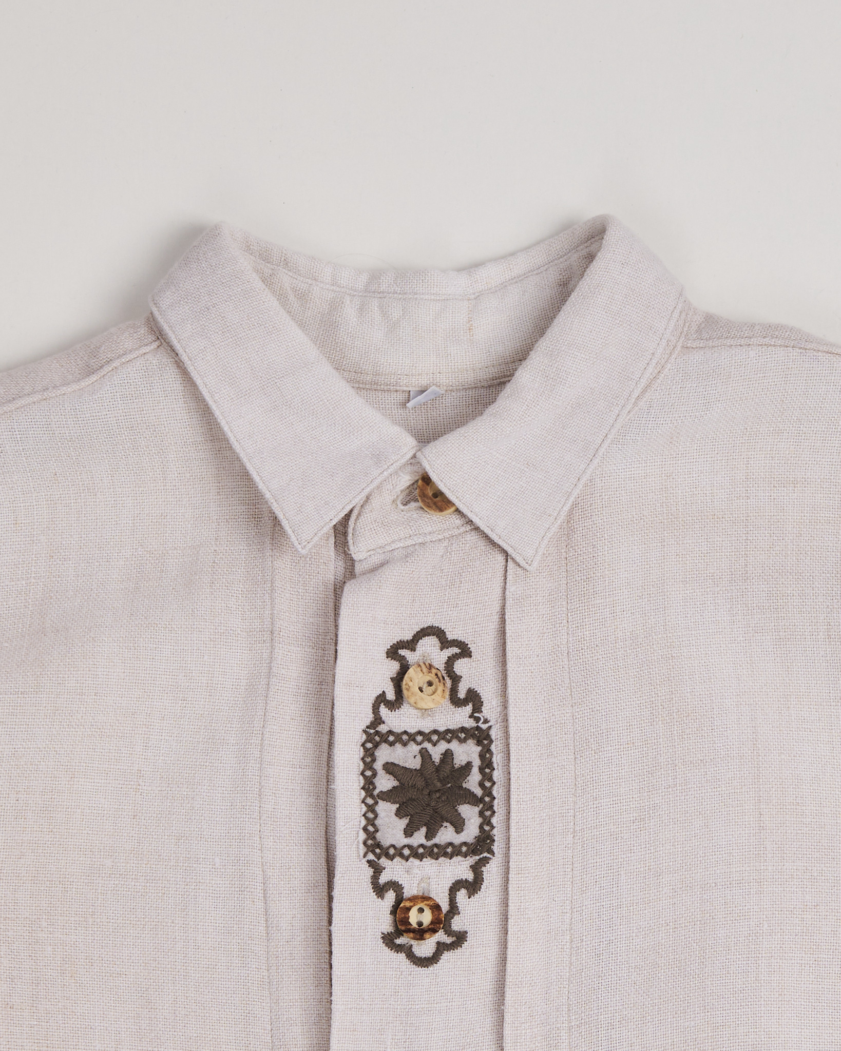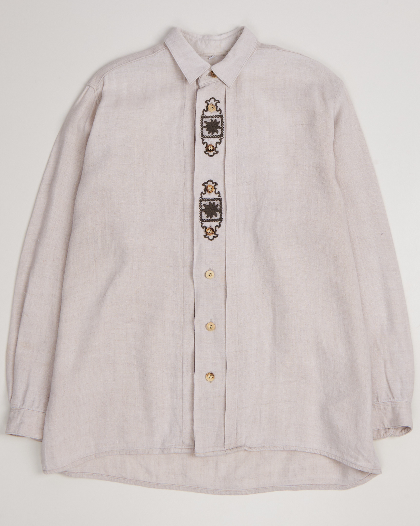 Льняная рубашка с этнической вышивкой в светло-бежевом оттенке. Свободного кроя прямого силуэта, с классическим воротником. Пуговицы натуральные, с тёплым золотистым оттенком. Рукава длинные с манжетами.