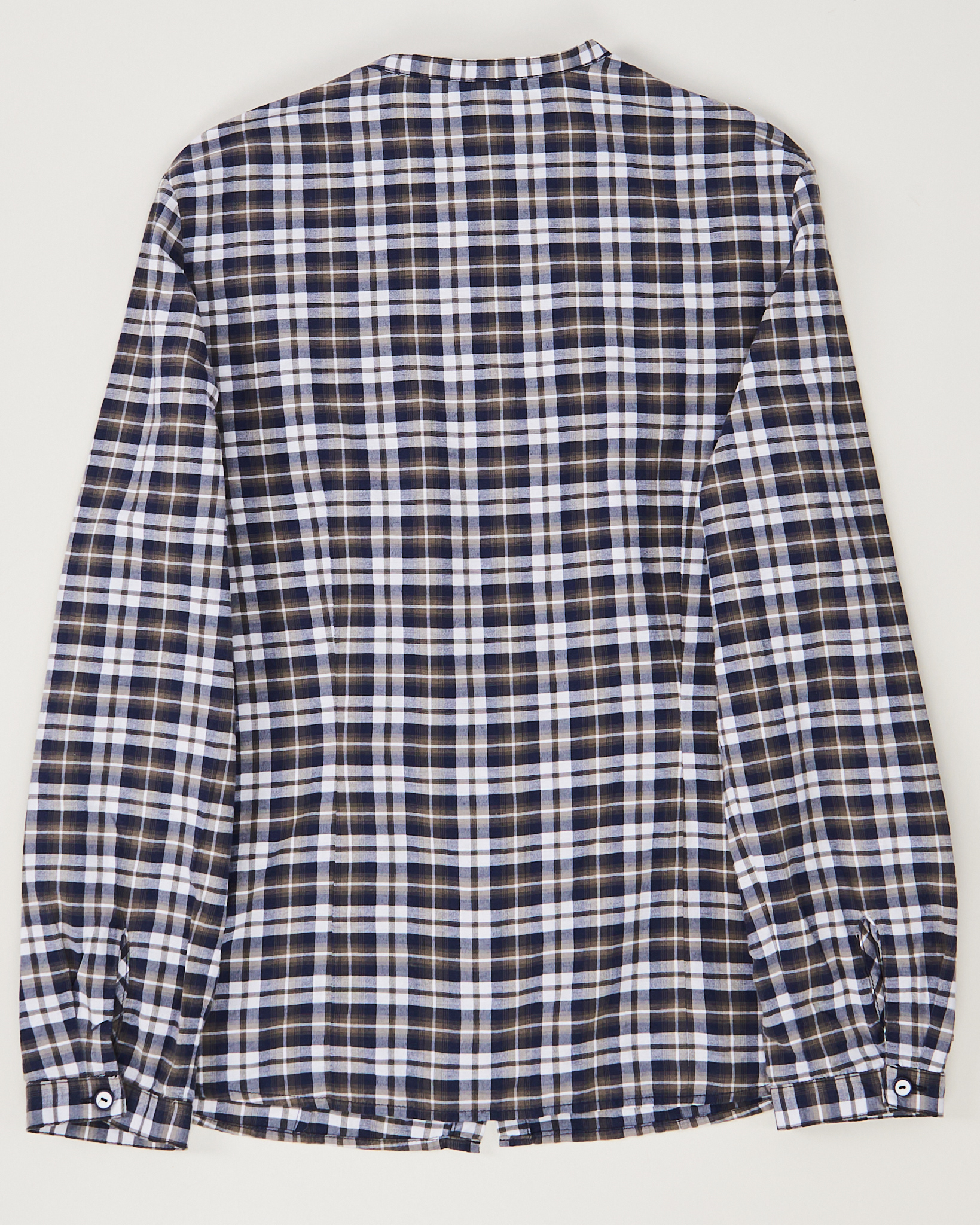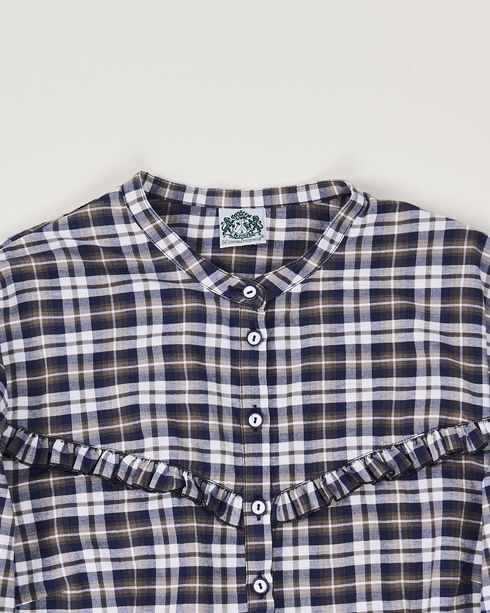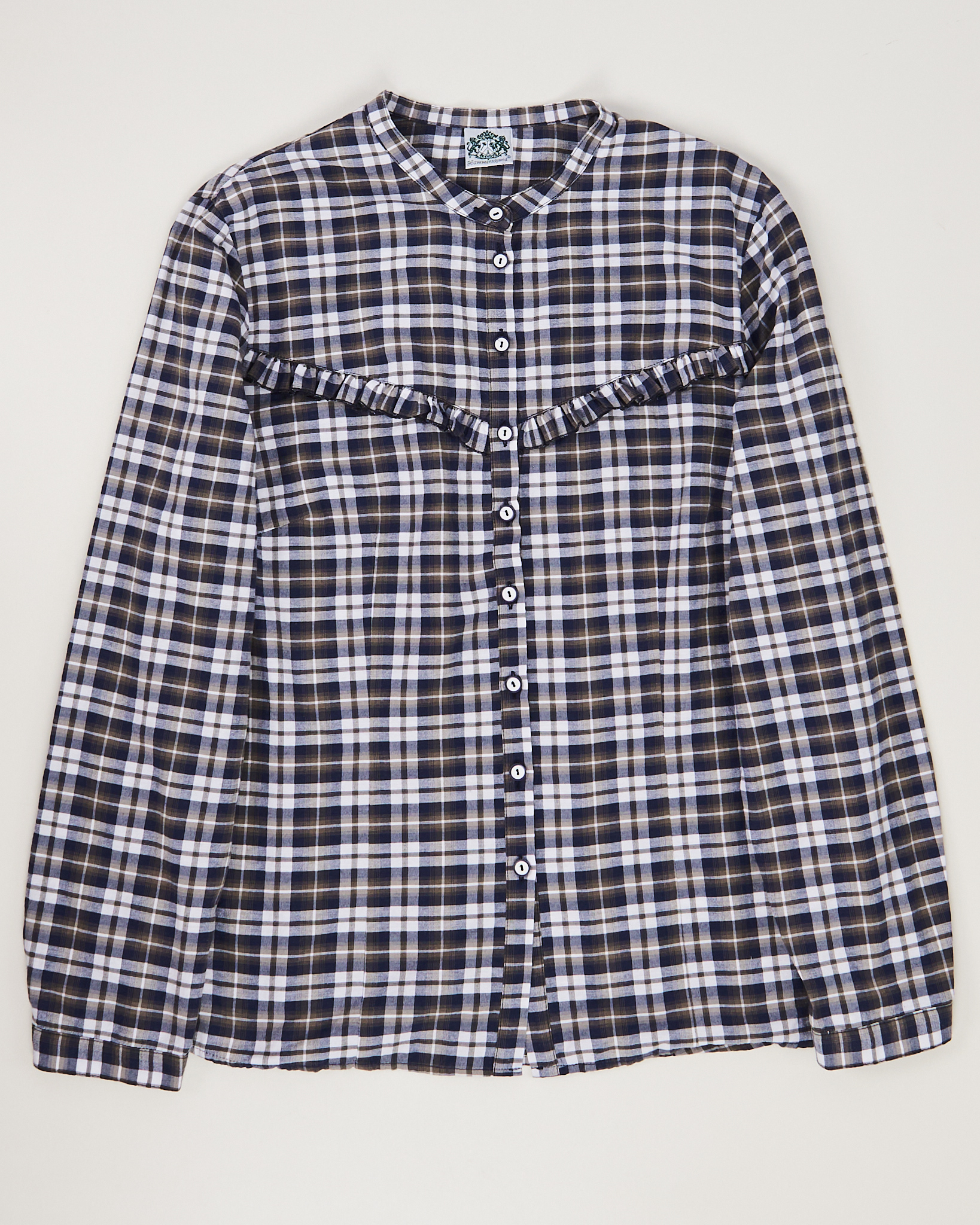 Рубашка из лёгкой хлопковой ткани. Материал мягкий, тактильно приятный. Посадка прямая, комфортная. Акцентом в виде декоративной рюши по линии груди. Классическая планка с пуговицами и аккуратный ворот без стойки.