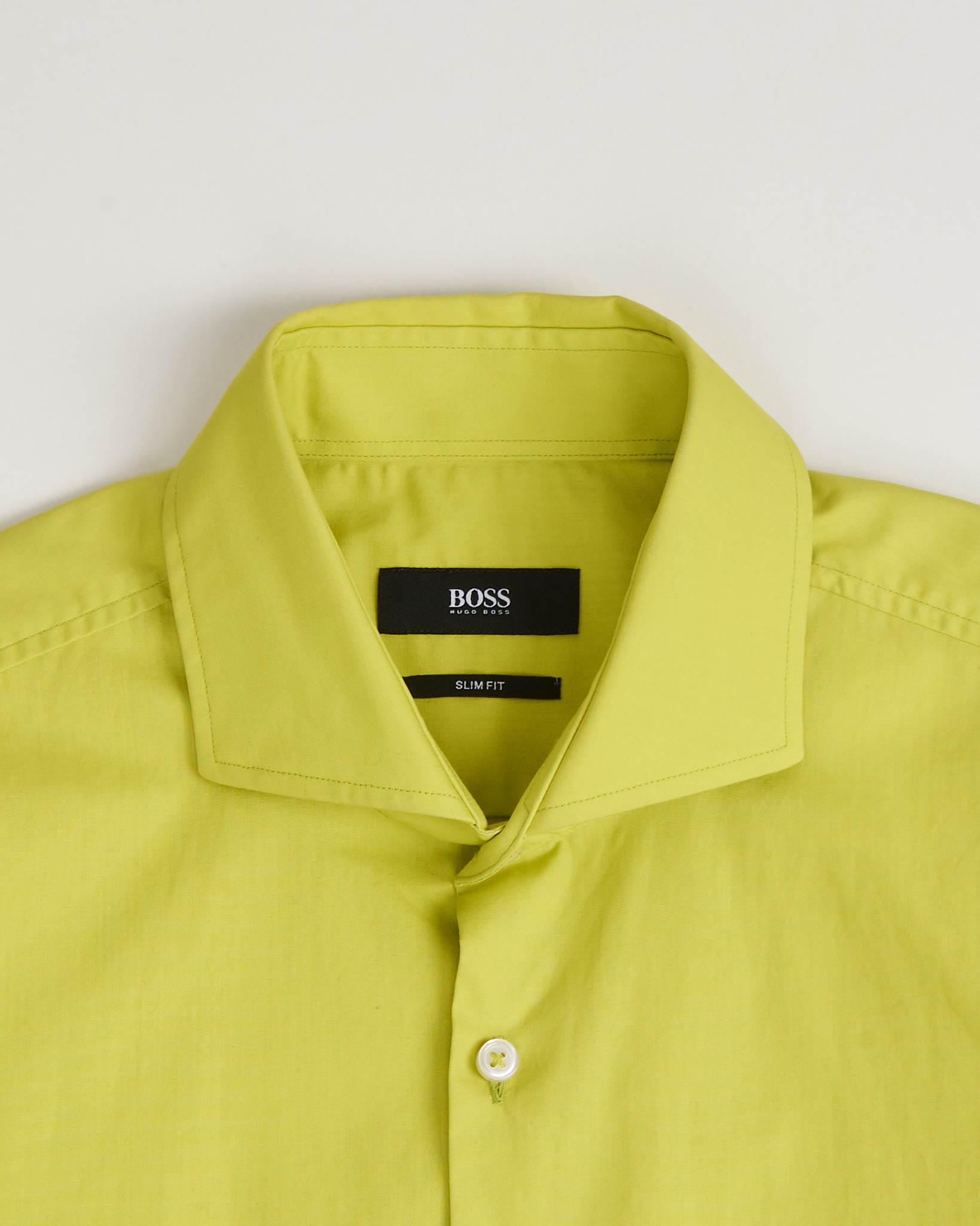 Рубашка от Hugo Boss в ярком лаймовом оттенке. Рубашка из гладкого хлопка, материал лёгкий и приятный на ощупь. Посадка slim fit, силуэт подчёркивает линию плеч и корпуса. Классический воротник, застёжка на пуговицы, аккуратные манжеты с двойной фиксацией.