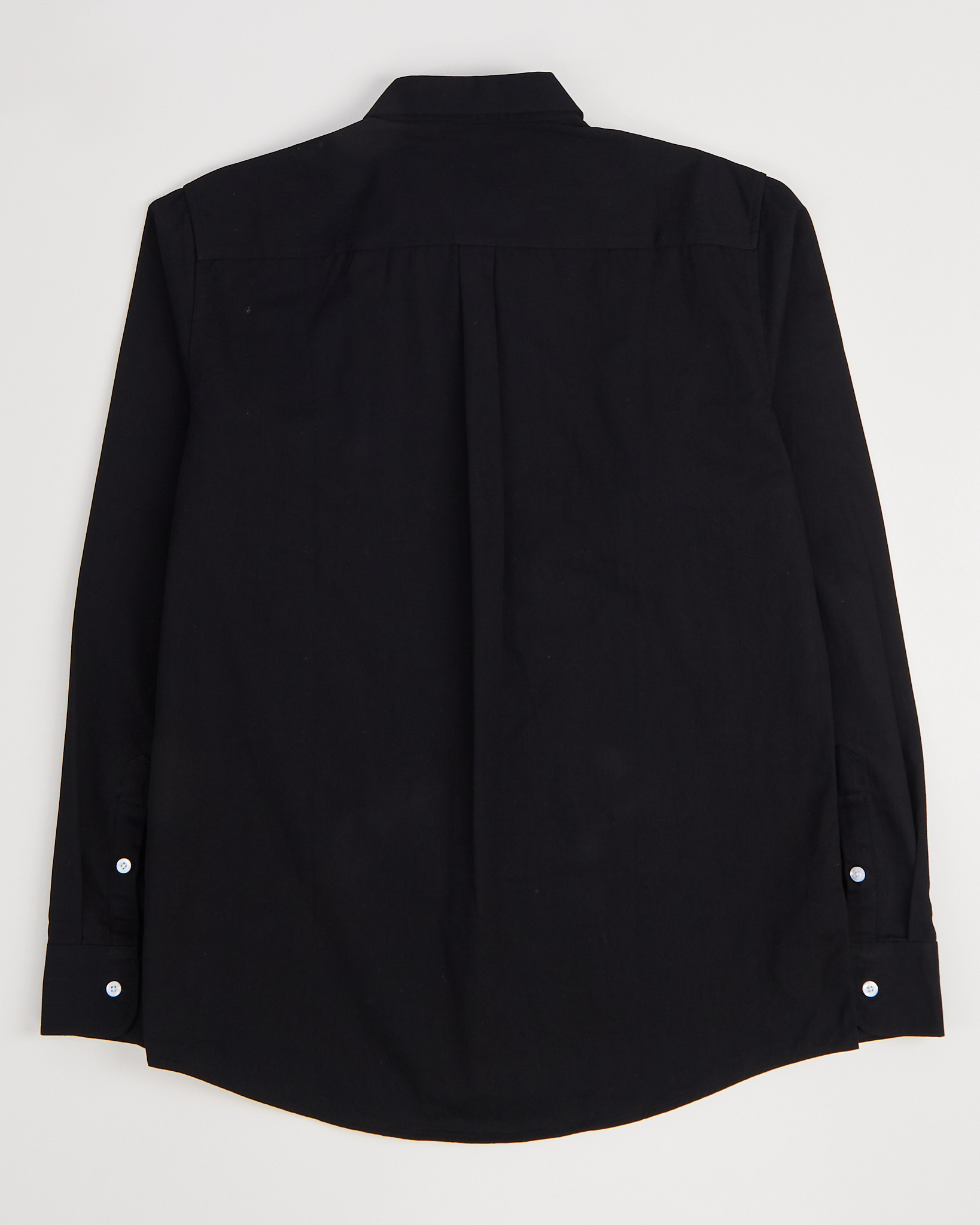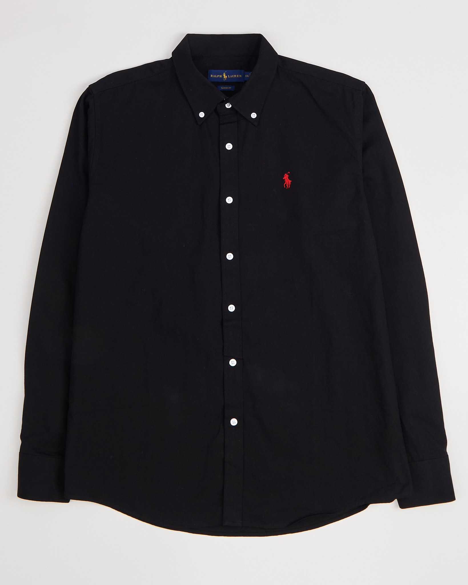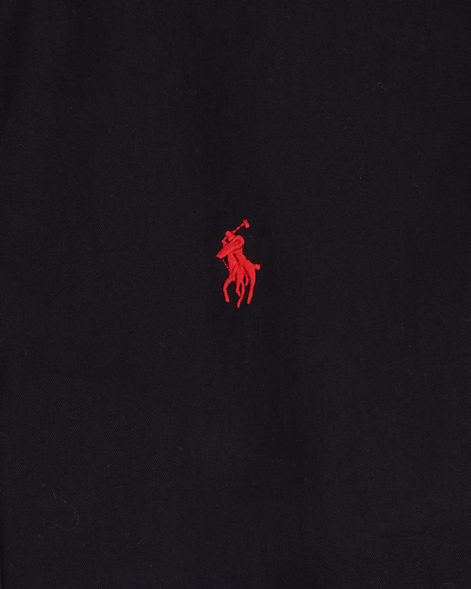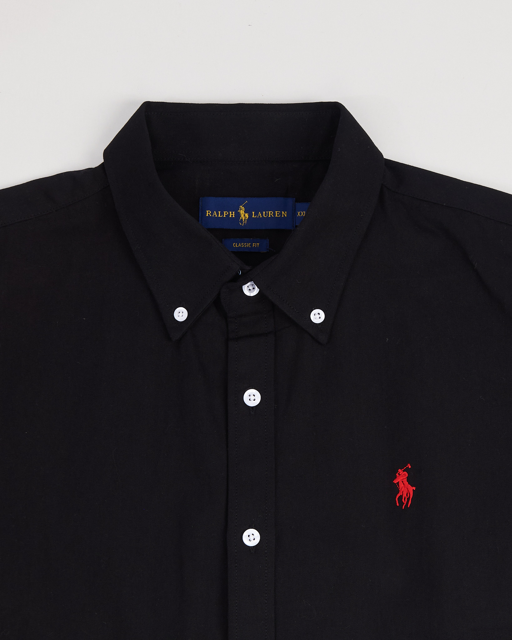 Рубашка из хлопка Ralph Lauren черного цвета. Посадка classic fit. Свободный силуэт. Белые контрастные пуговицы. Воротник button-down с фиксацией на пуговицы. Аккуратная и ровна планка. Манжеты с регулируемой застежкой.