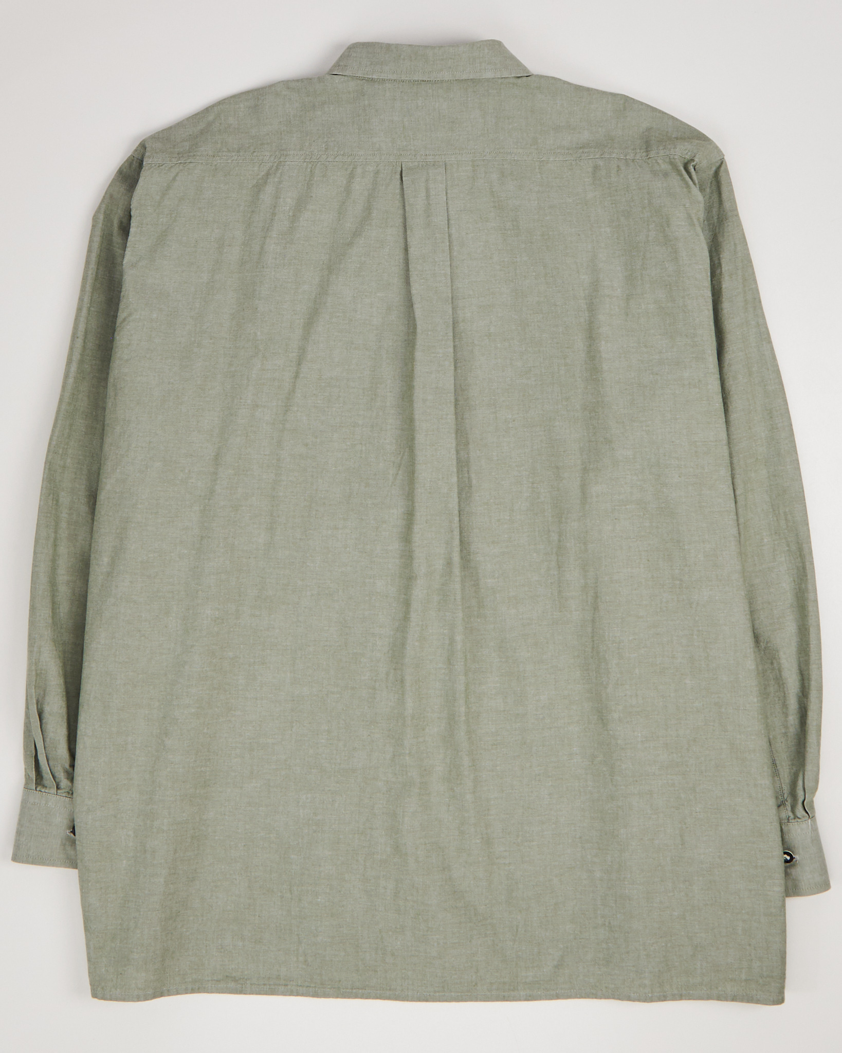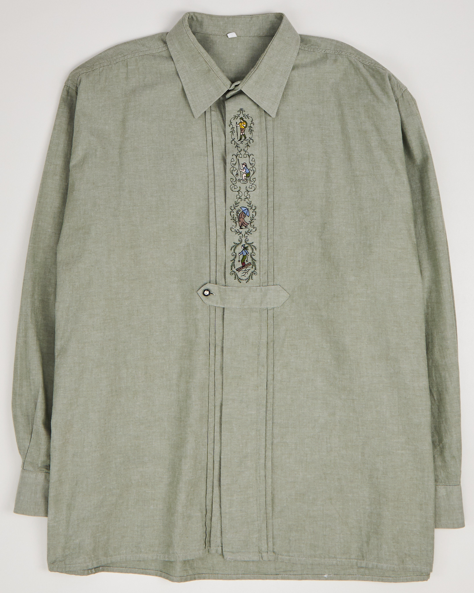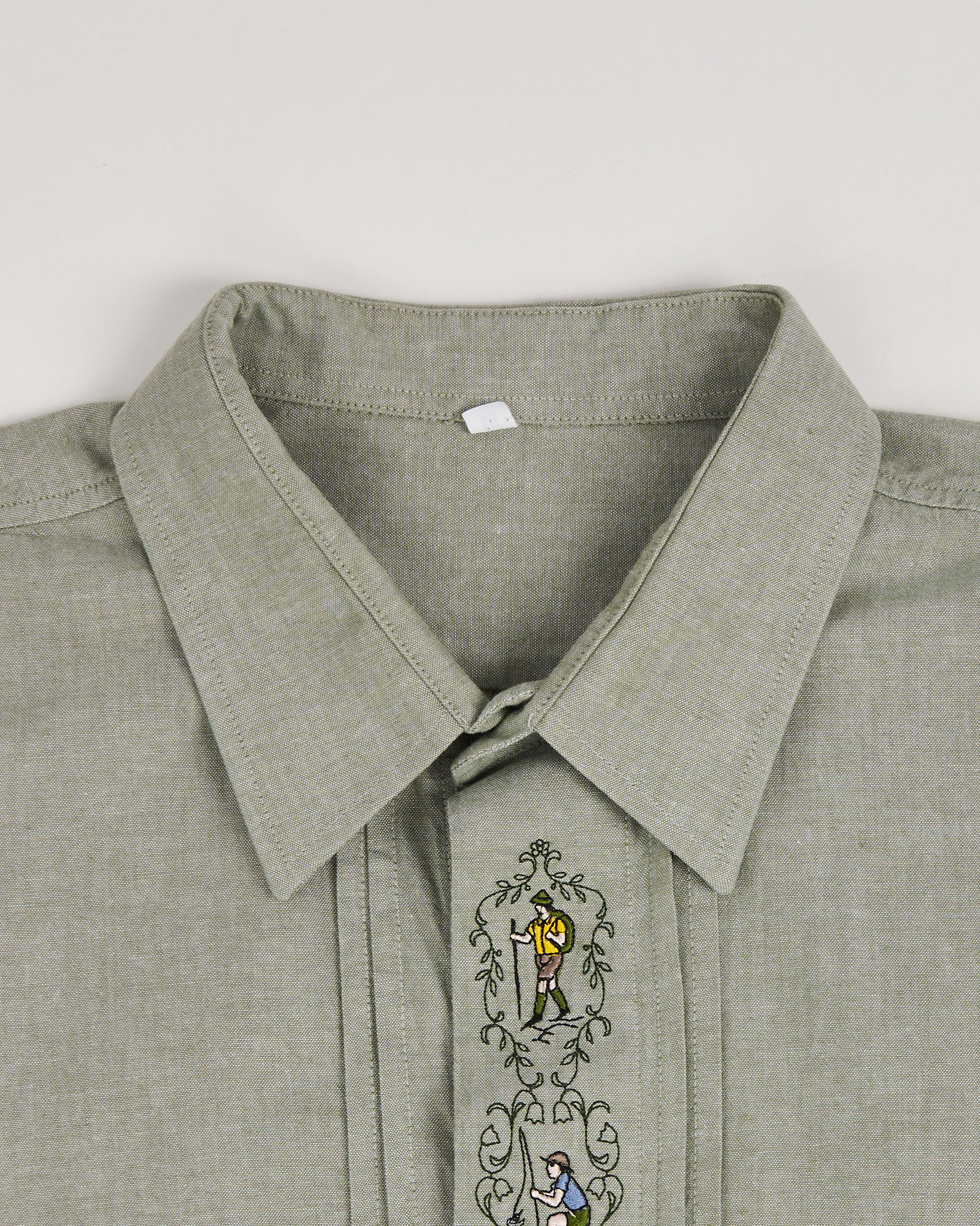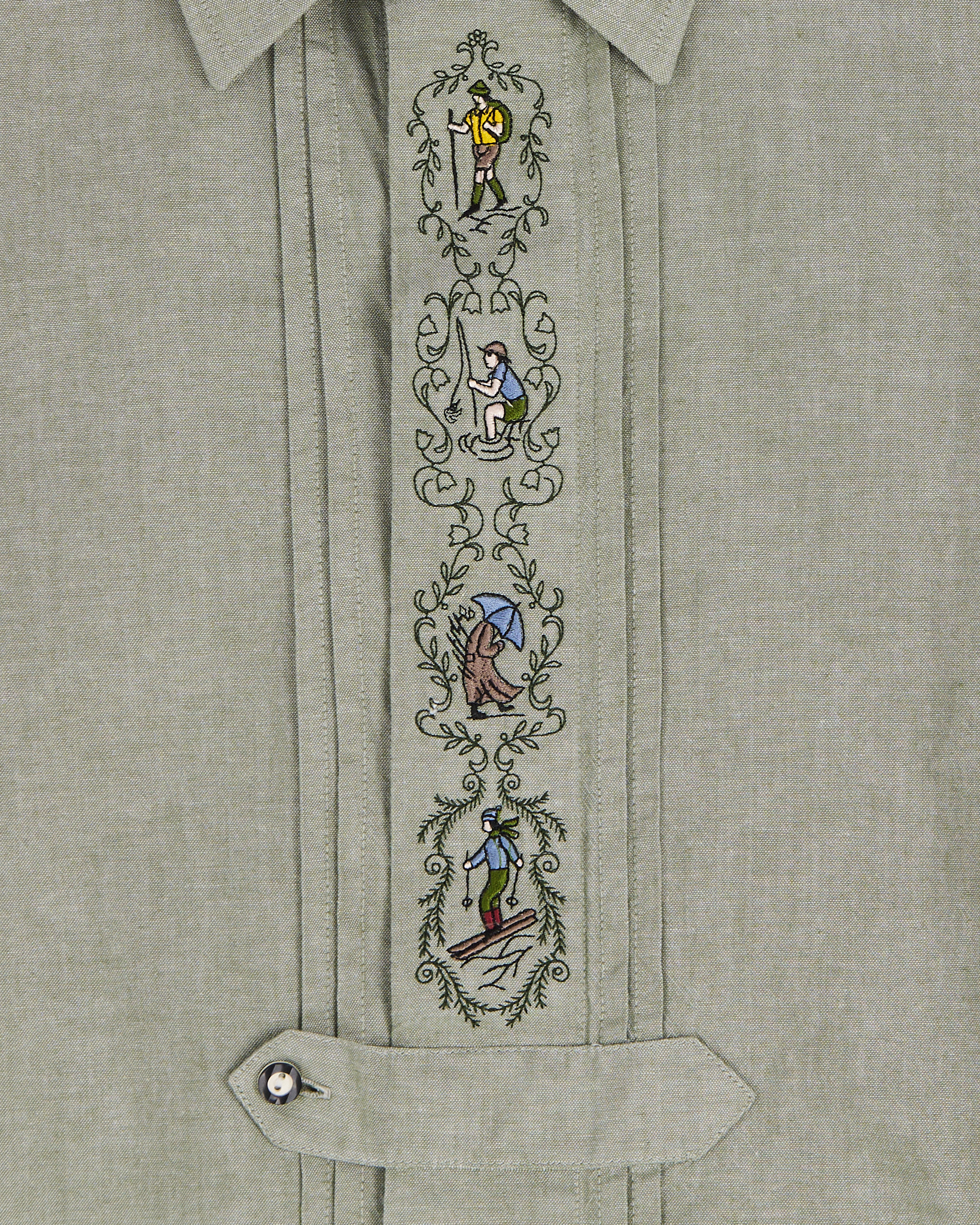 Рубашка из плотного хлопка в приглушенном оливково-зеленом оттенке. Особенность модели - вертикальная композиция, где миниатюрные фигурки людей детально передают атмосферу активного отдыха в разные сезоны.