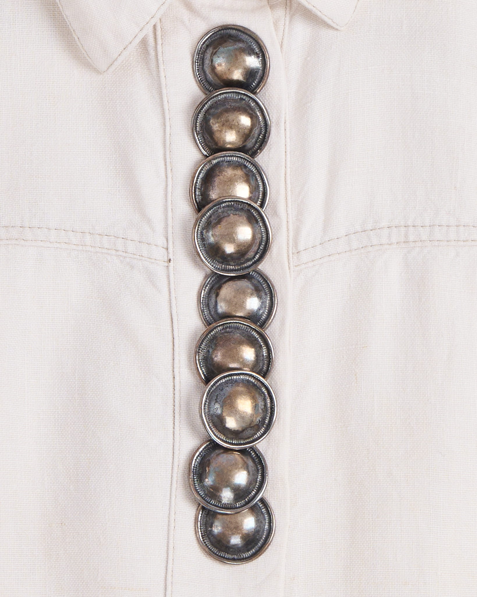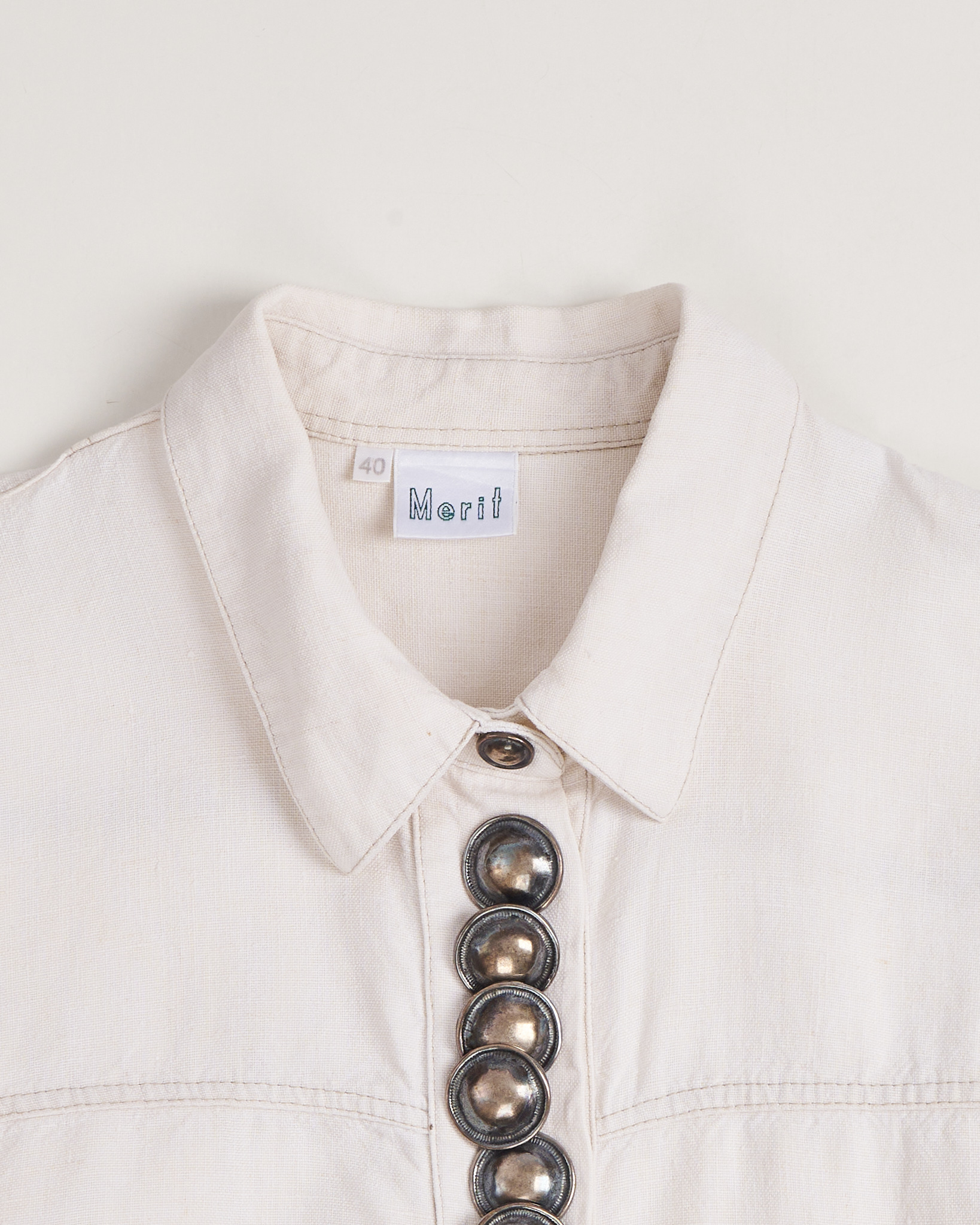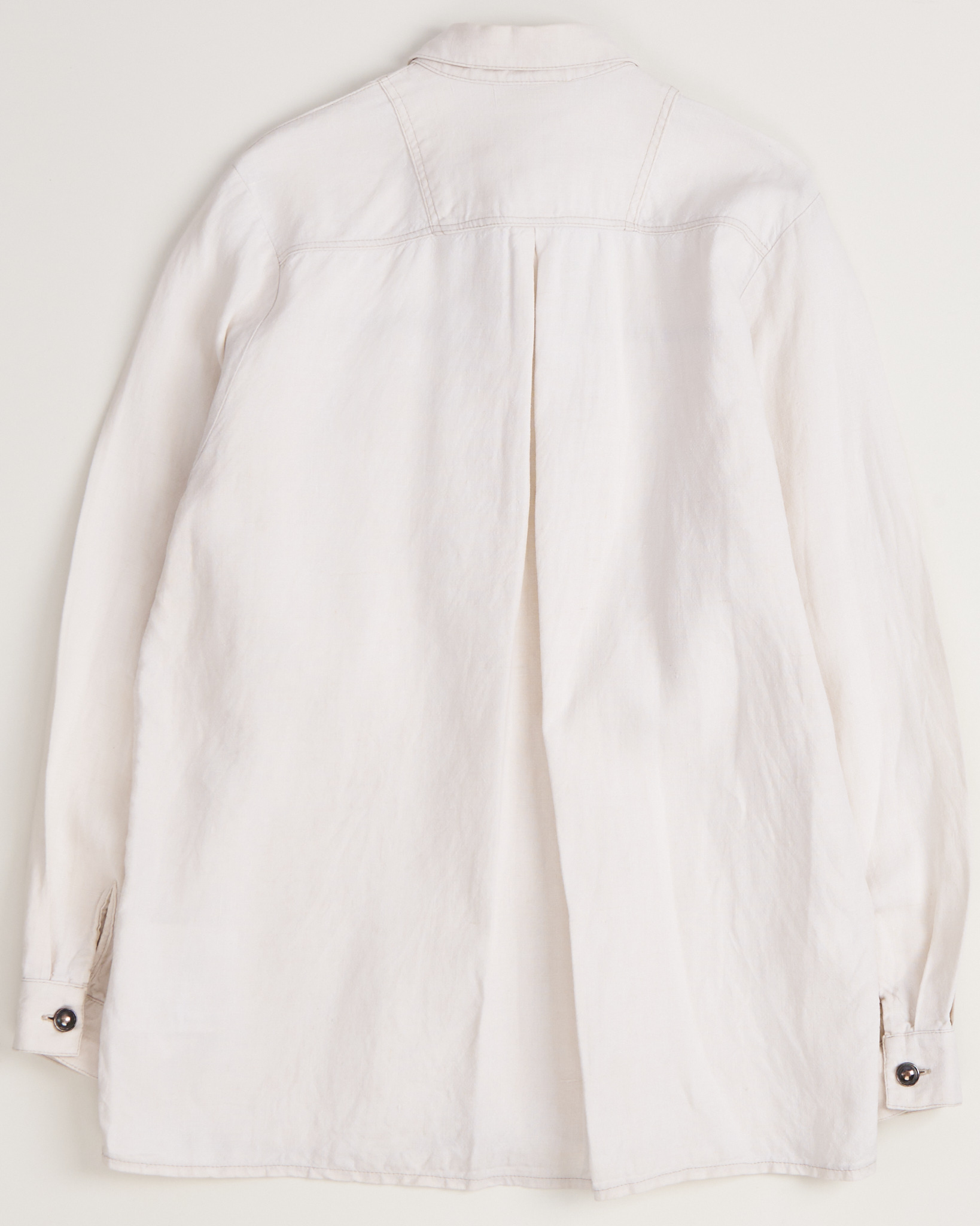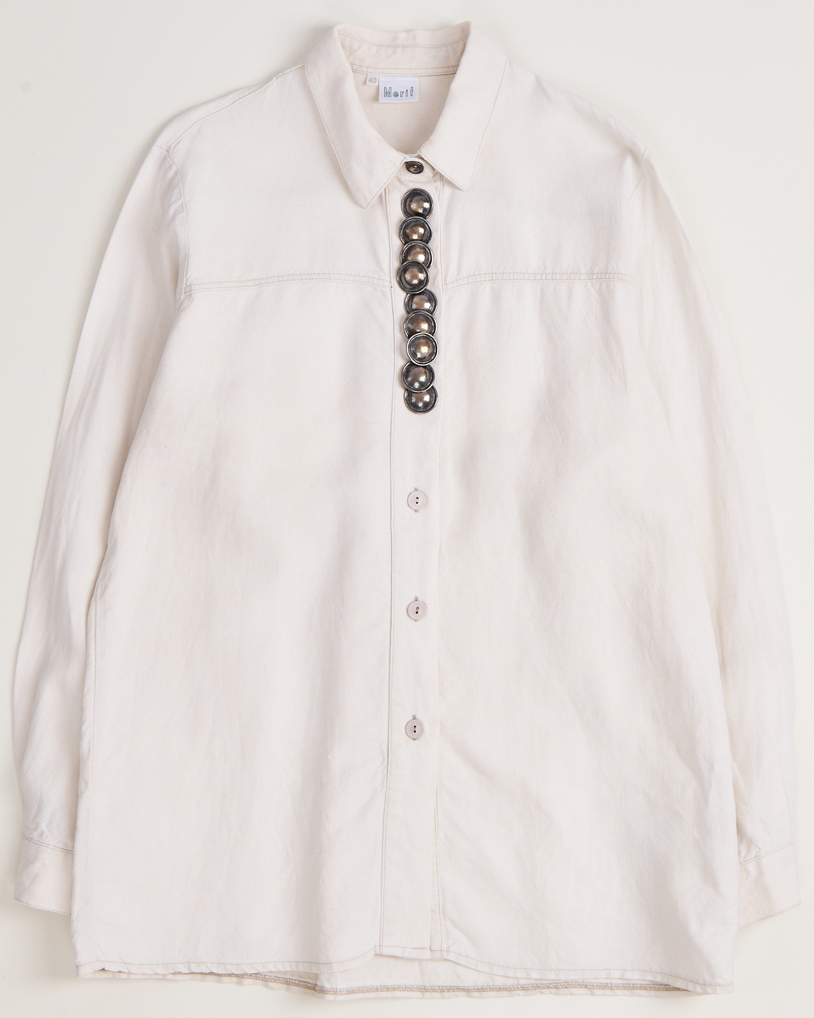 Рубашка из льна от Meritt молочного оттенка. Посадка прямая, свободная, декоративная вертикальная линия из крупных металлических пуговиц.