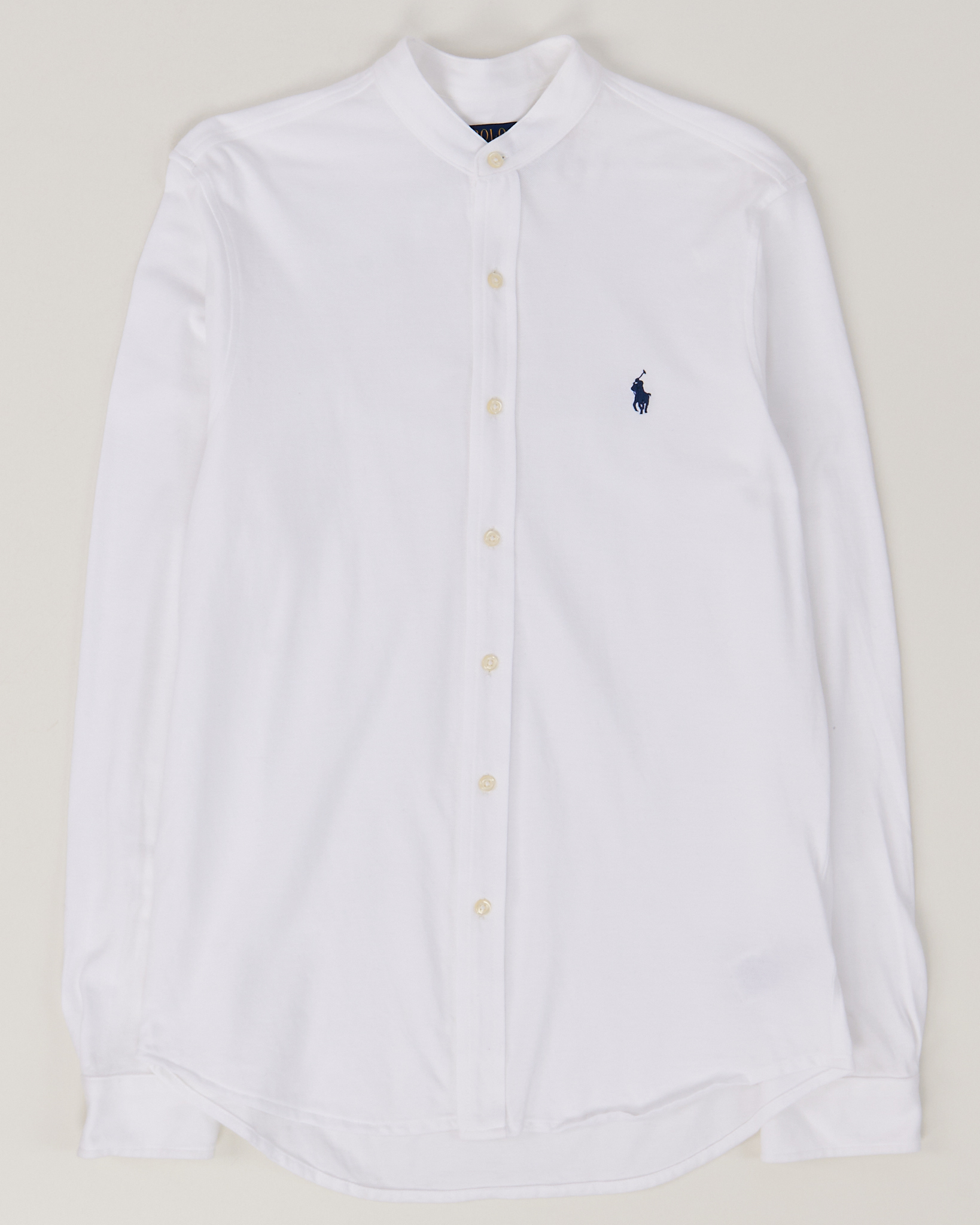 Белая рубашка Polo Ralph Lauren из плотного хлопка. Материал гладкий и приятный на ощупь, посадка прямая, аккуратный силуэт. Воротник-стойка, контрастный вышитый всадник на груди подчёркивает происхождение вещи.
