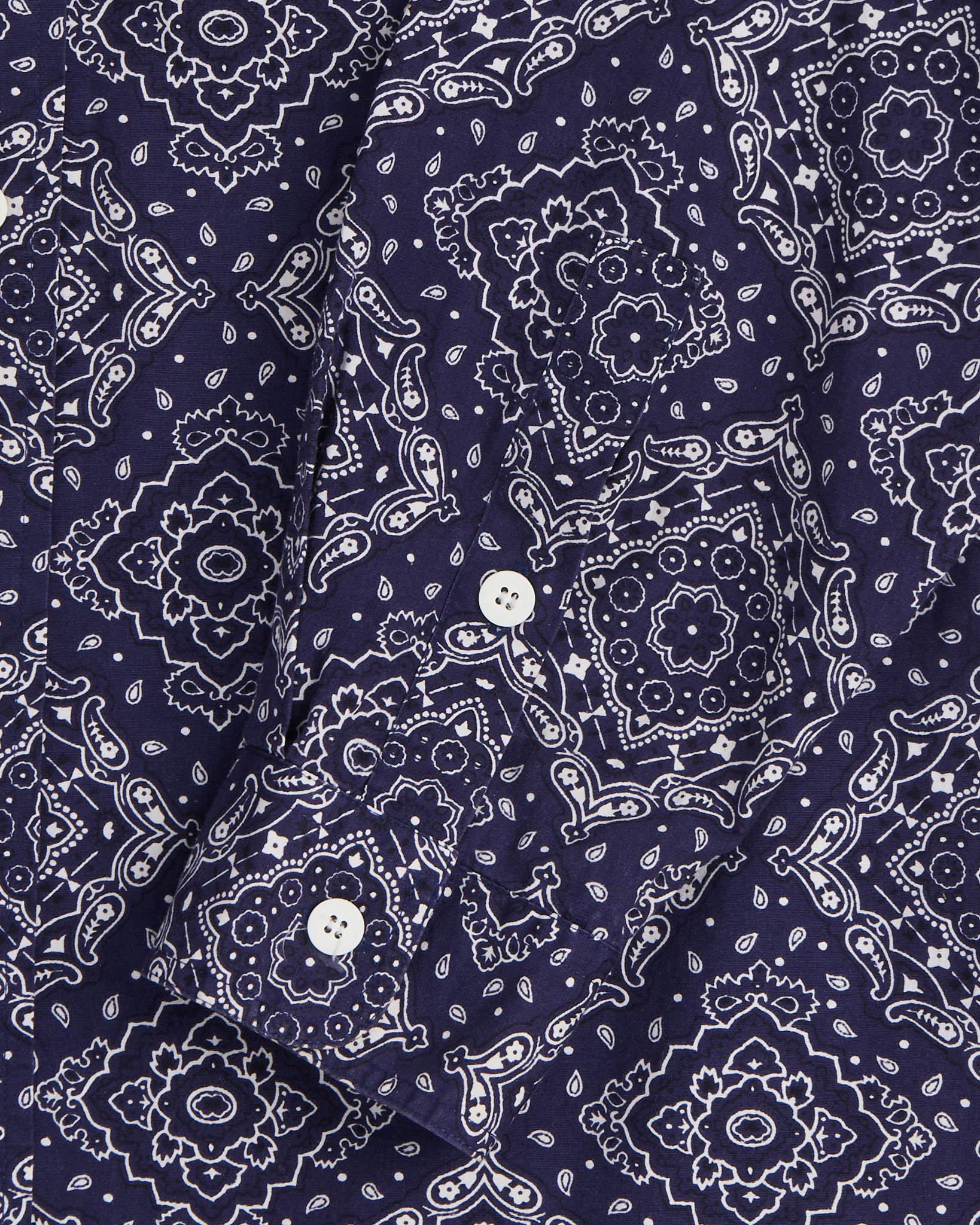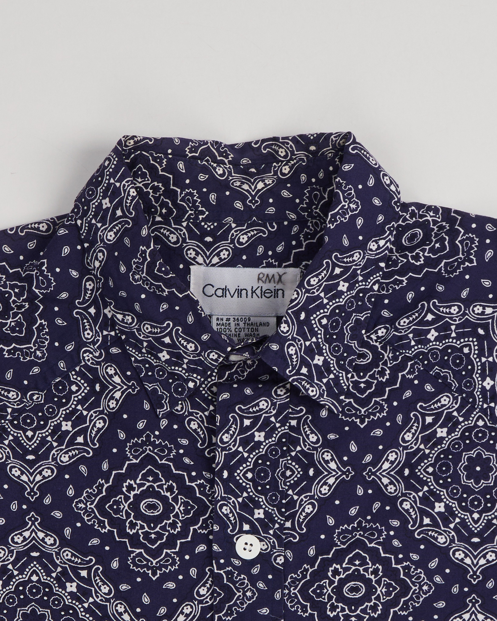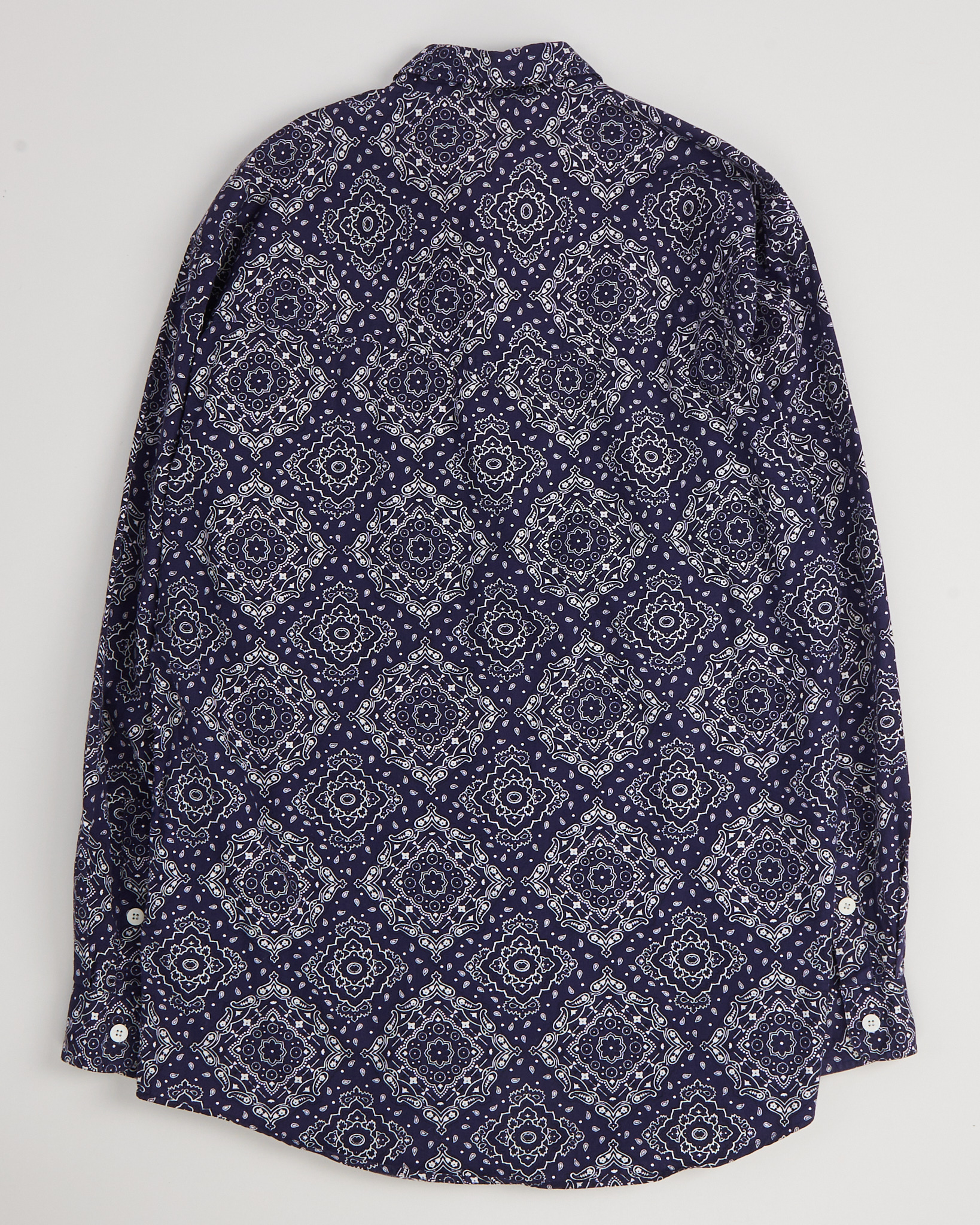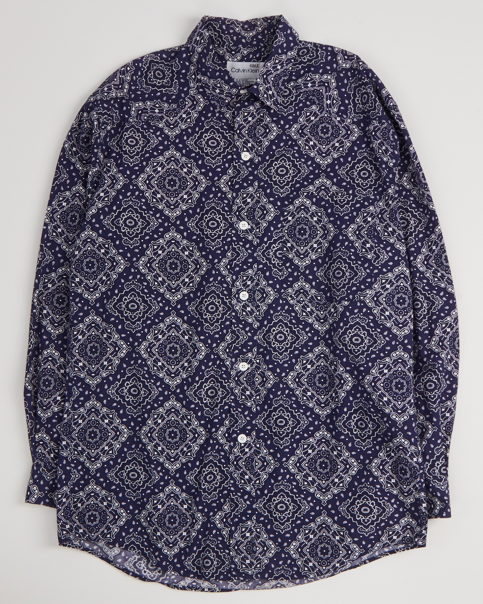 Классическая рубашка Calvin Klein прямого кроя с длинными рукавами. Темно-синий фон в сочетании с белым этническим орнаментом. Отложной воротник и манжеты на пуговицах.