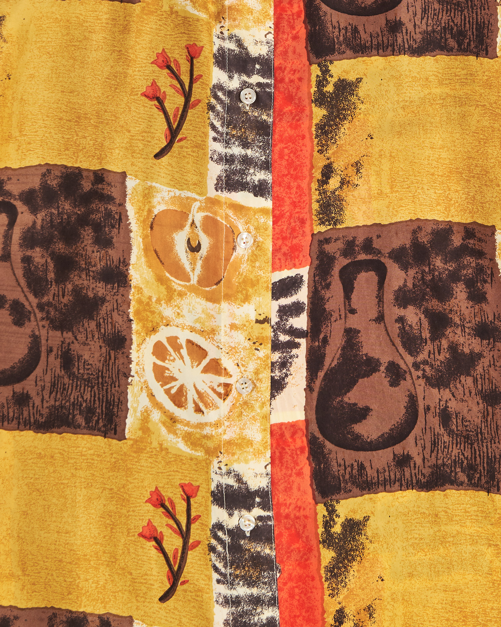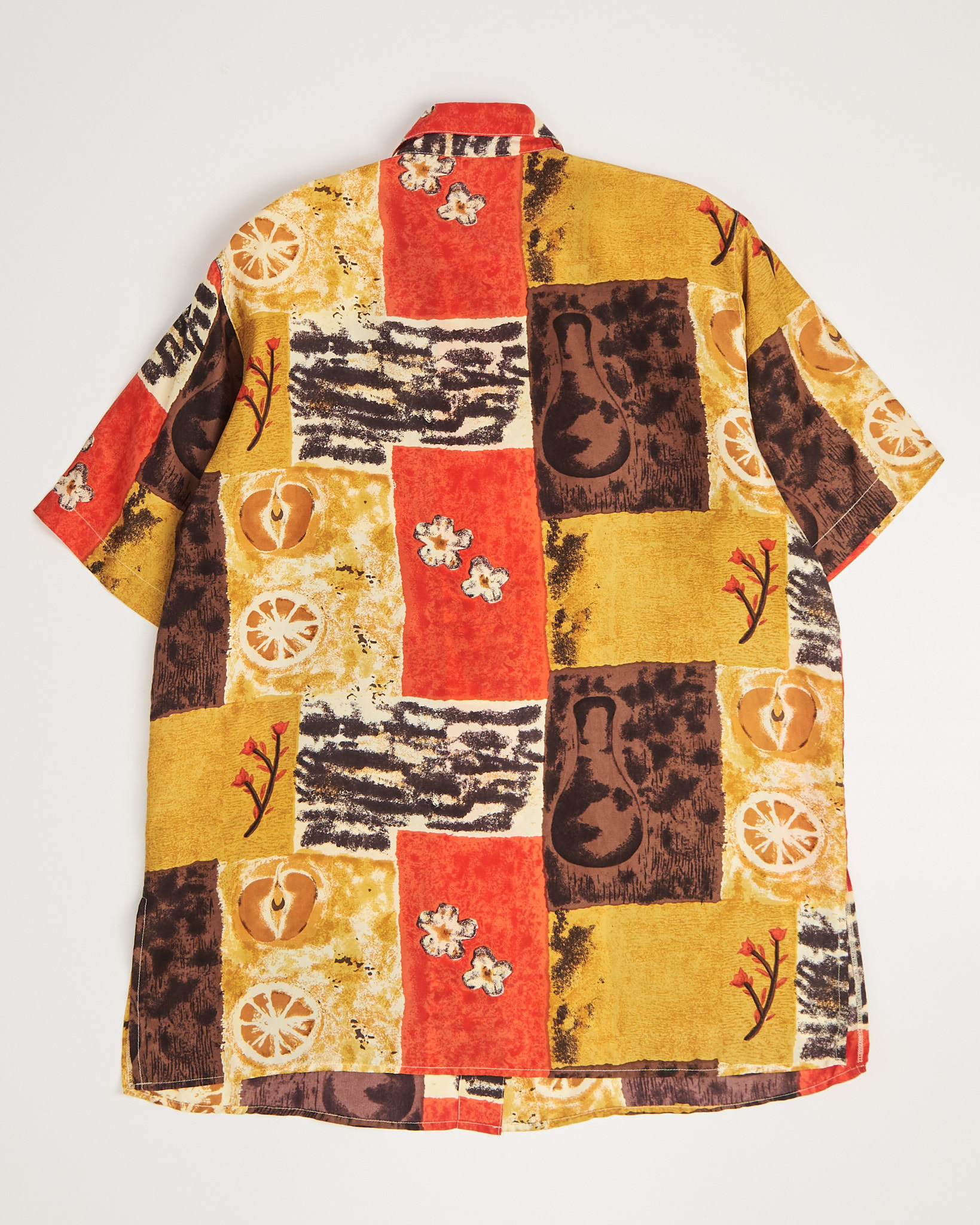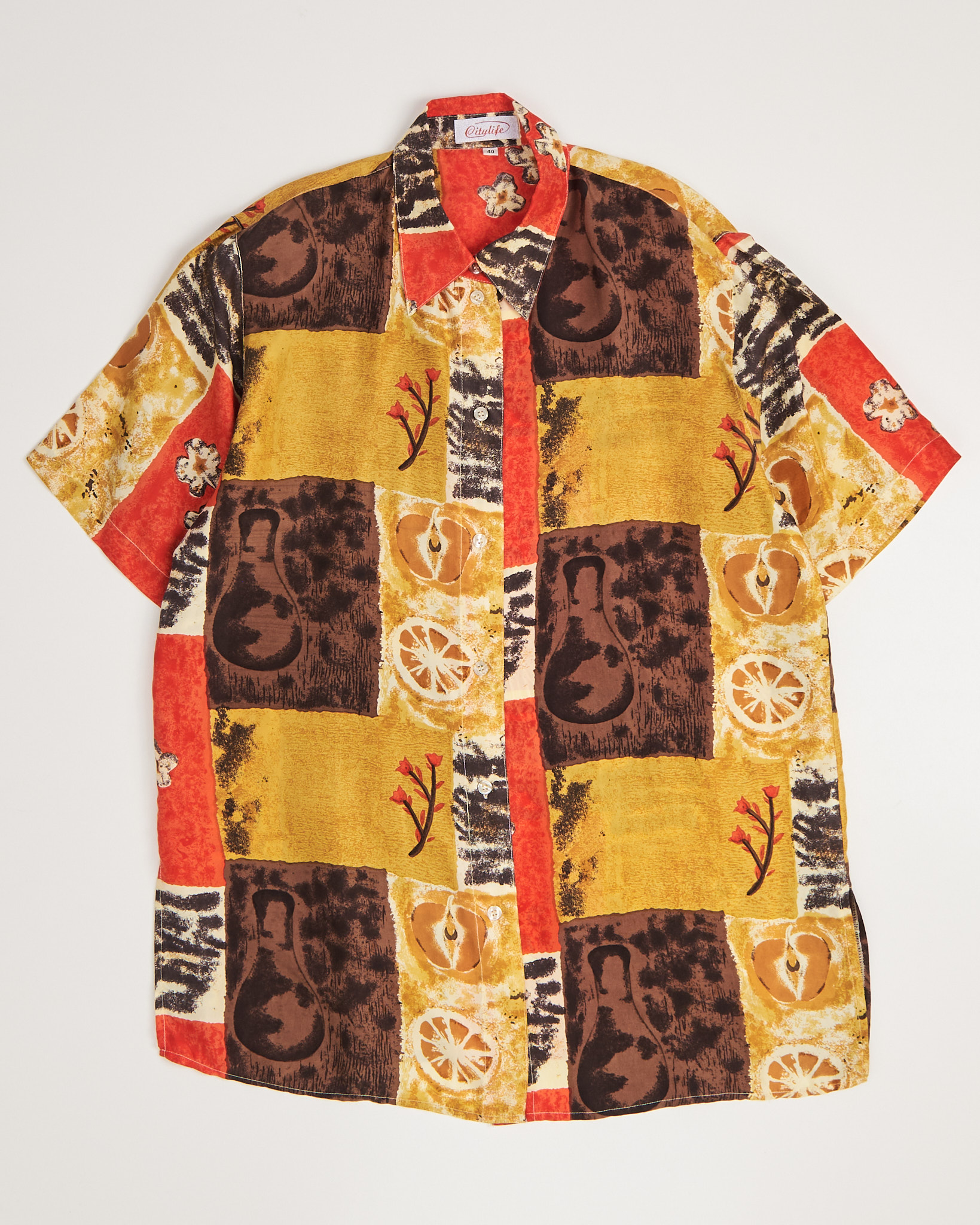 Рубашка из шелка Citylife с принтом. Свободная посадка. Прямой силуэт. Классический воротник. Застежка на пуговицы. Аккуратные короткие рукава. Ткань оформлена крупным графичным принтом с фруктовыми и абстрактными элементами в коричневом и красном цвете.