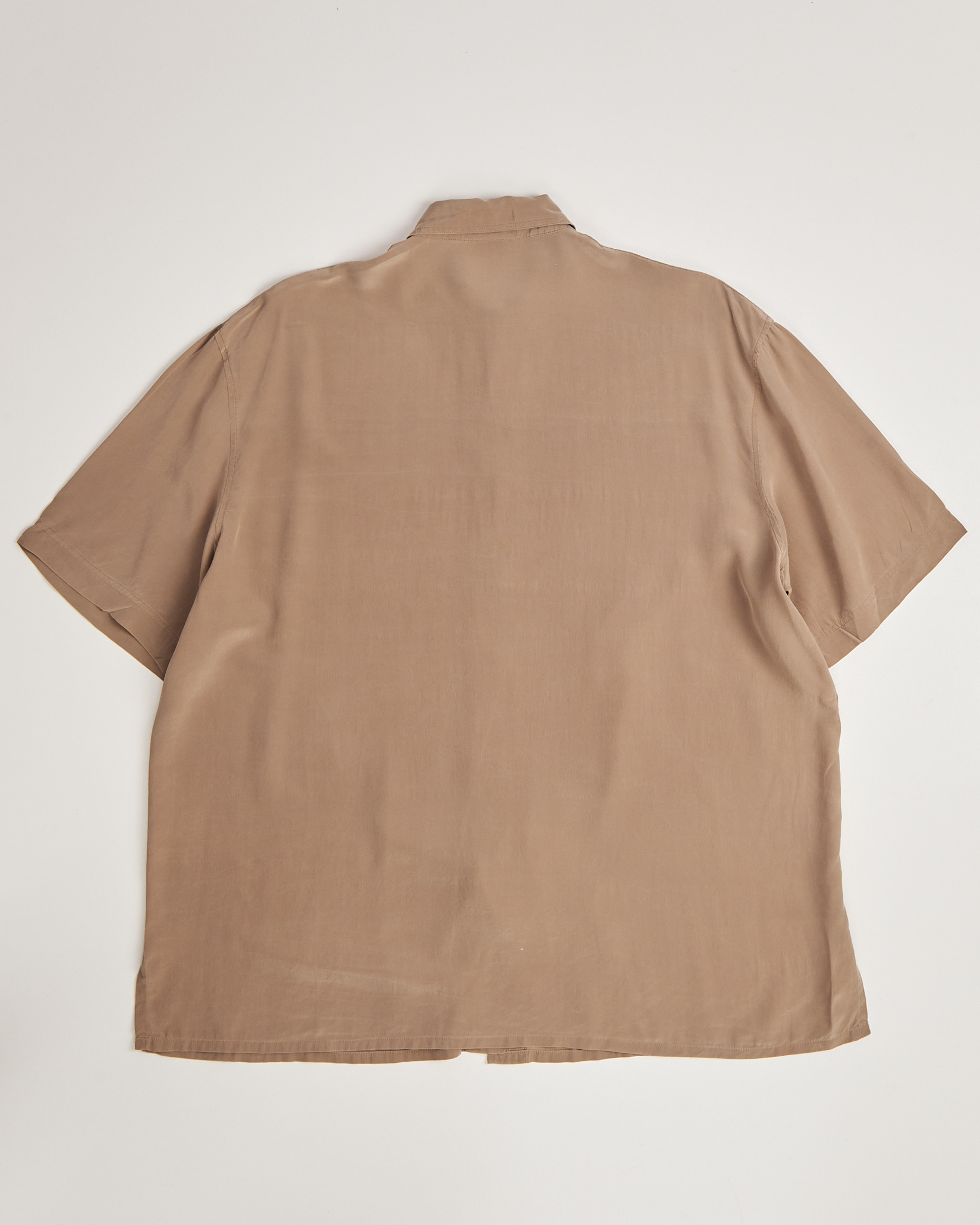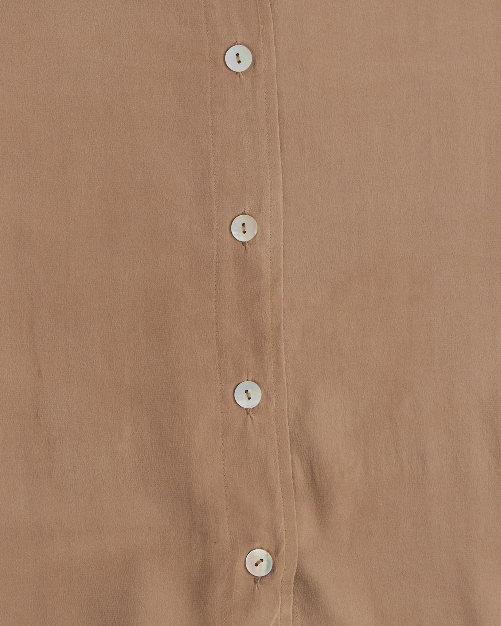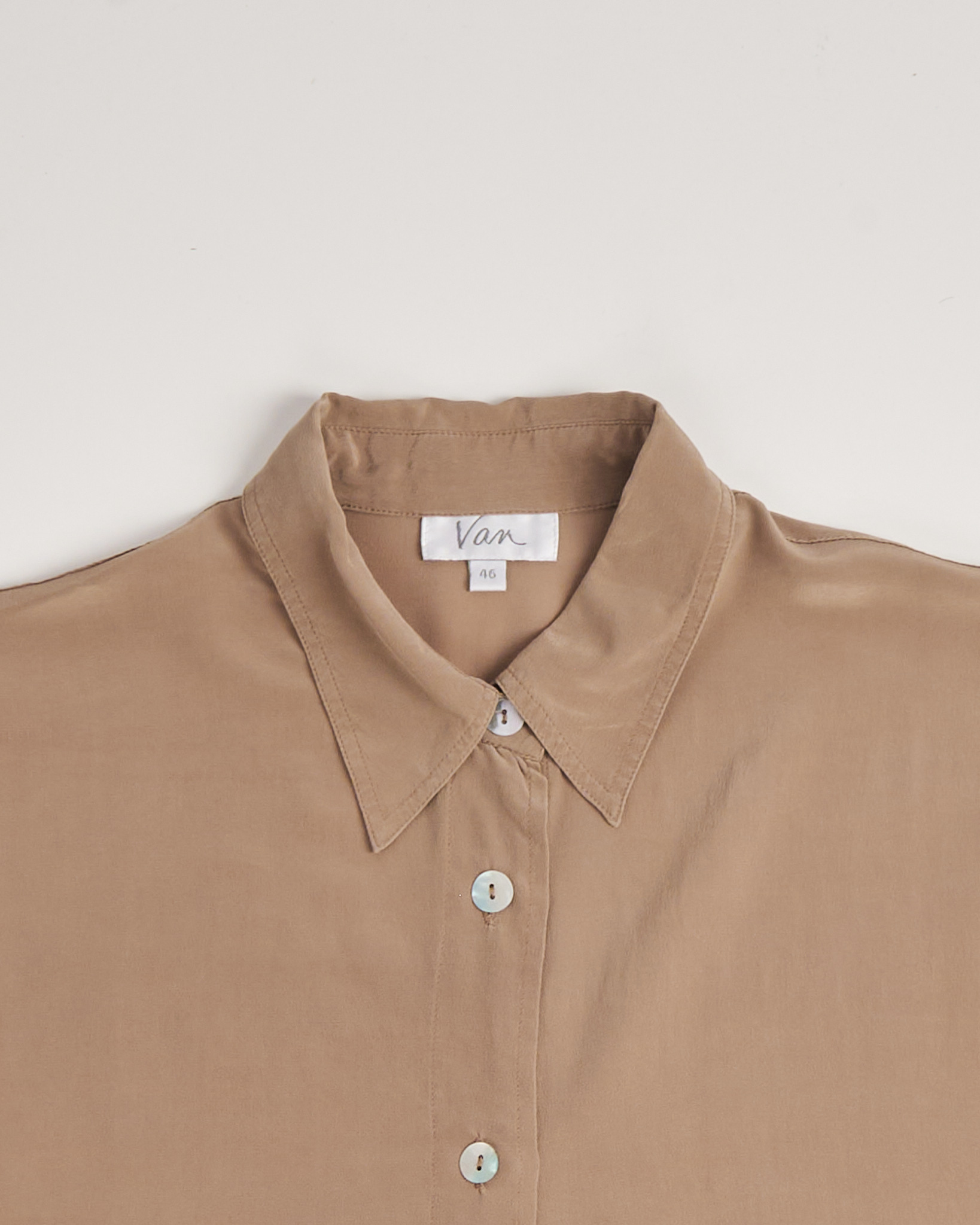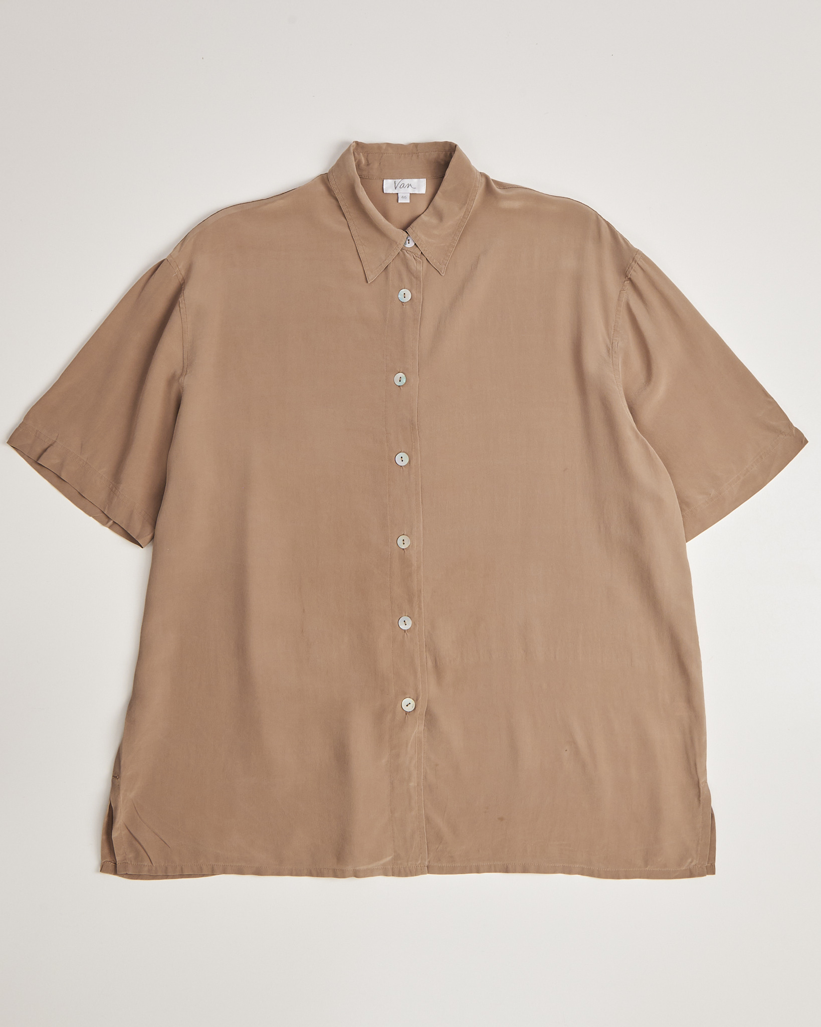 Рубашка из шелка Van светло - коричневого цвета с матовым блеском. Свободная посадка. Короткий рукав с мягким объемом. Застежка на светлые пуговицы по всей длине. Воротник классической формы. По бокам небольшие разрезы.