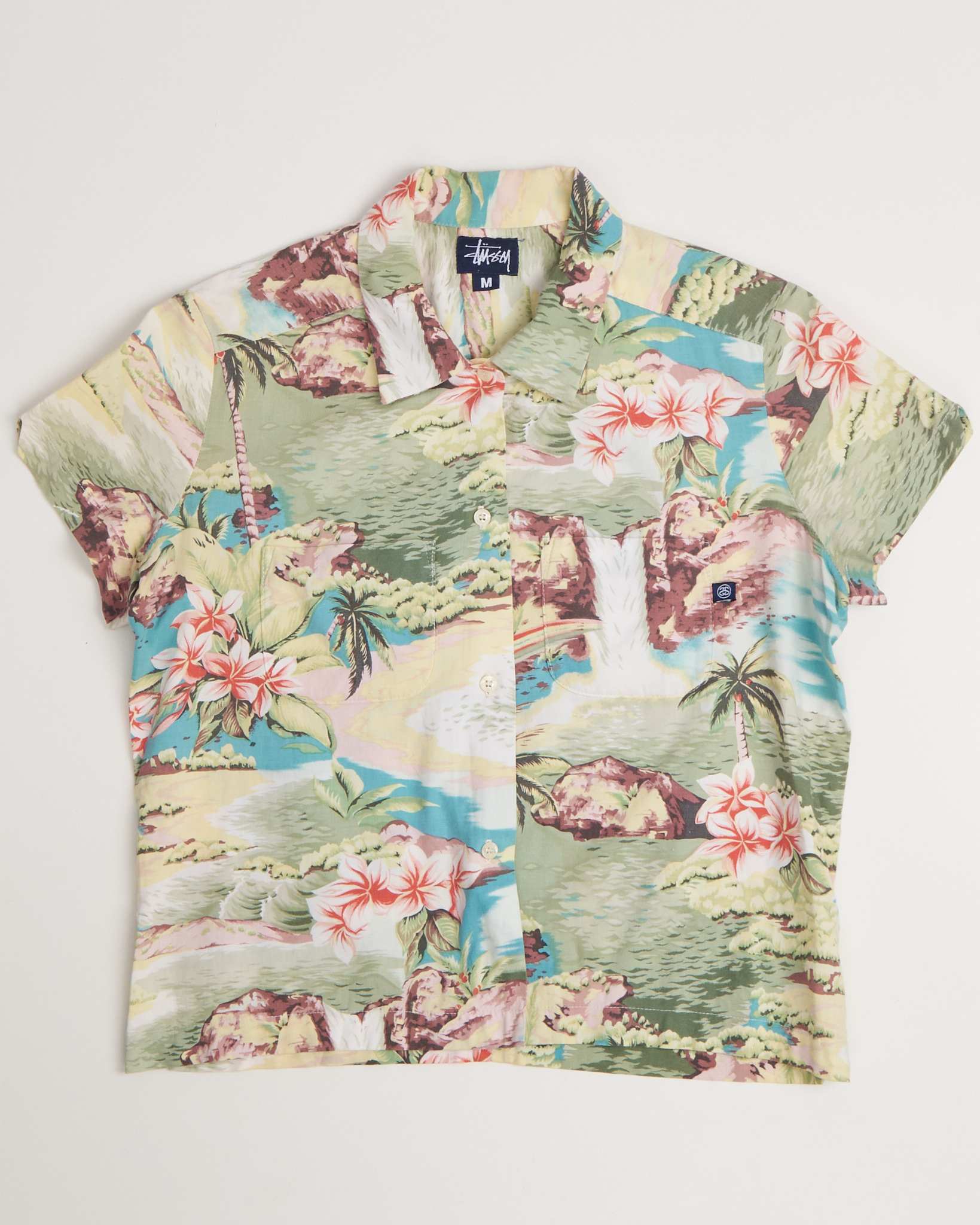 Рубашка Stussy светло - зеленого цвета с тропическим принтом. Прямой силуэт. Мягкая линия плеч. Принт с пальмами, водопадами и цветами. Отложной воротник. Застежка на пуговицы по всей длине. Короткий рукав с аккуратным краем. На груди функциональный карман с небольшим фирменным патчем.