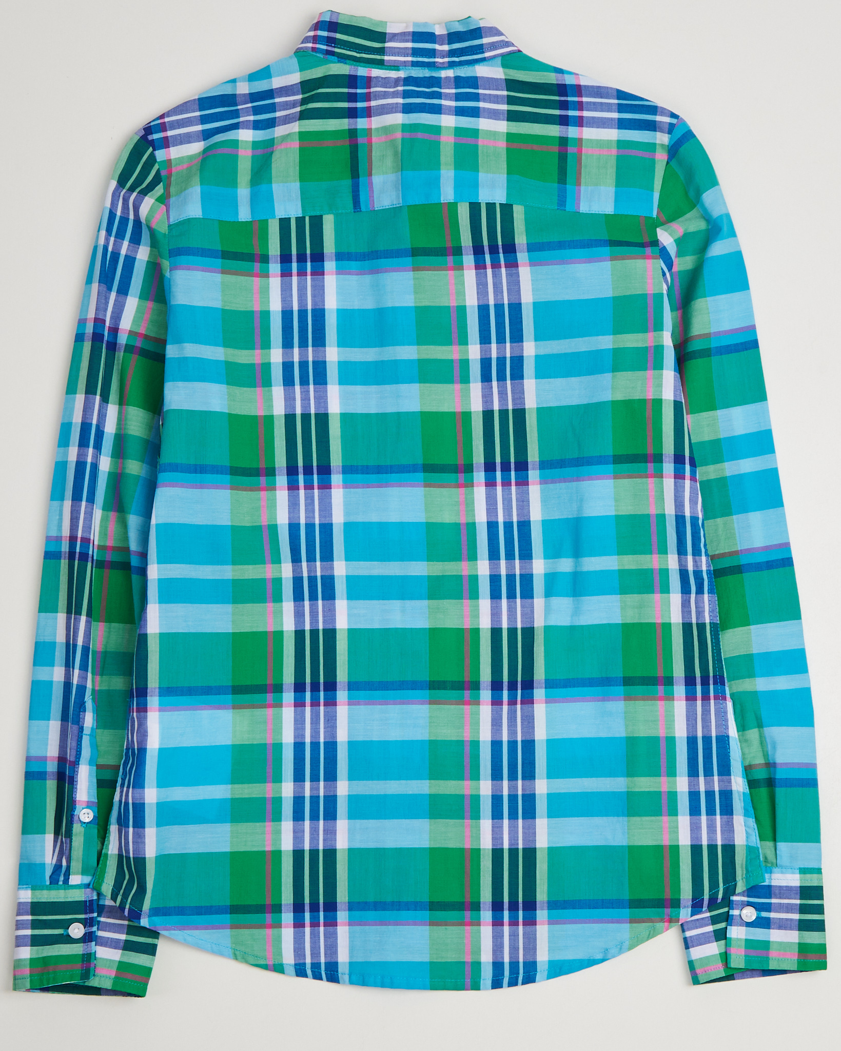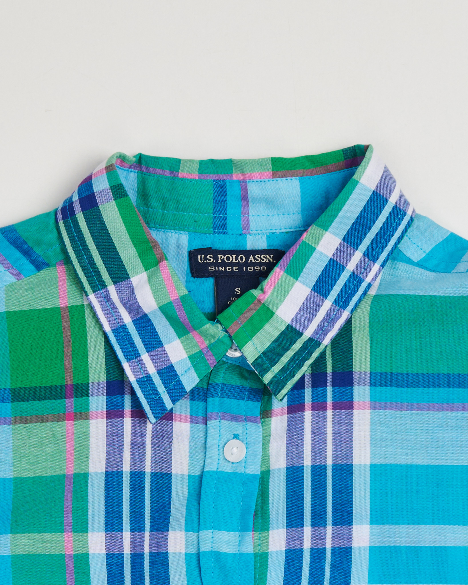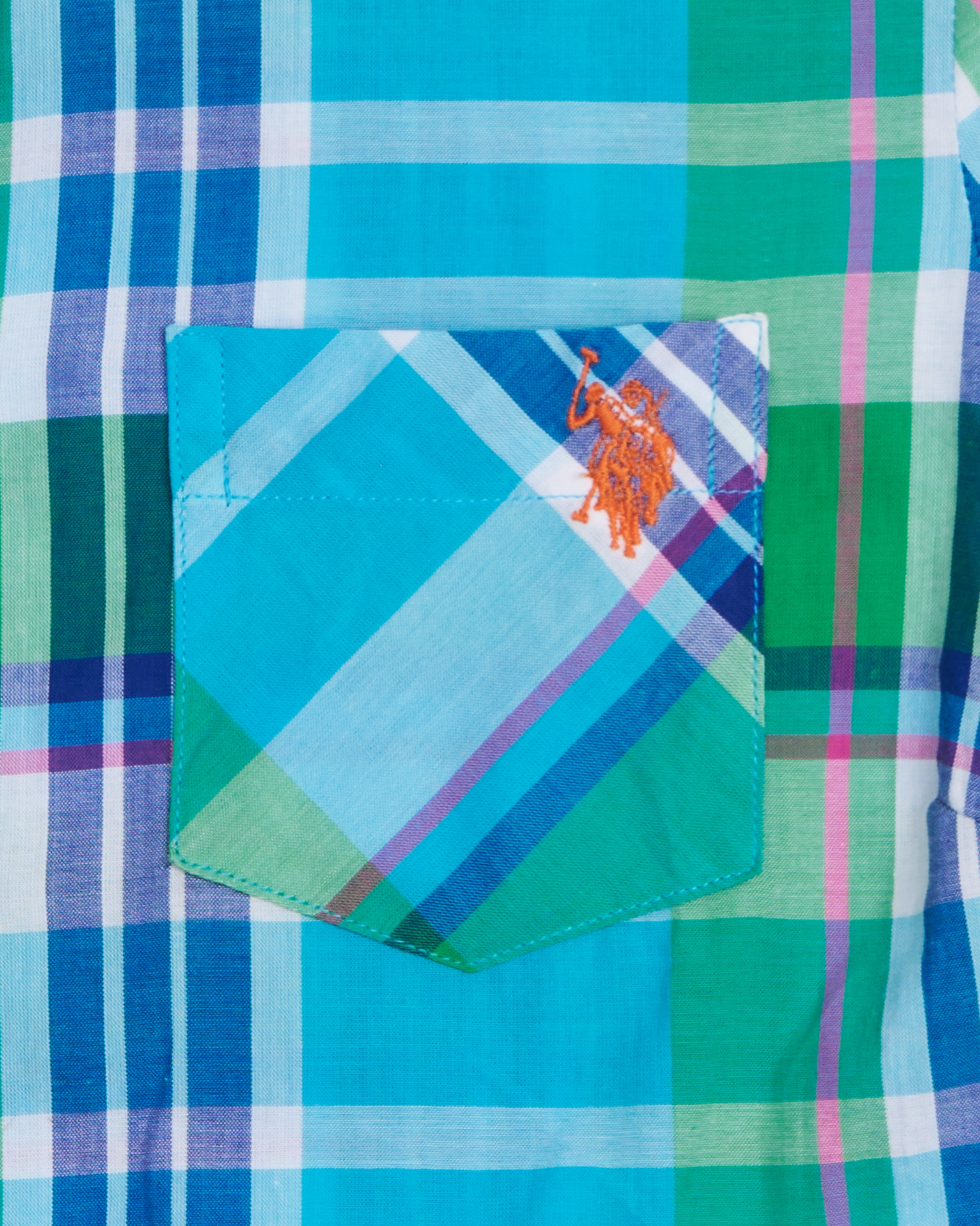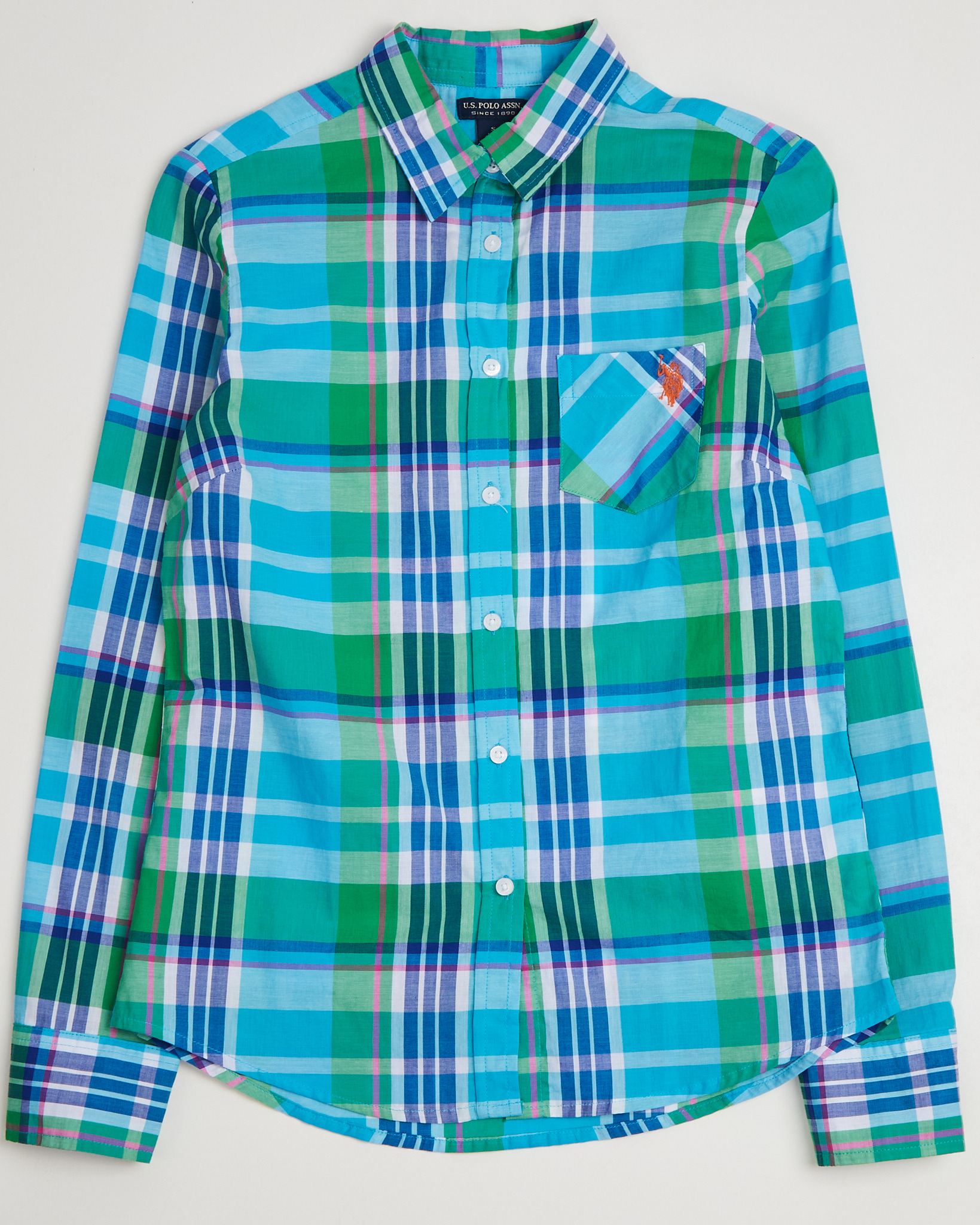 Рубашка от U.S. Polo Assn из лёгкого хлопка в клетку с пересекающимися линиями в оттенках бирюзы, изумруда и небесно-голубого. Прямой крой, аккуратный воротник и белые перламутровые пуговицы. Карман на груди декорирован вышивкой с фирменным логотипом.
