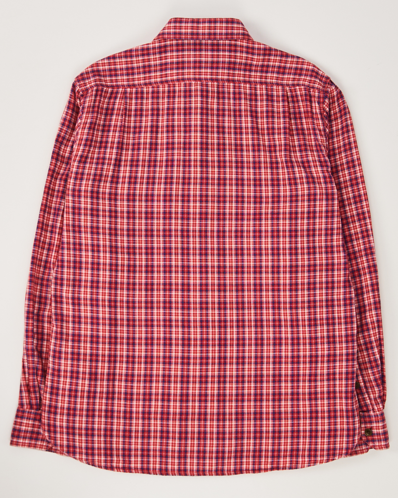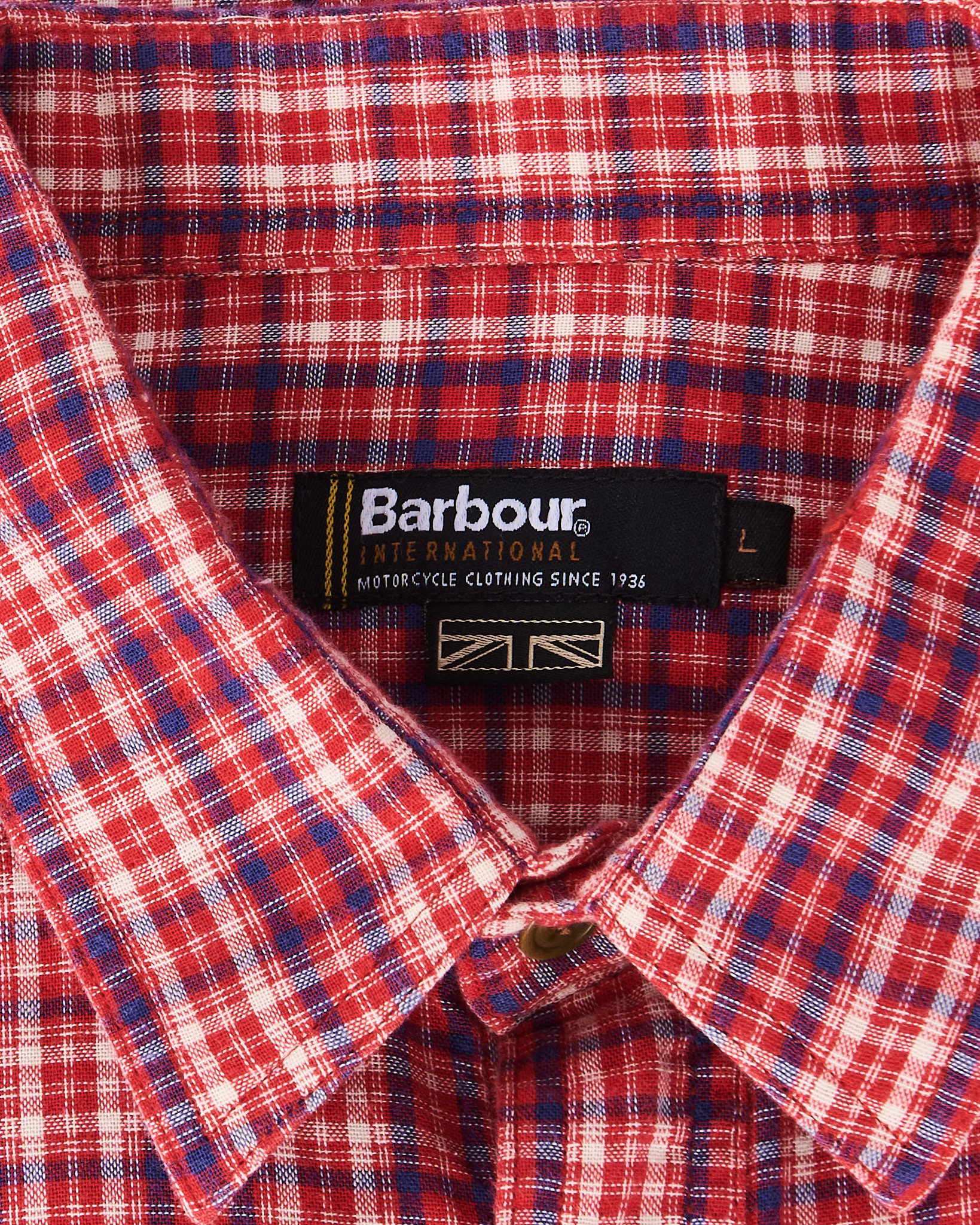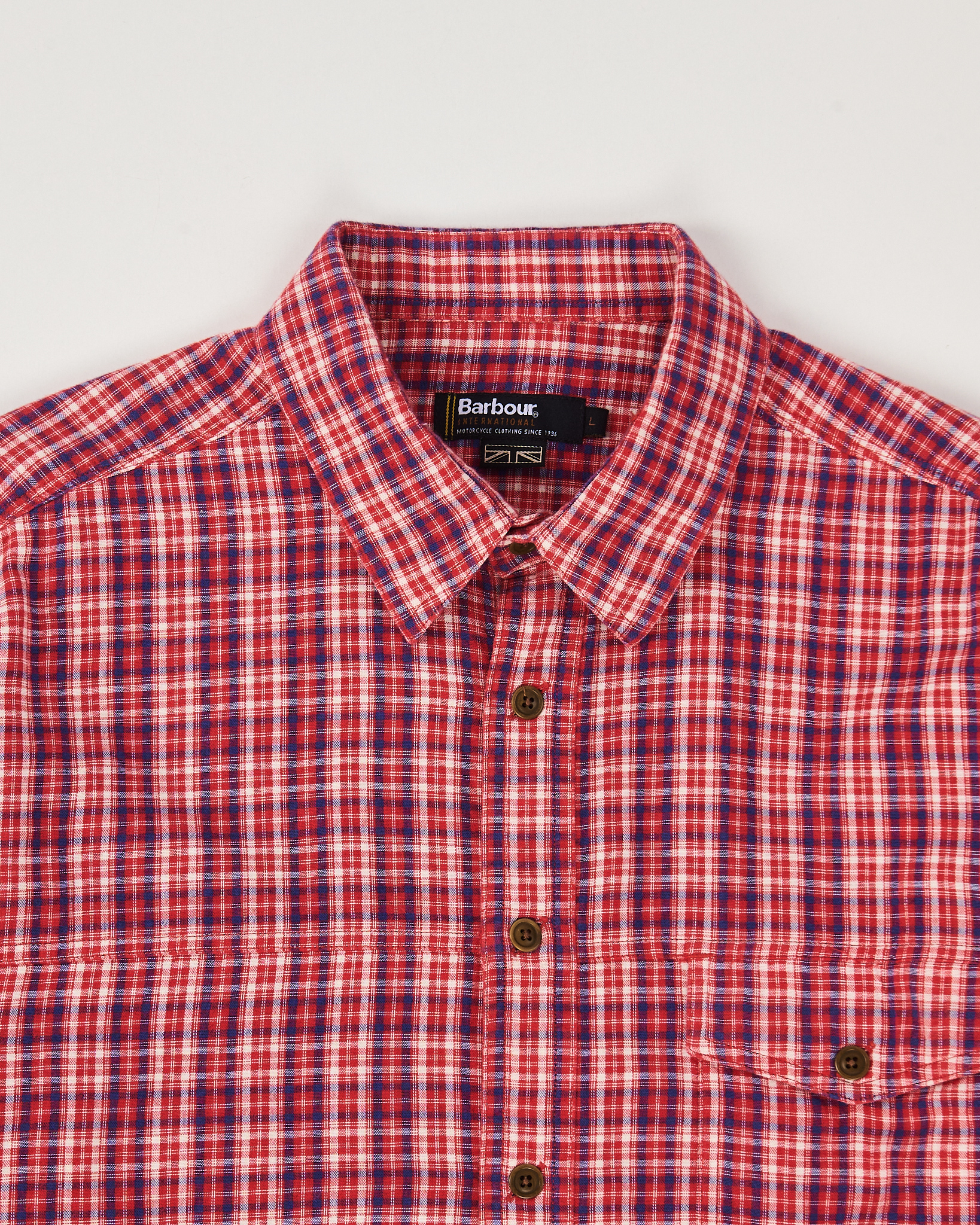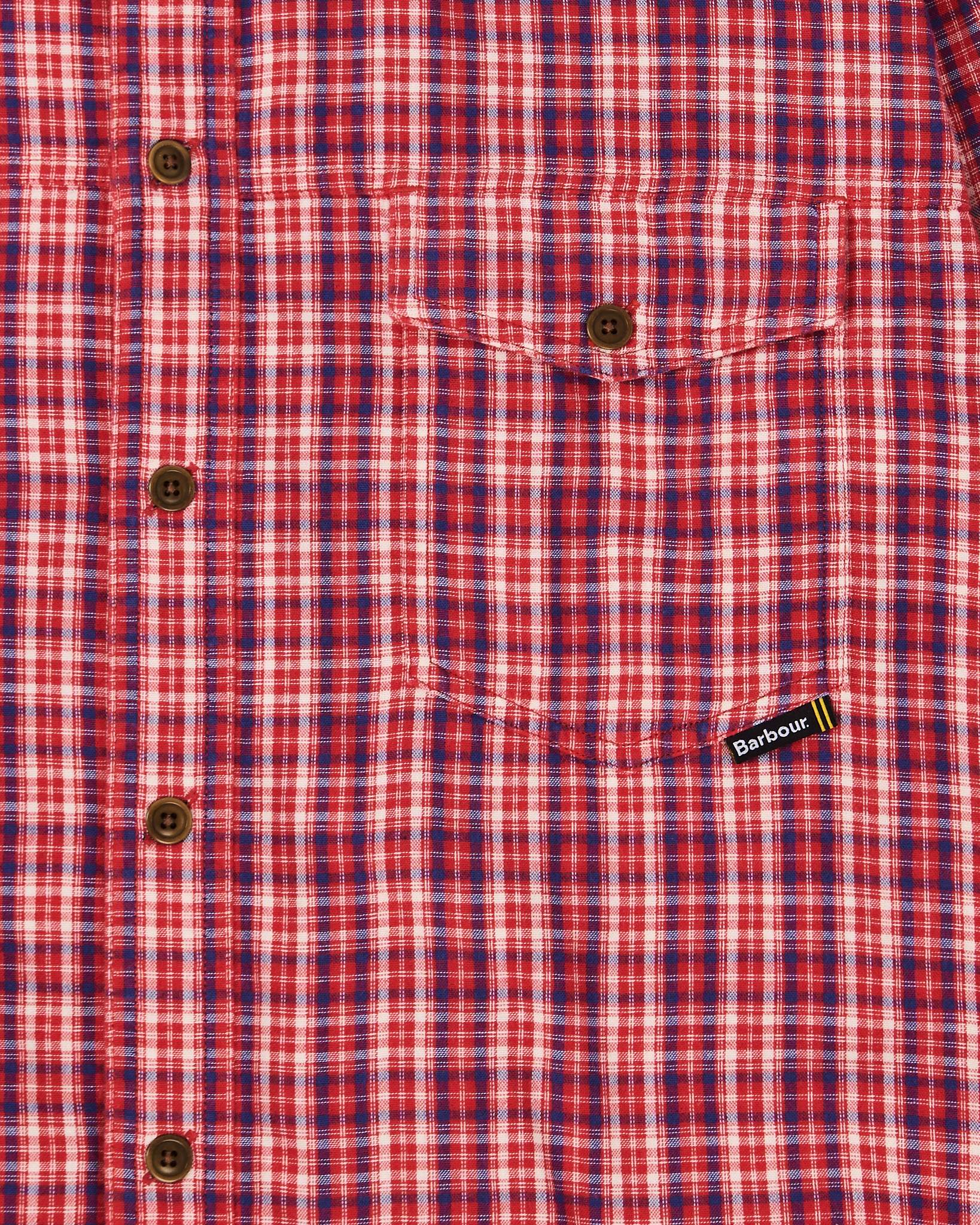 Рубашка из хлопковой ткани от британского бренда Barbour. Клетчатый рисунок в красных, белых и синих оттенках. Прямой крой. Классический воротник, нагрудный карман на пуговицу