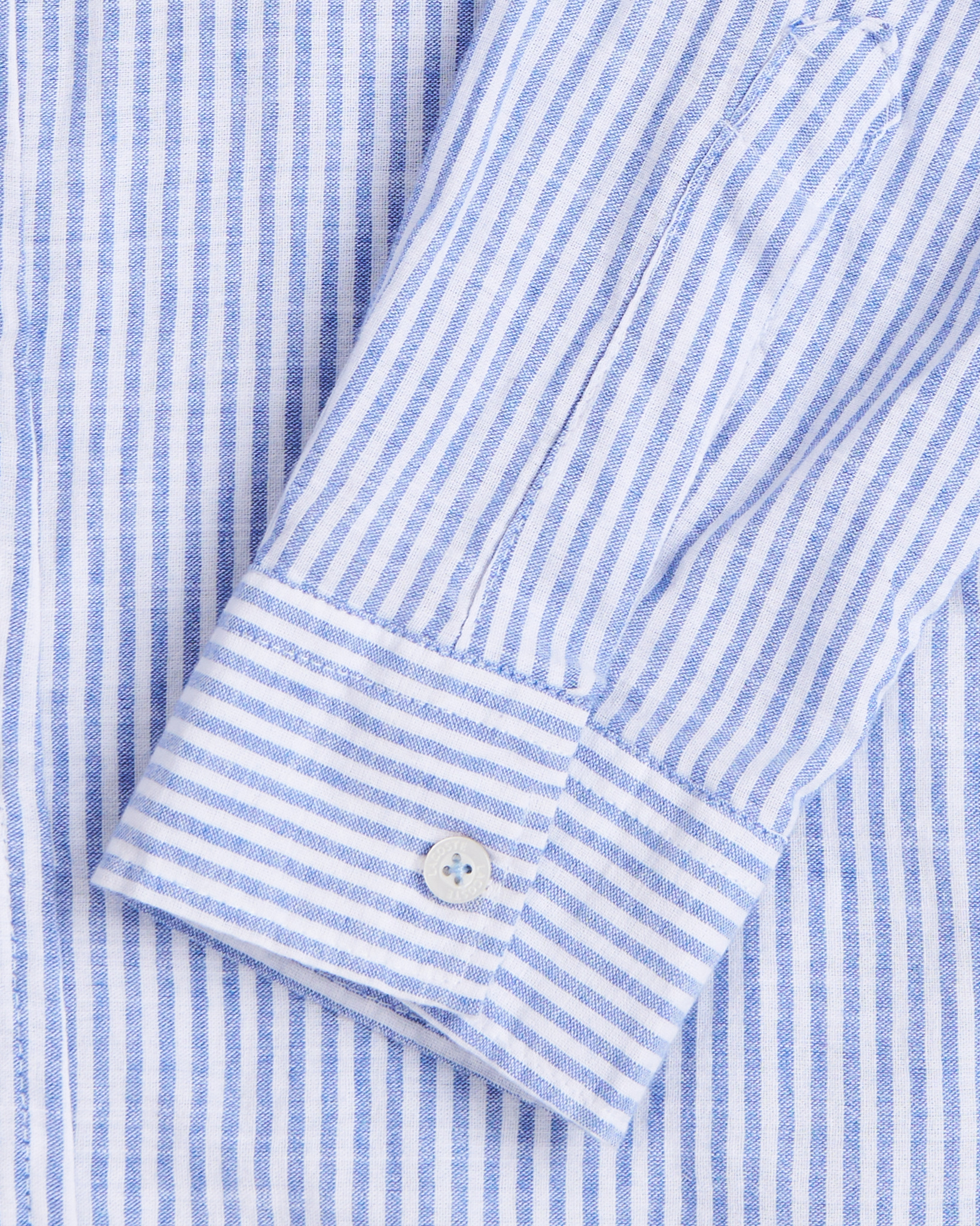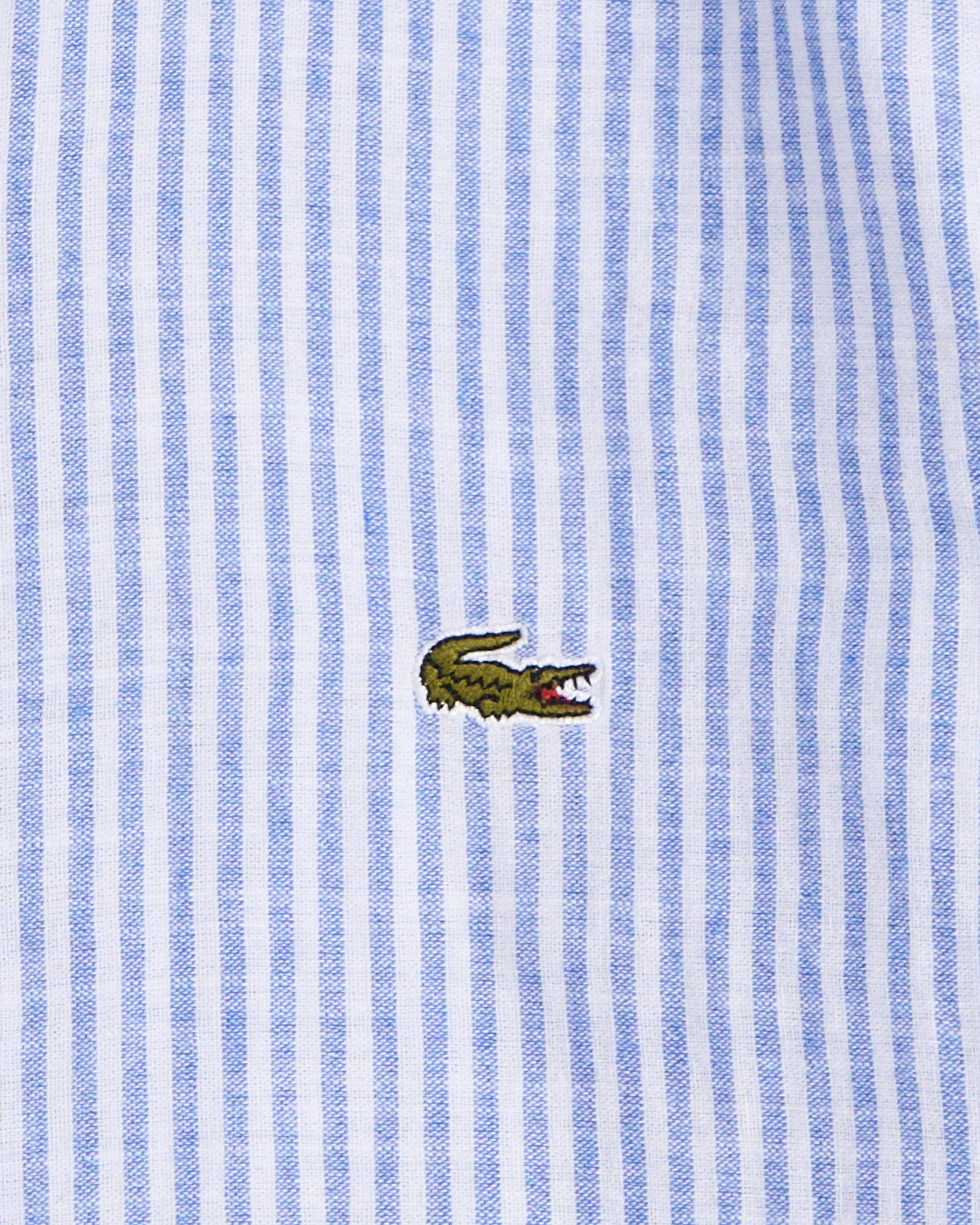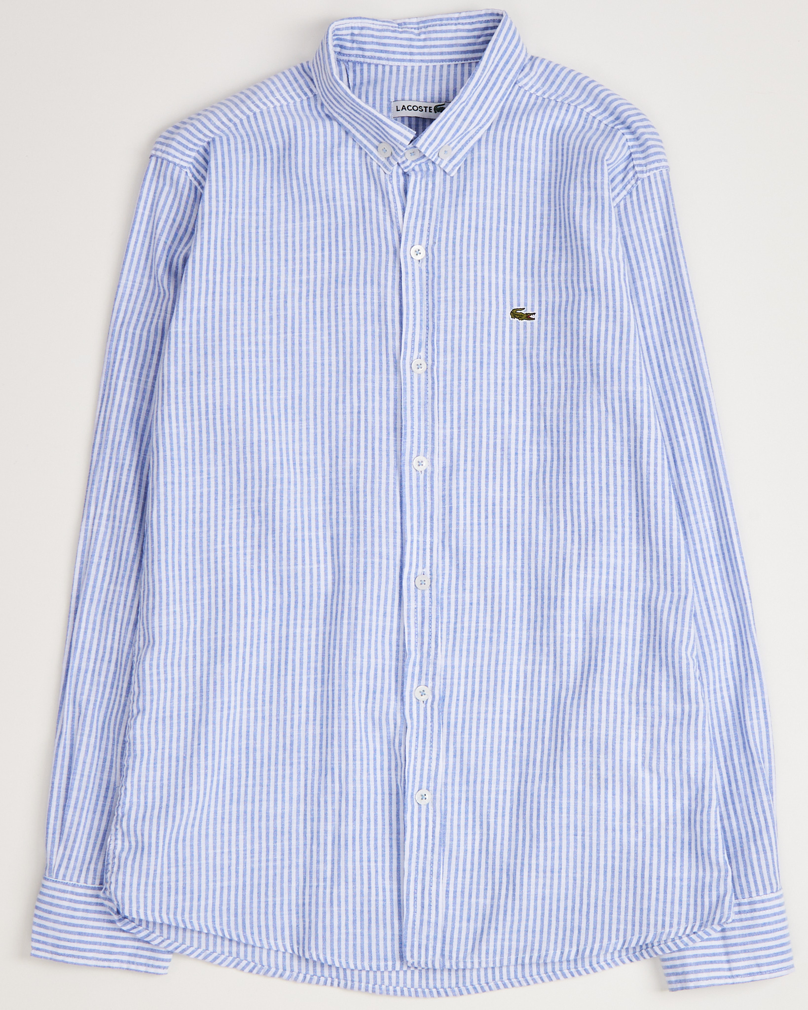 Классическая рубашка в бело-голубую полоску Lacoste прямого кроя с длинными рукавами. Отложной воротник с застежкой на пуговицах, манжеты на рукавах и фирменный логотип на груди.