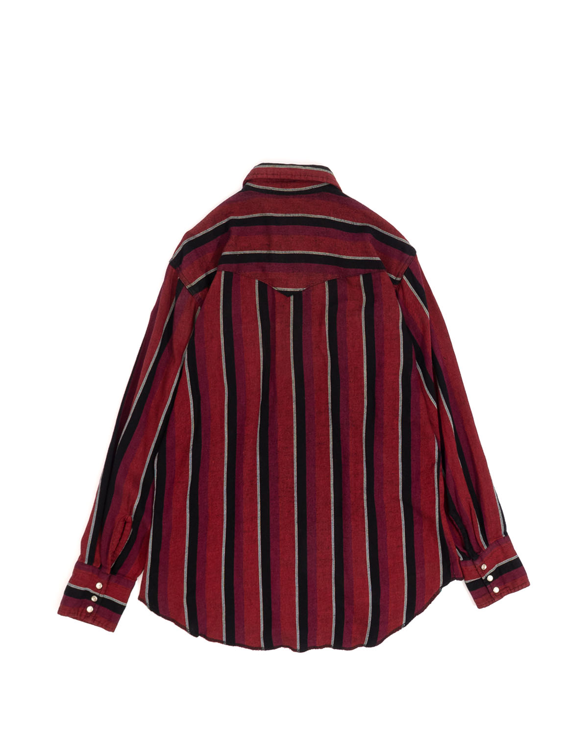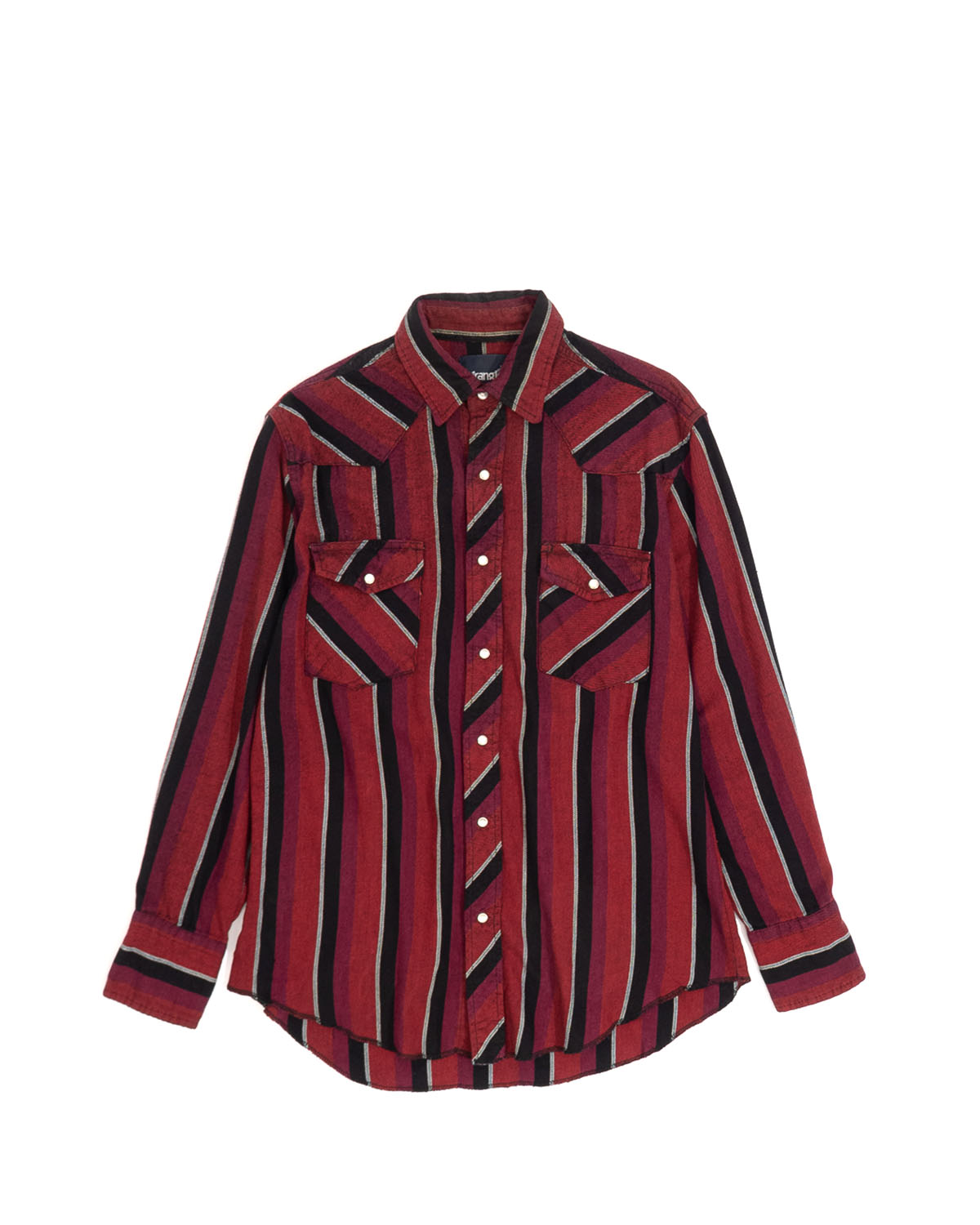 - Рубашка выполнена из плотного хлопкового полотна с выразительной полоской в глубоких винных и тёмных оттенках