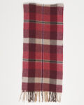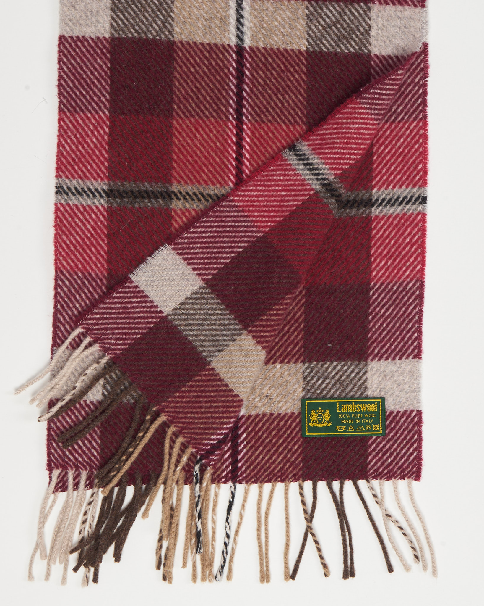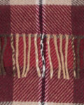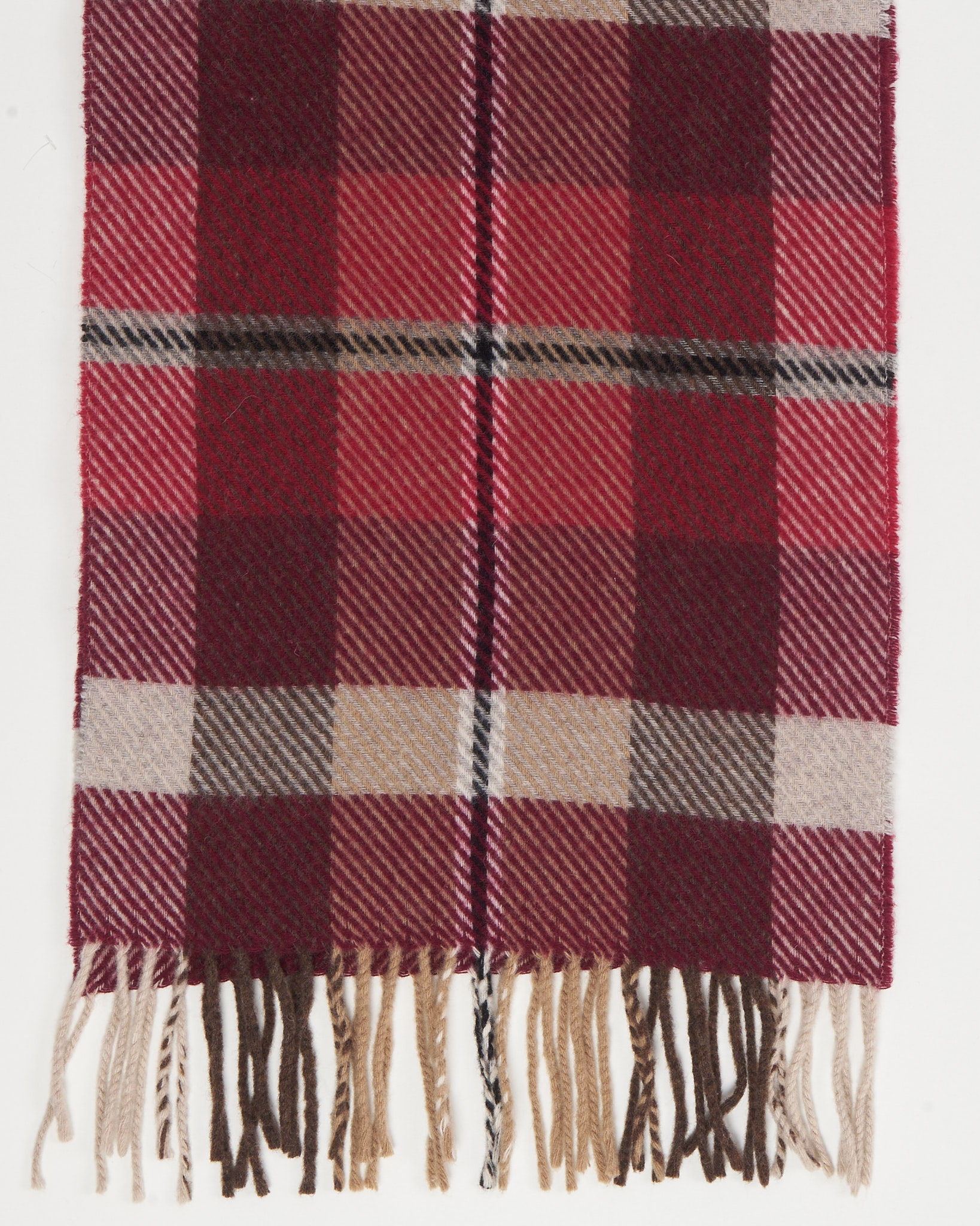 Шарф выполнен из мягкой шерсти lambswool. Классическая клетка в красно-бордовой гамме, край оформлен длинной густой бахромой.