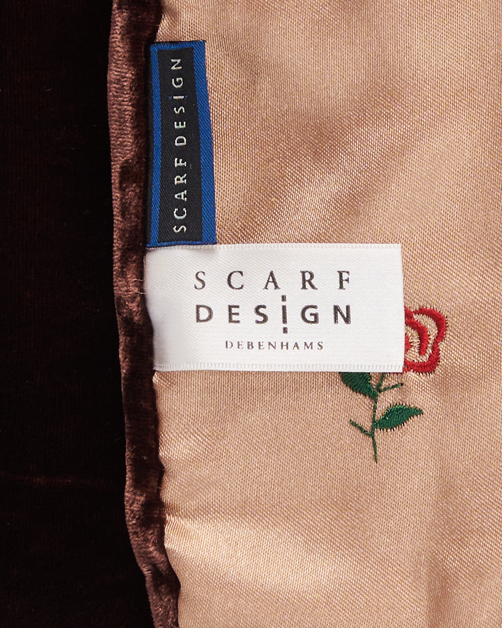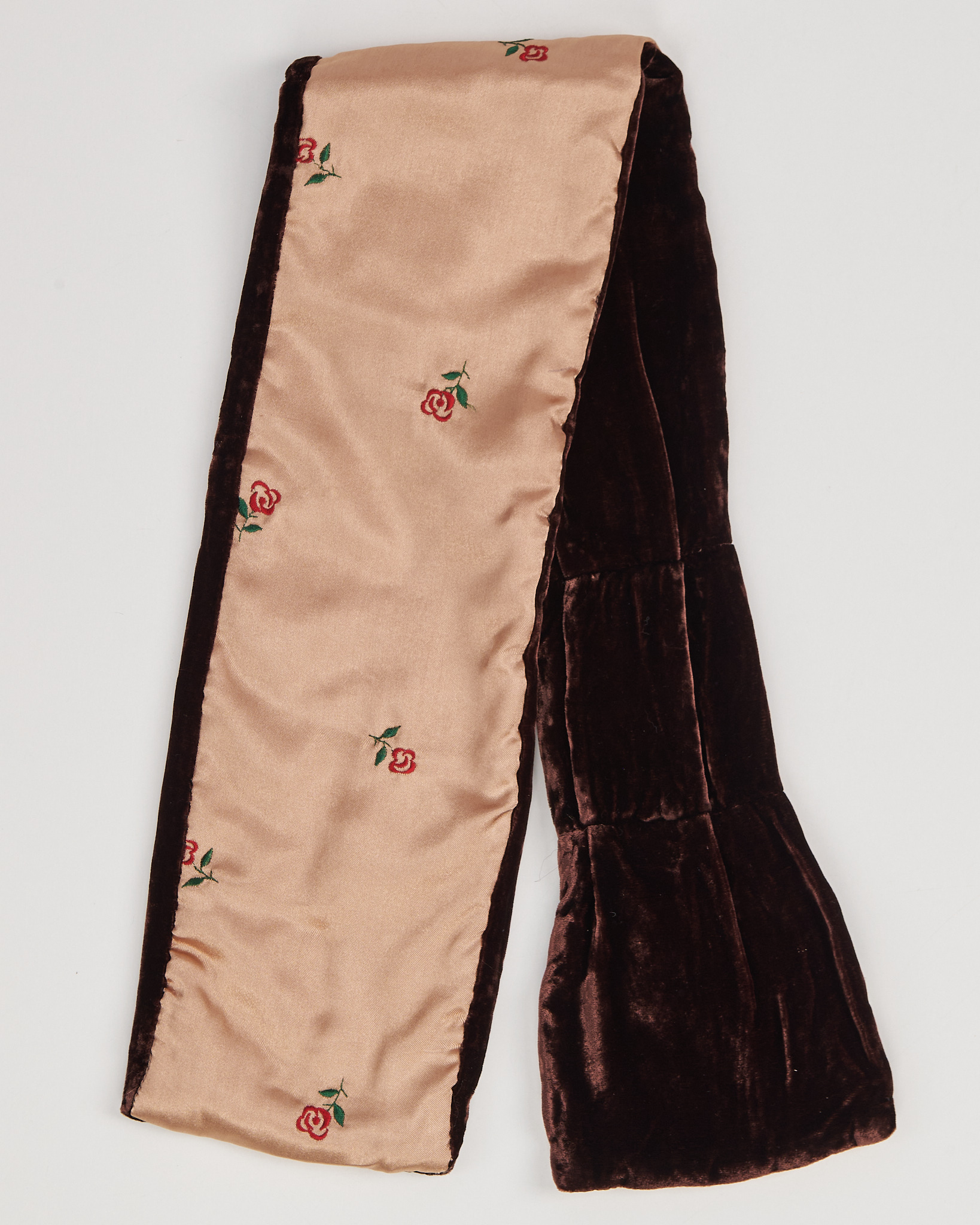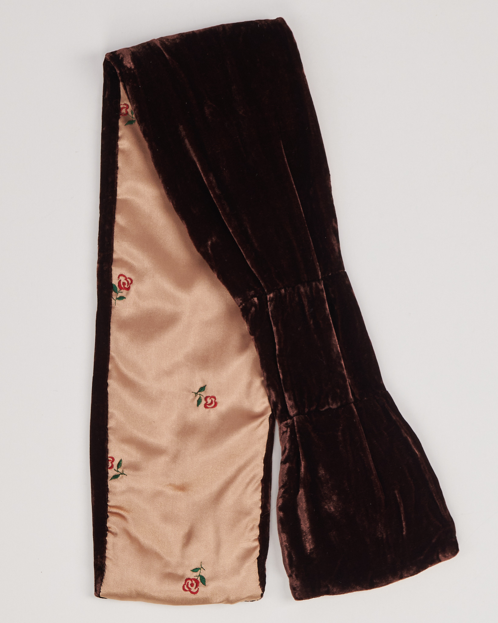 Шарф от Scarf Design из мягкого велюра с благородным блеском. Подкладка бежевого оттенка с изящной вышивкой в виде цветочных мотивов.