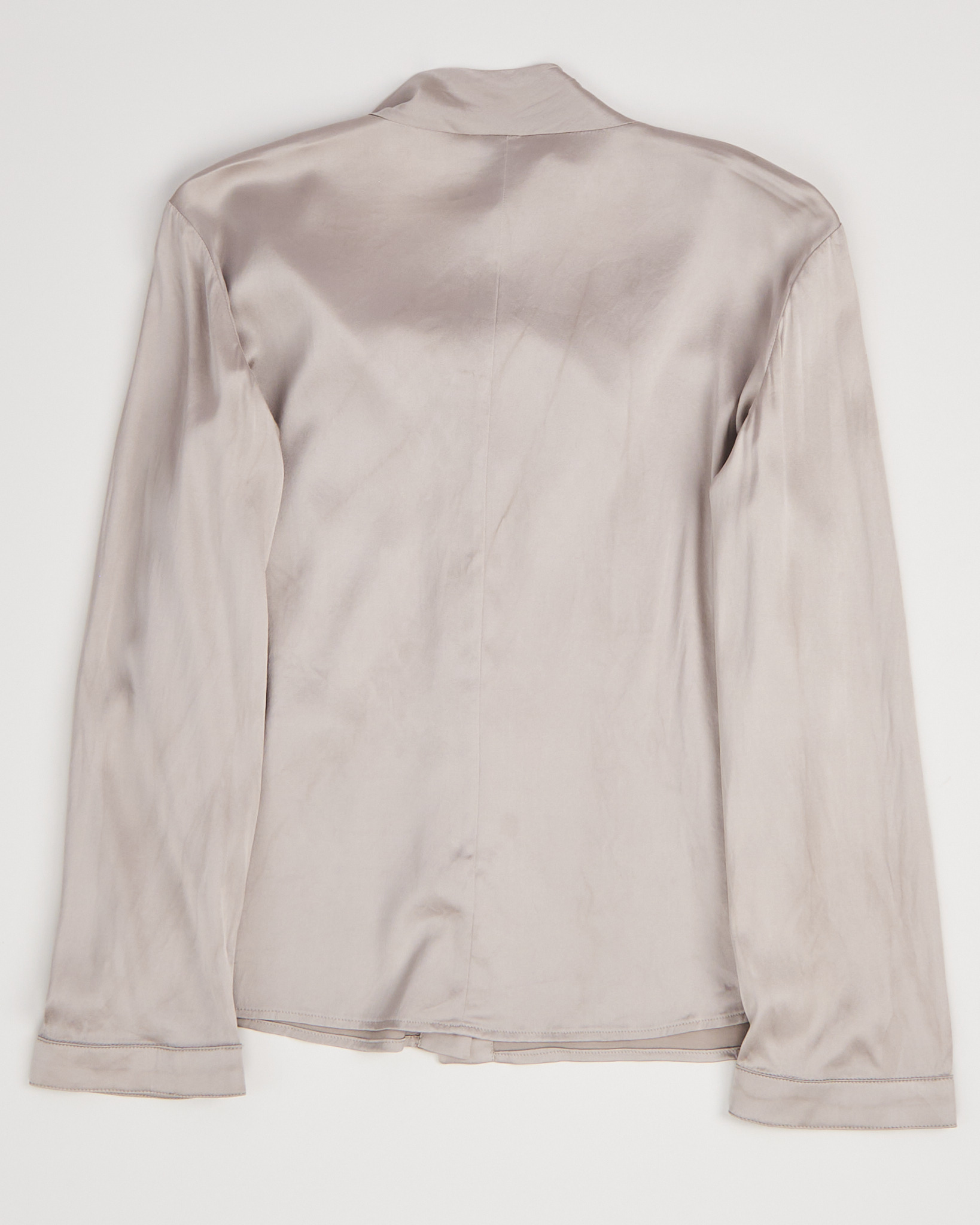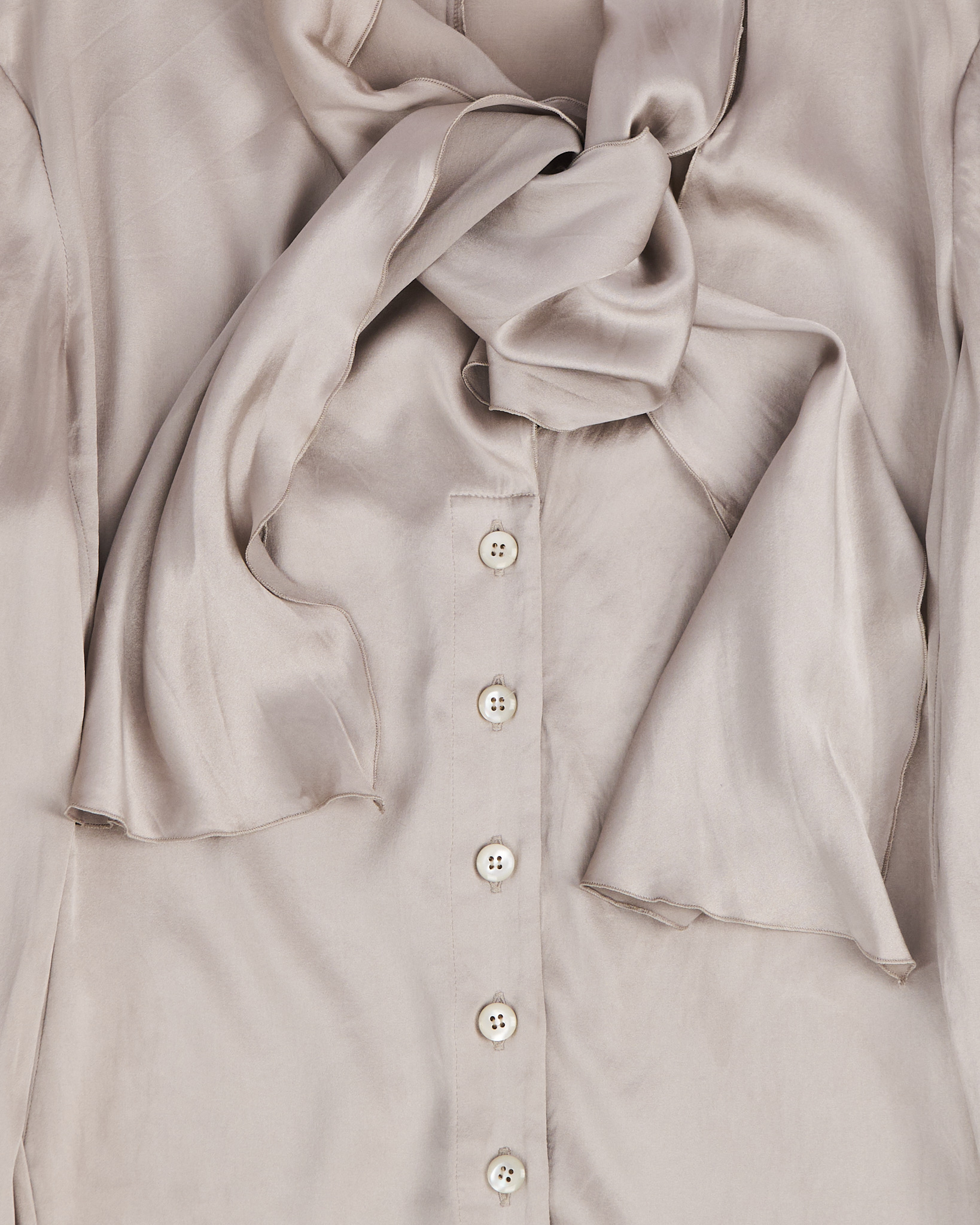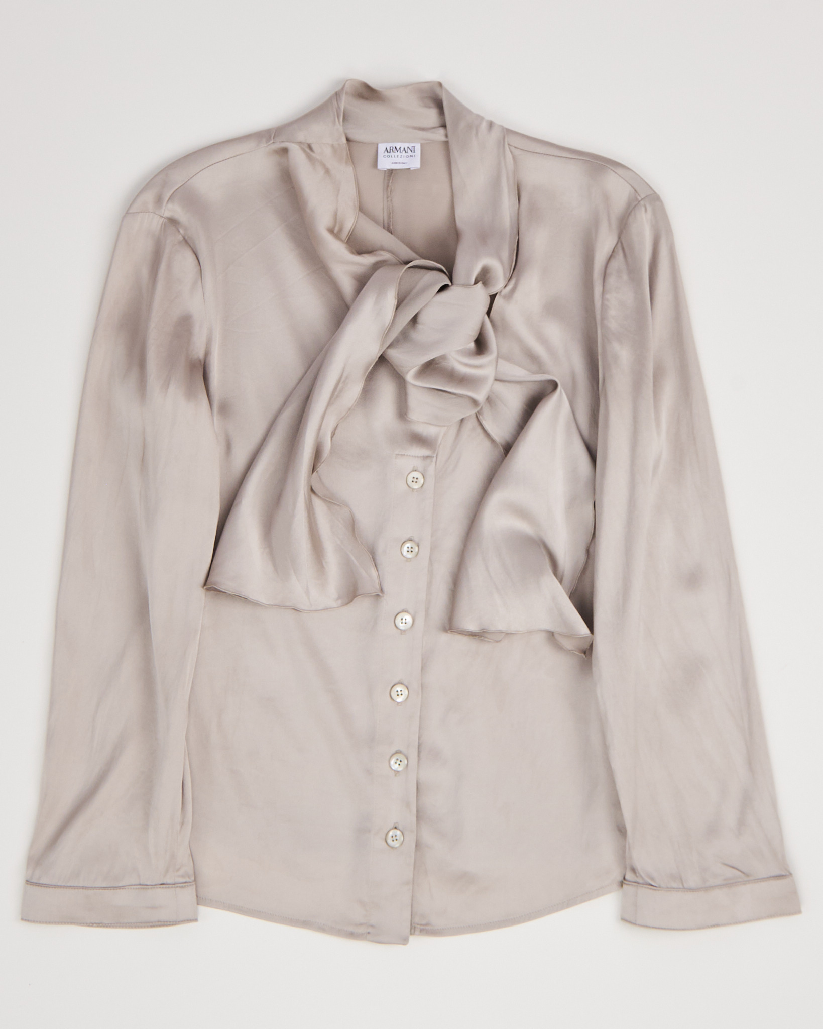 Шелковая блуза Armani в серебристо-бежевом оттенке. Свободный крой, акцент на вороте с завязкой. Сделана в Италии.
