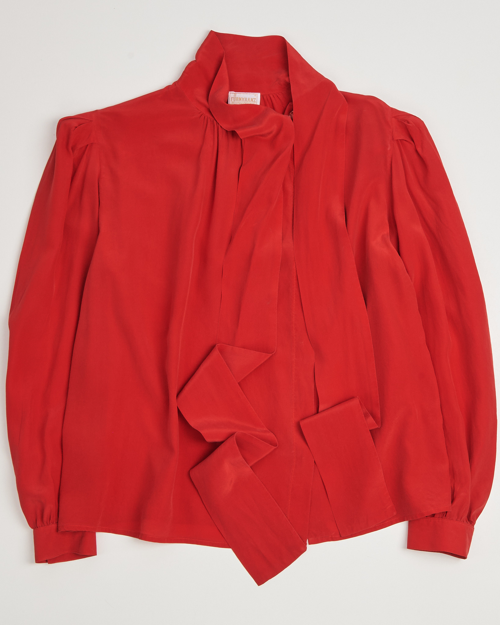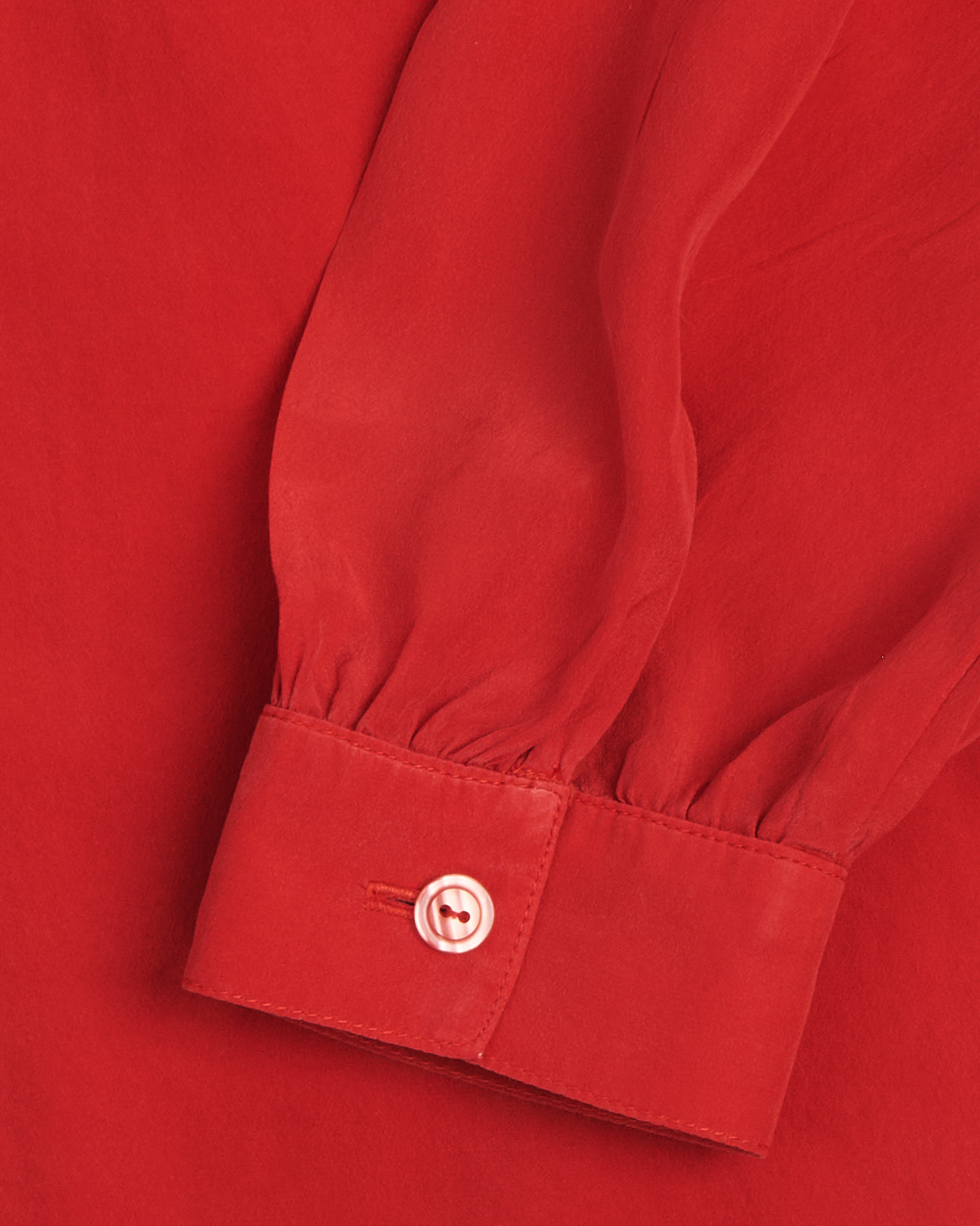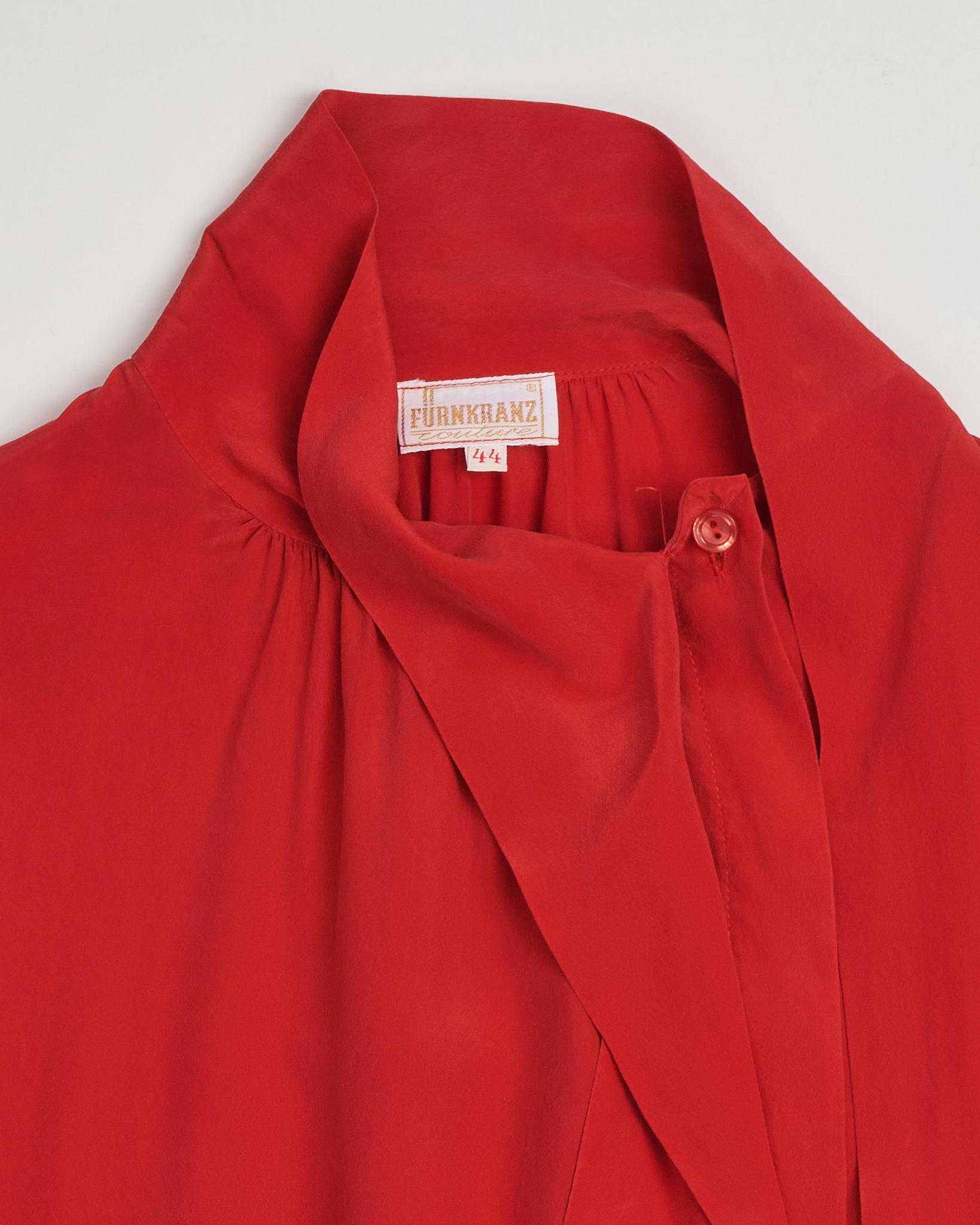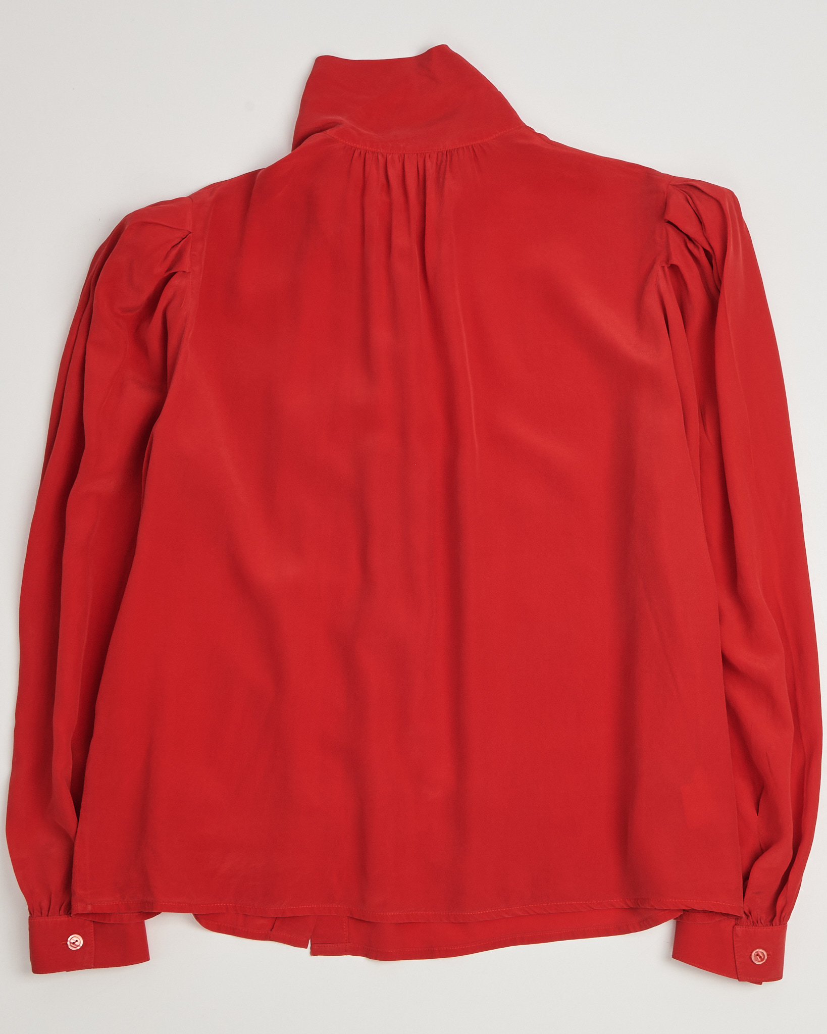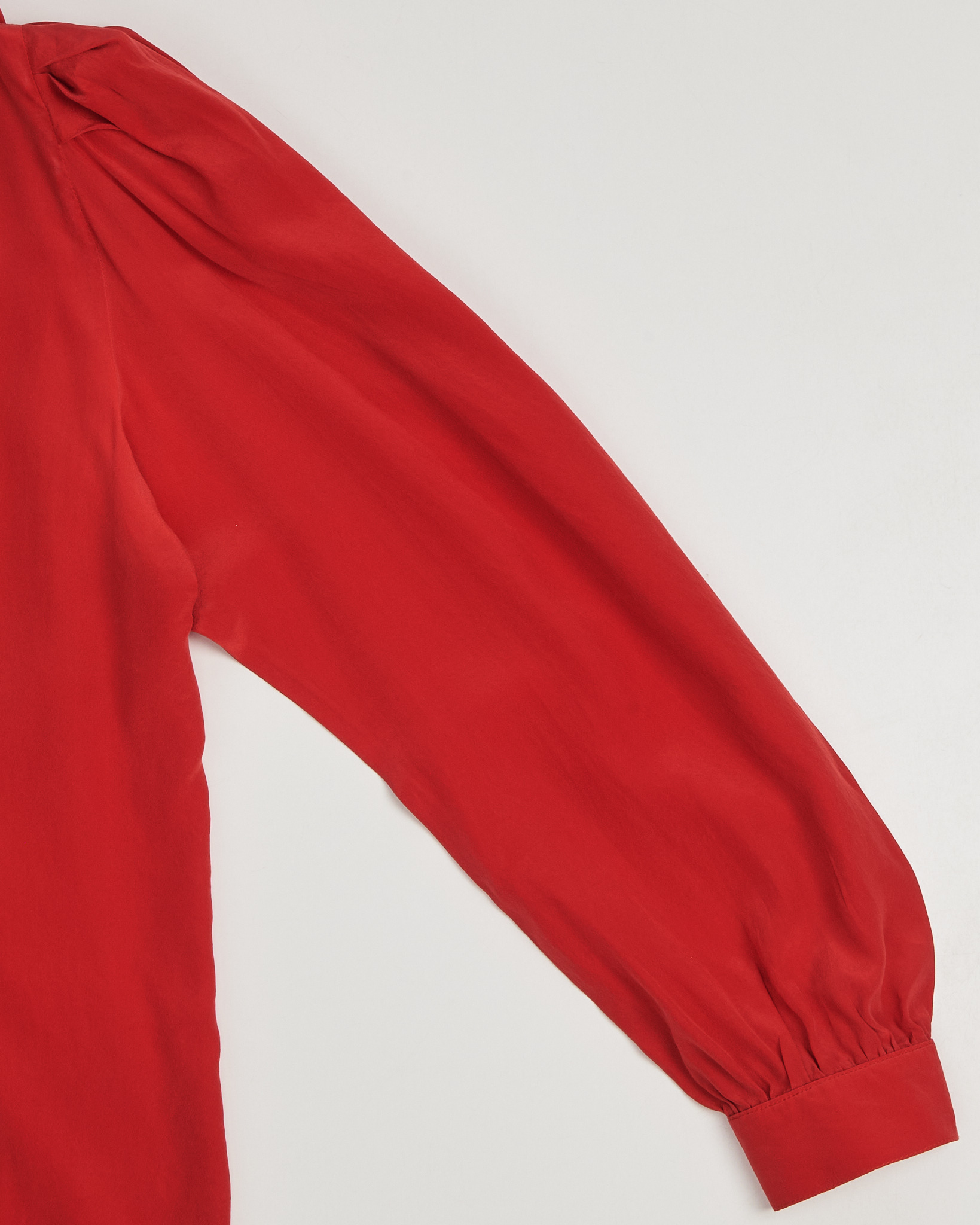 Блуза из легкой шелковой ткани в красном оттенке. Прямой крой, свободная посадка. Акцентные завязки на воротнике, скрытая планка.