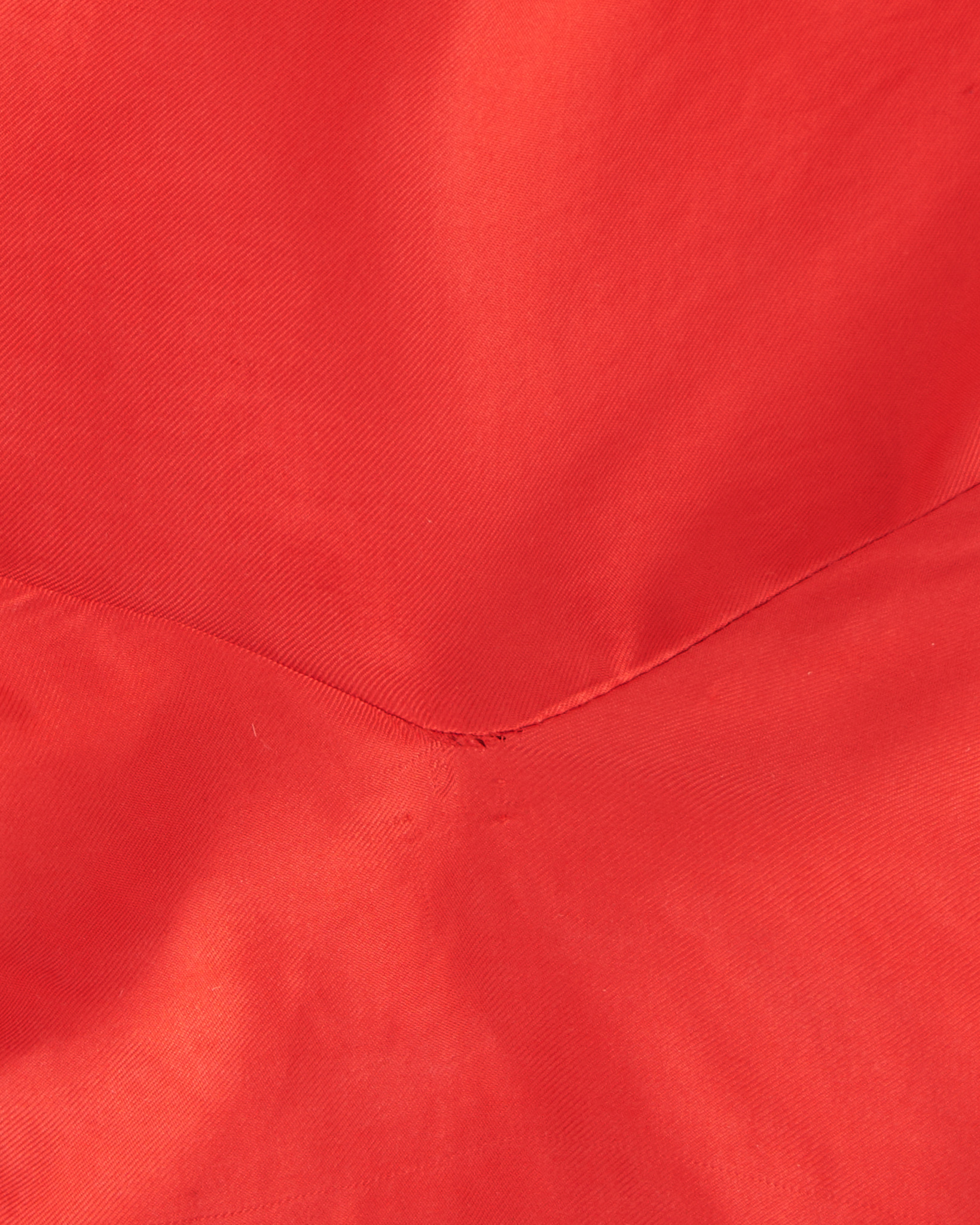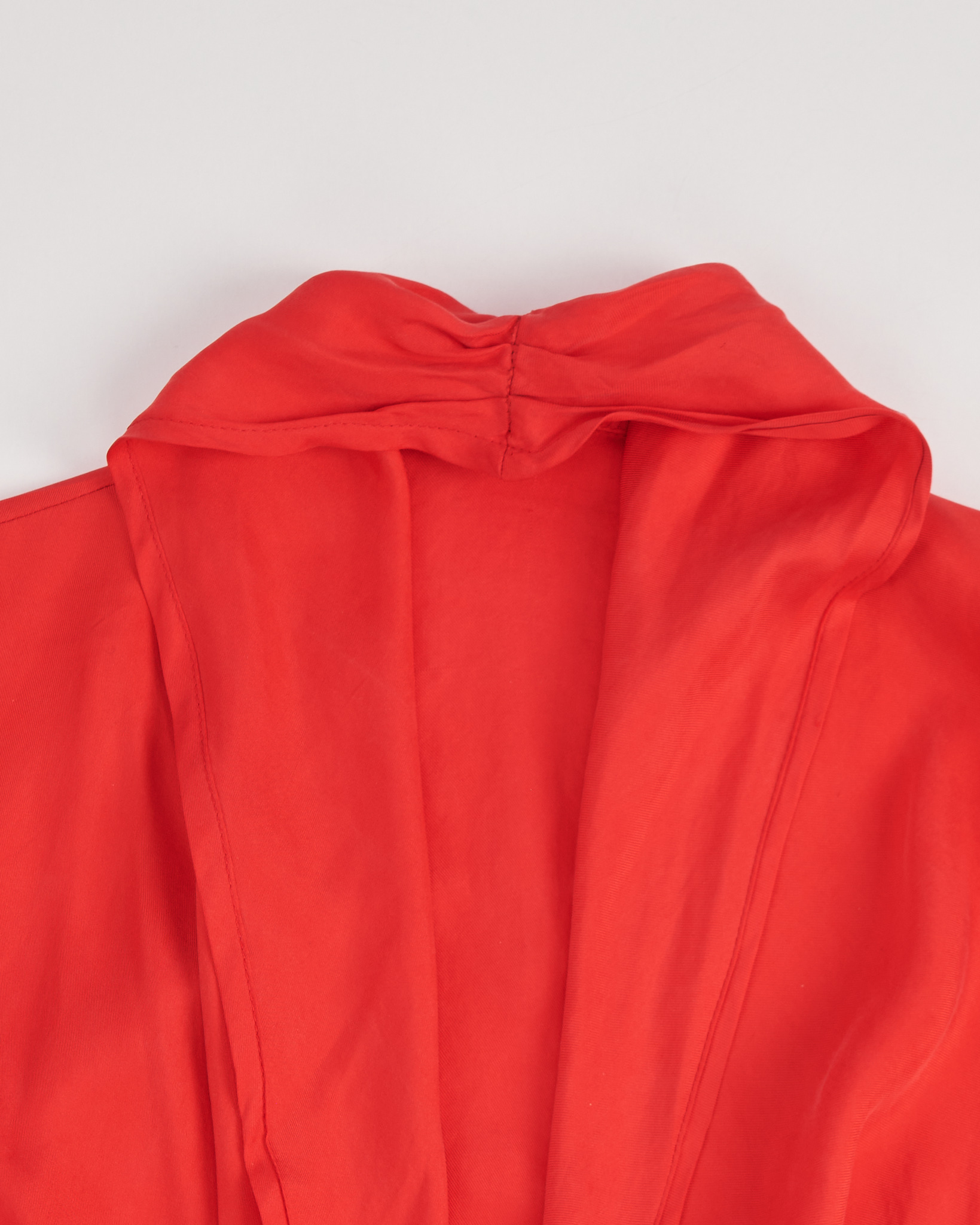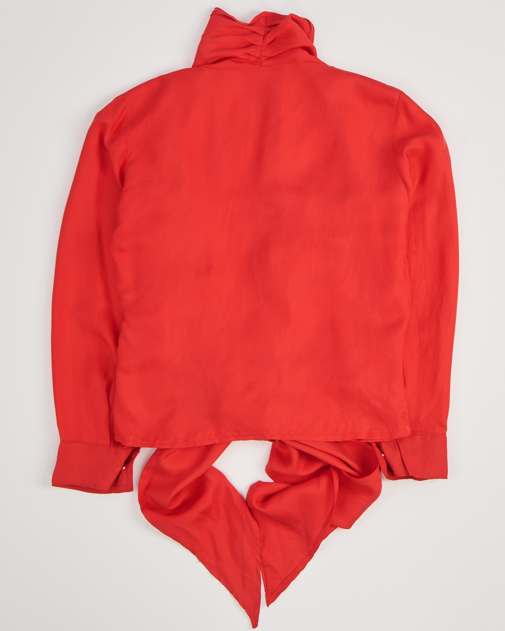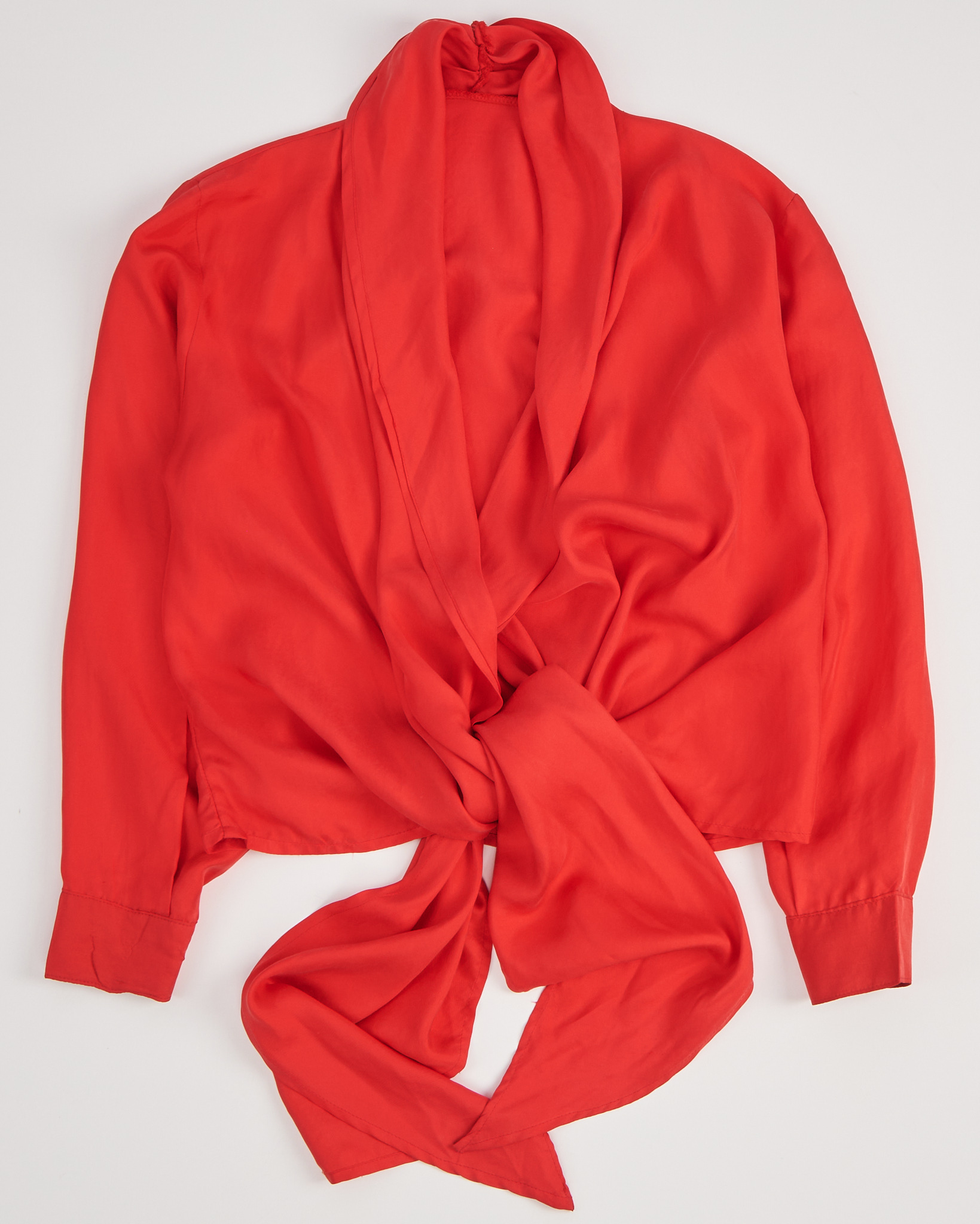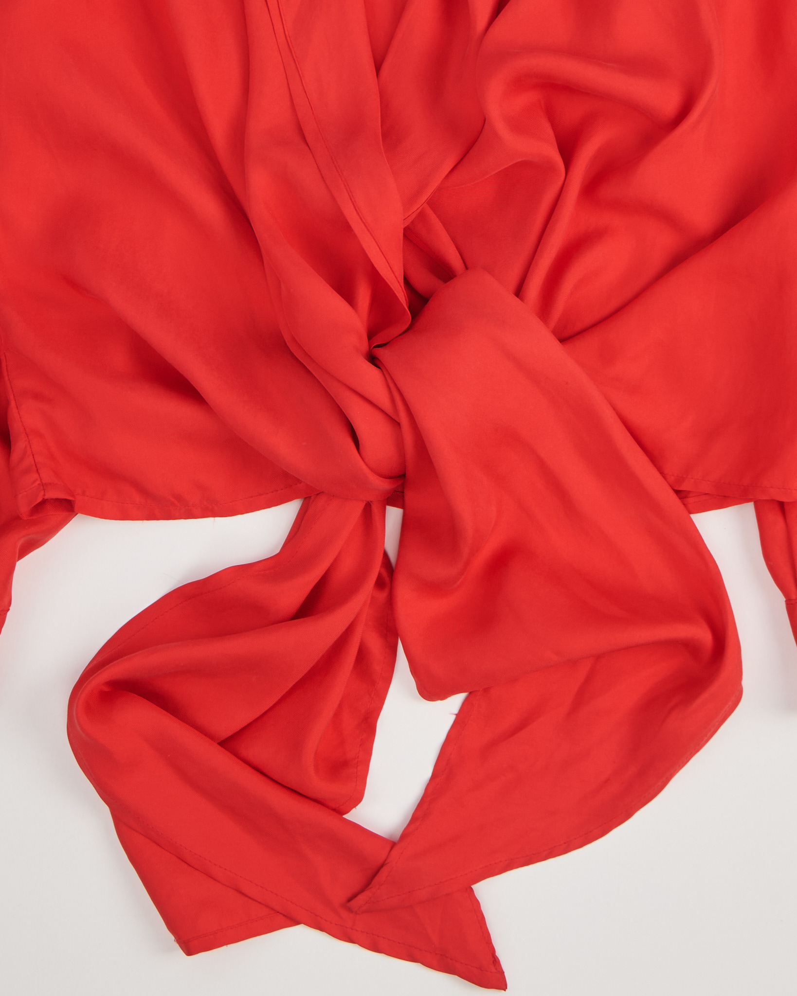 Шелковая блуза с драпировкой насыщенного красного цвета. Посадка свободная. Ленты длинные, широкие, легко завязываются в узел или свободно спускаются вниз. Сделана в Италии.