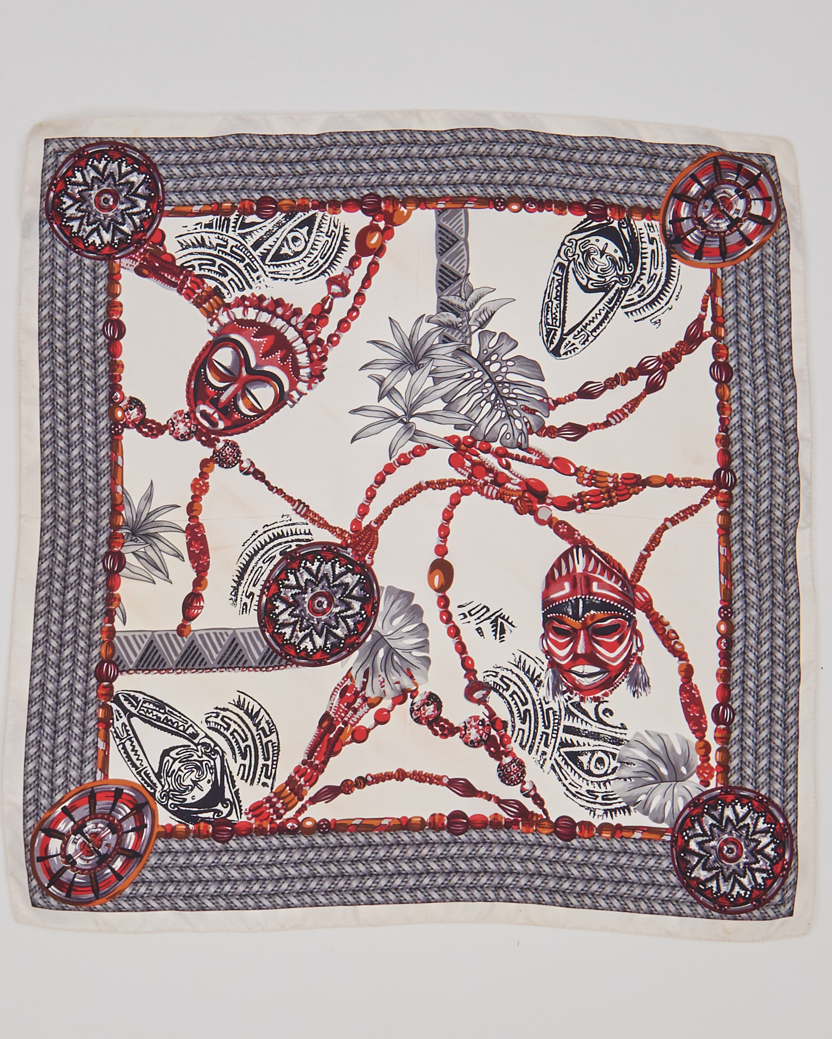 Шелковый экзотический платок в стиле Hermès с отсылками к африканскому искусству: ритуальные маски, бисерные ожерелья, тропические листья. Made in Italy.