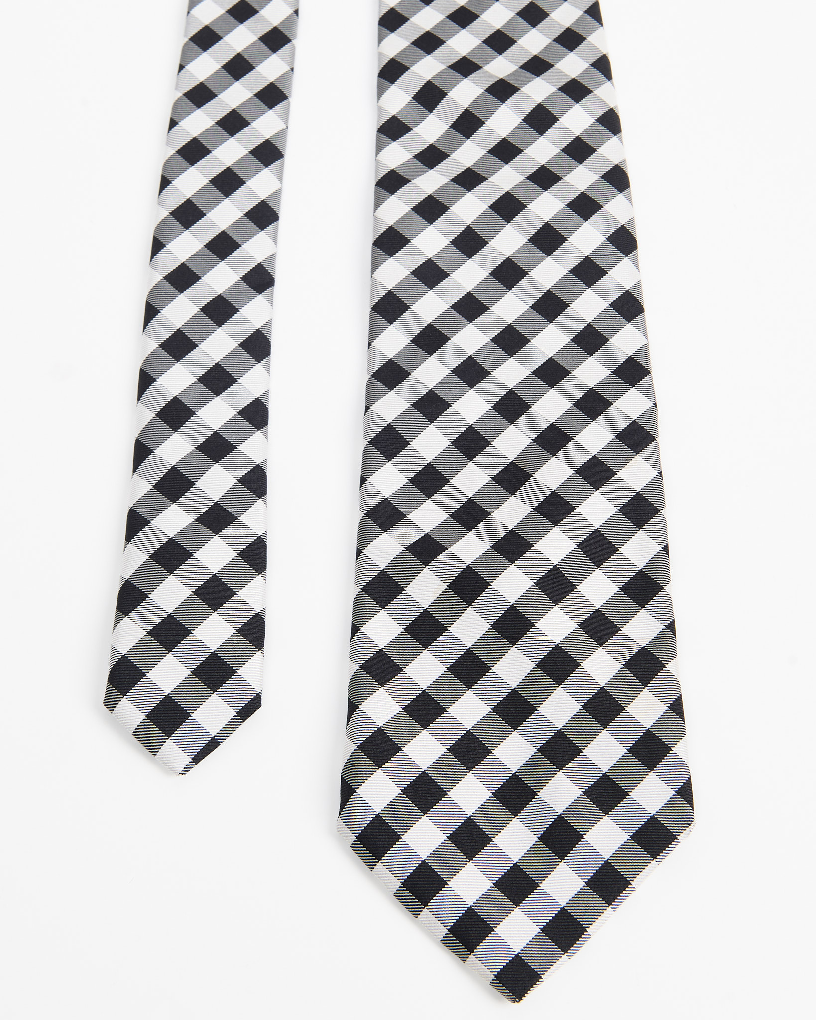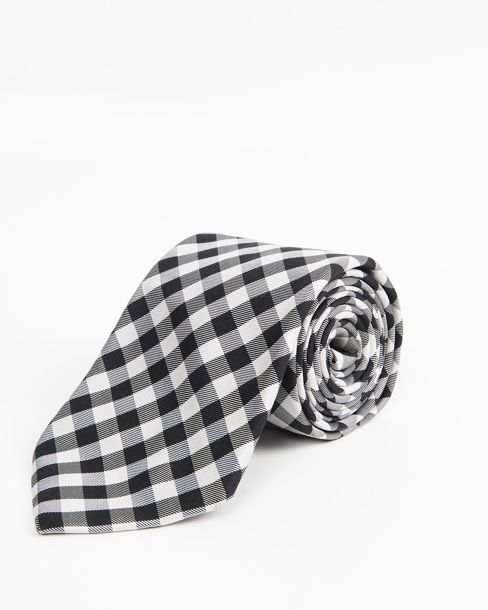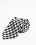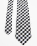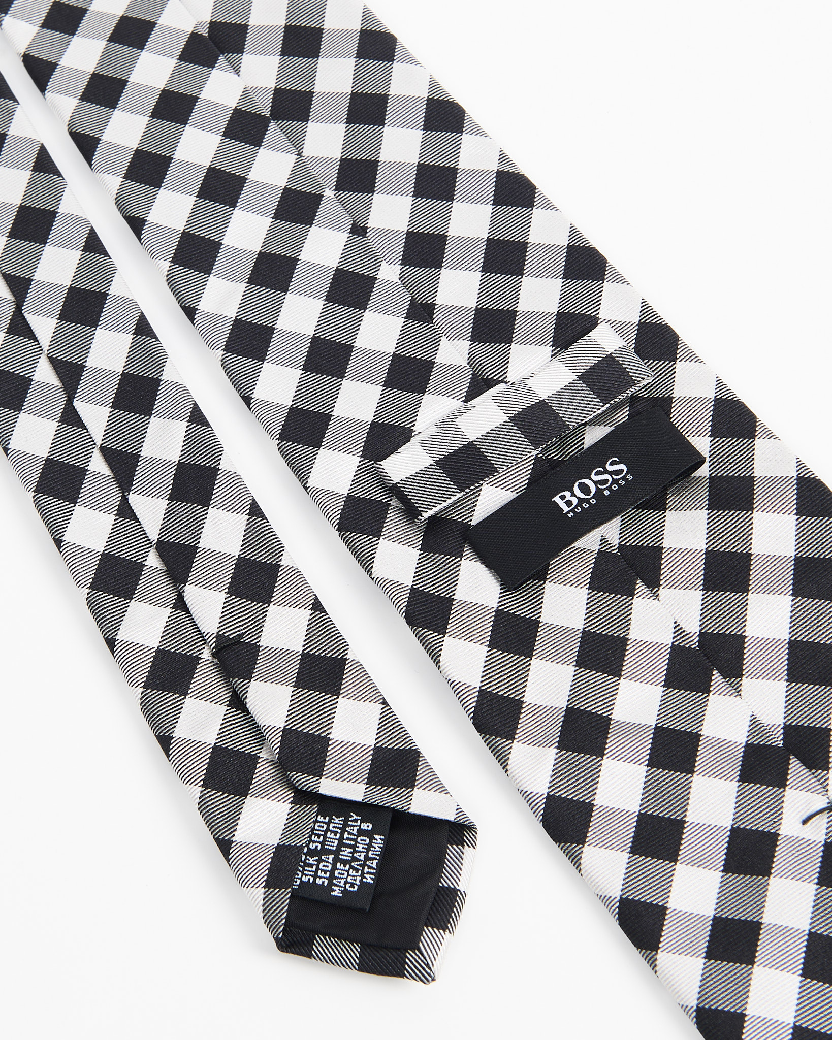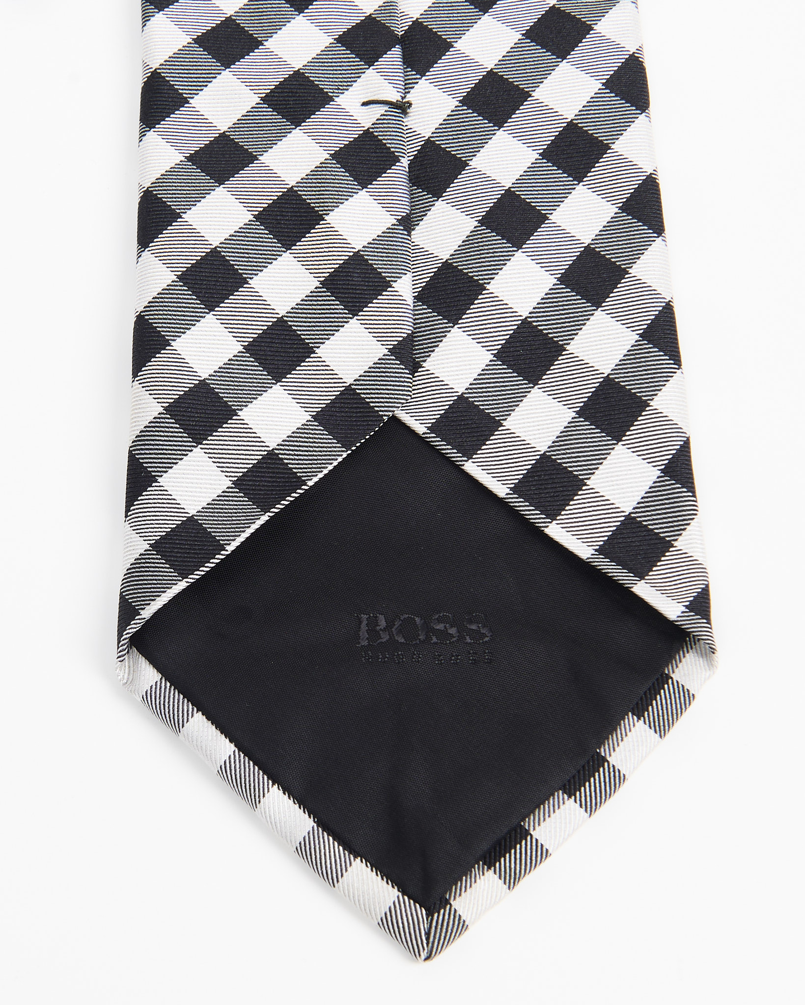 Шелковый галстук Boss с геометрическим узором. Контрастная черно-белая клетка, классический деловой стиль.