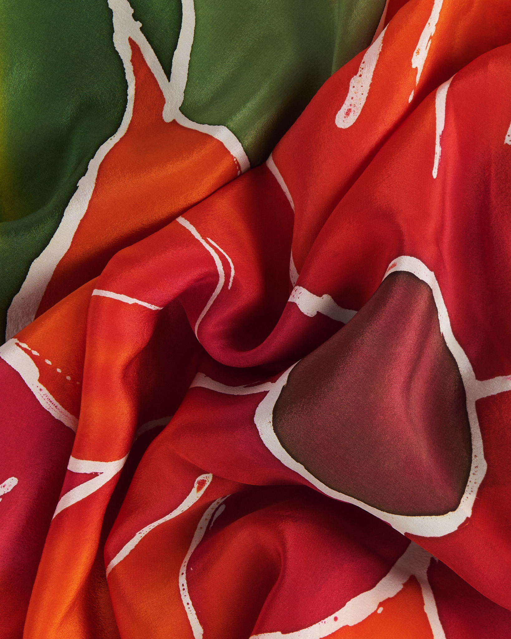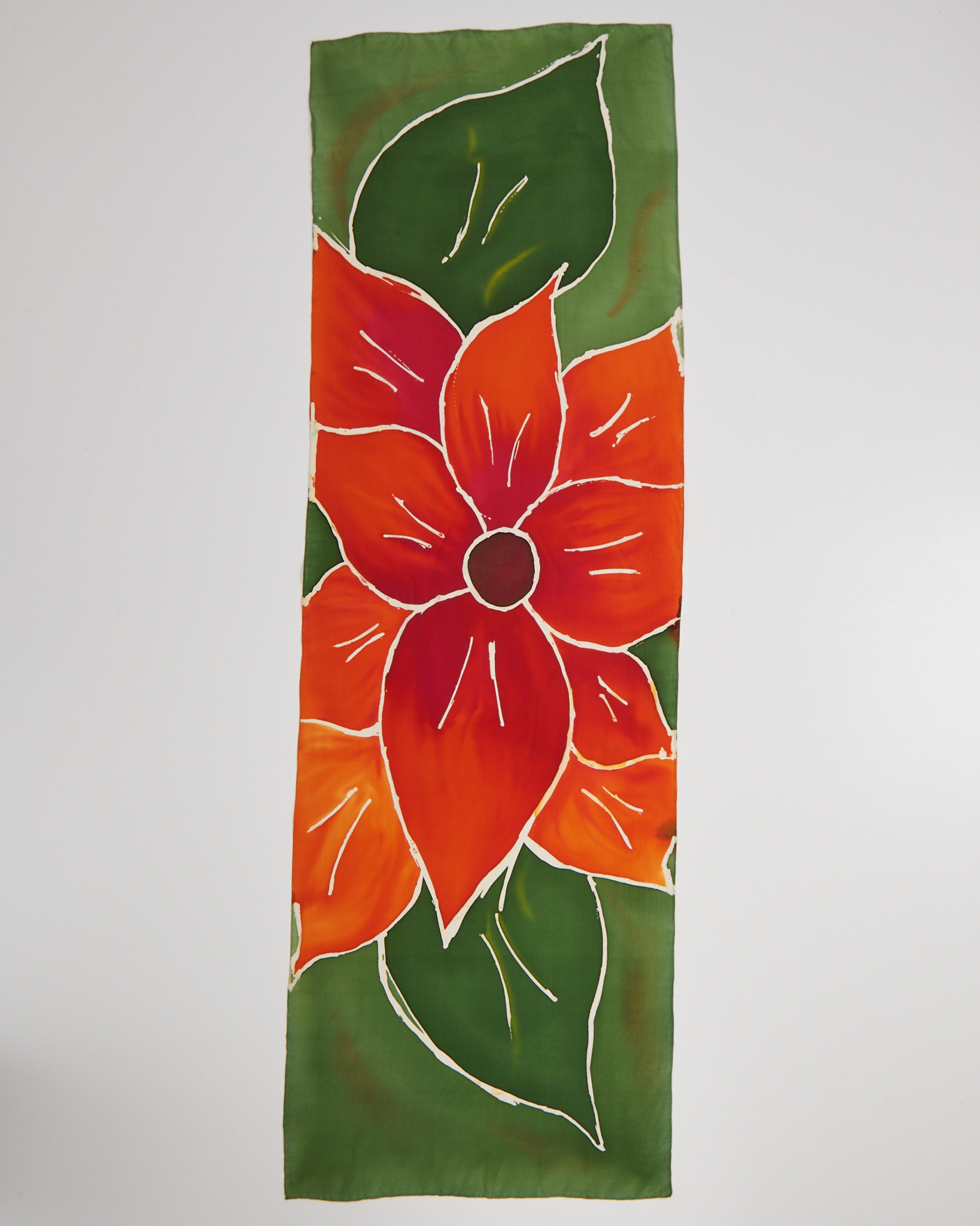 Платок с крупным цветком из гладкой ткани с мягкой шелковистой поверхностью. Выполнен в насыщенной цветовой гамме: глубокий зелёный фон и крупный цветок в красно-оранжевых оттенках