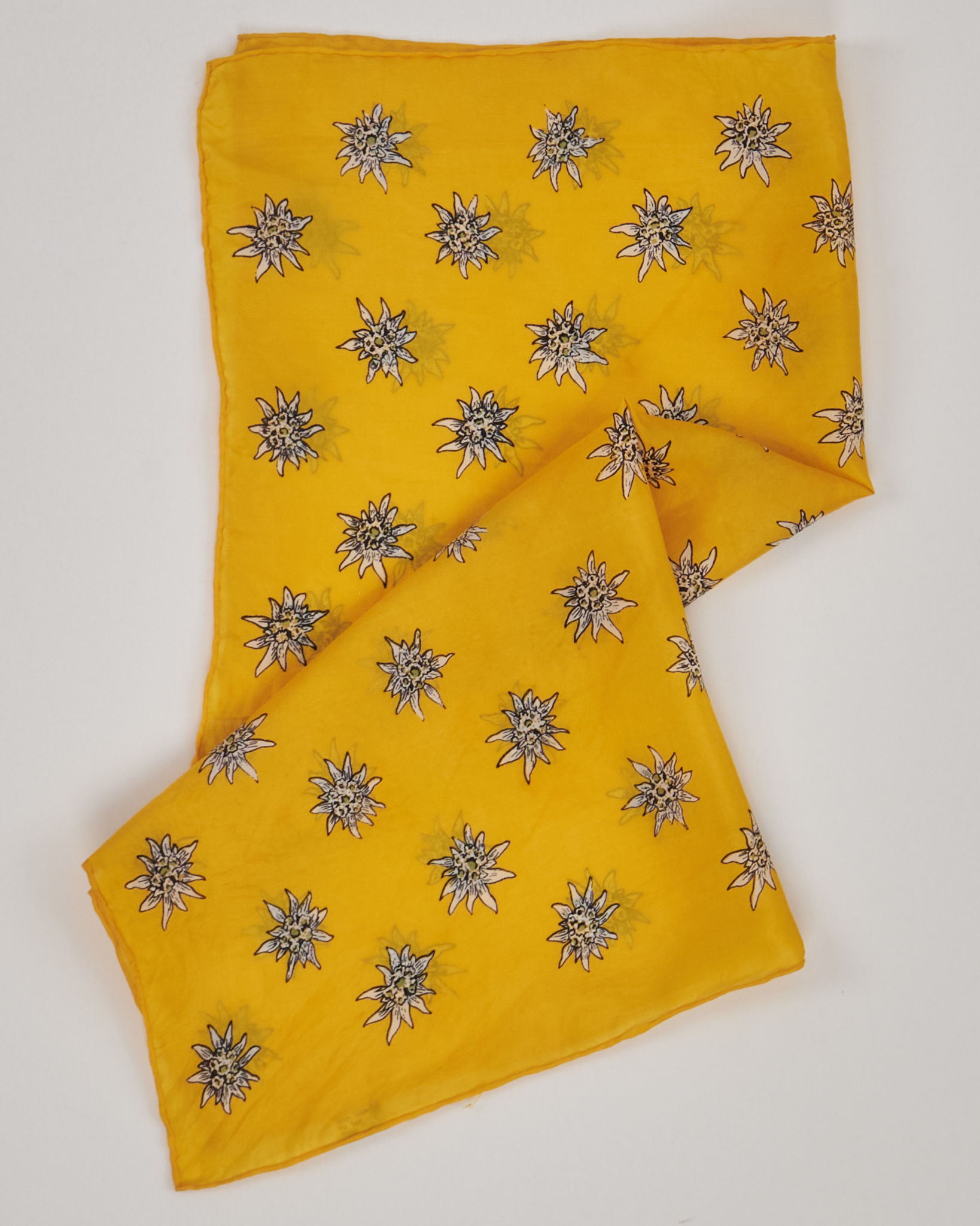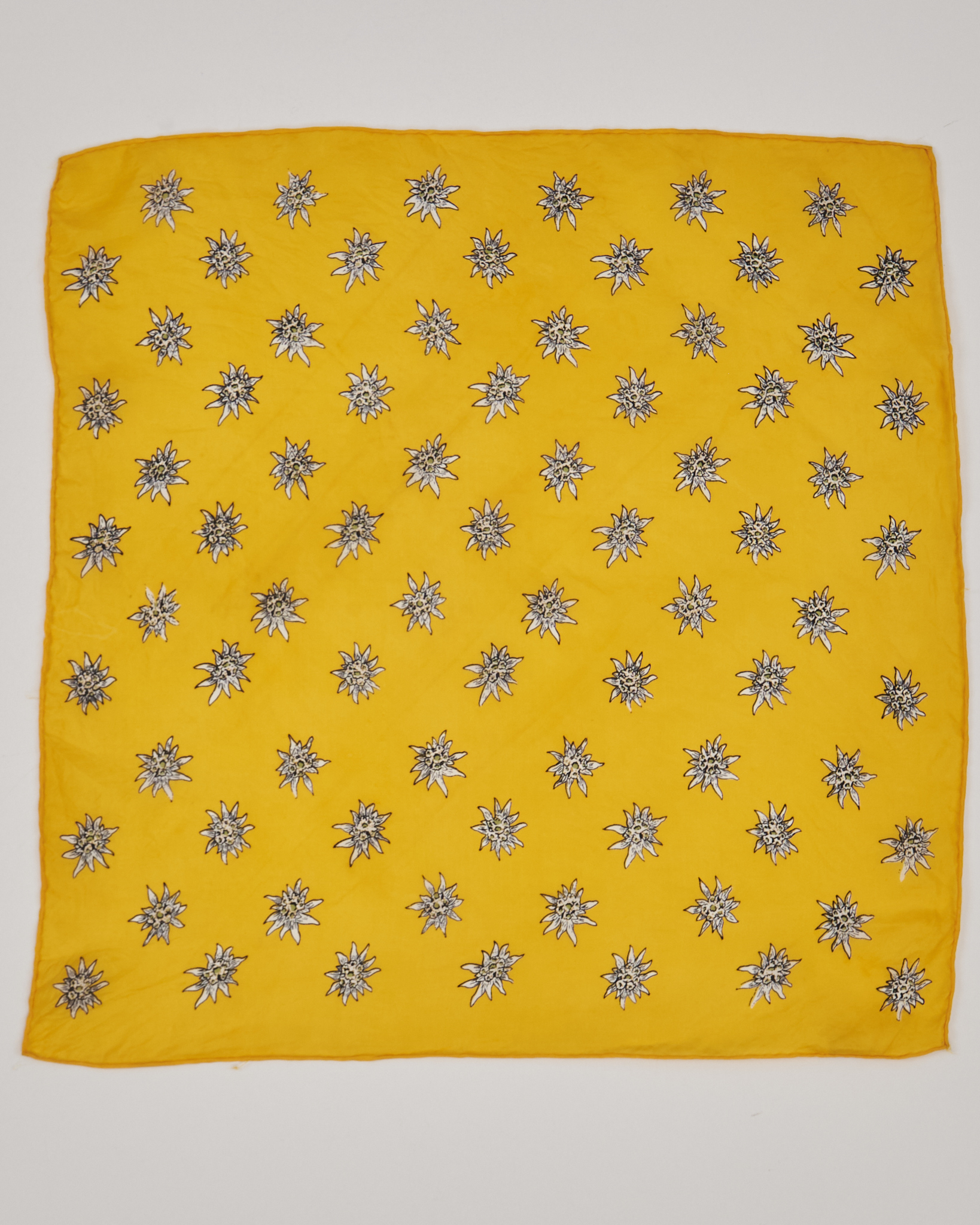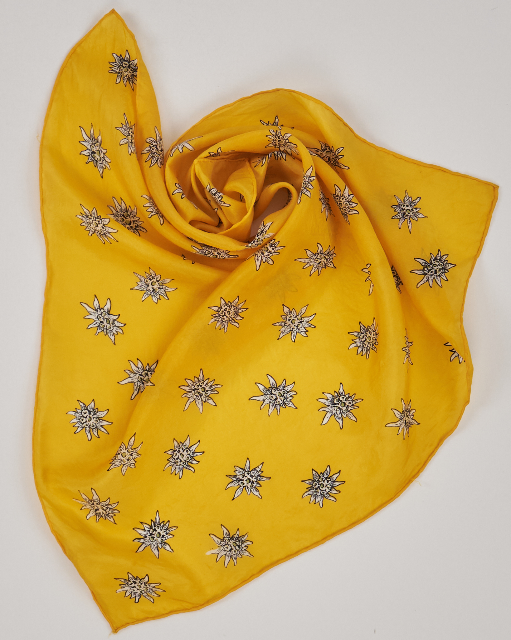 Желтый шелковый платок с элементами альпийской эстетики. Детализированный рисунок эдельвейсов.