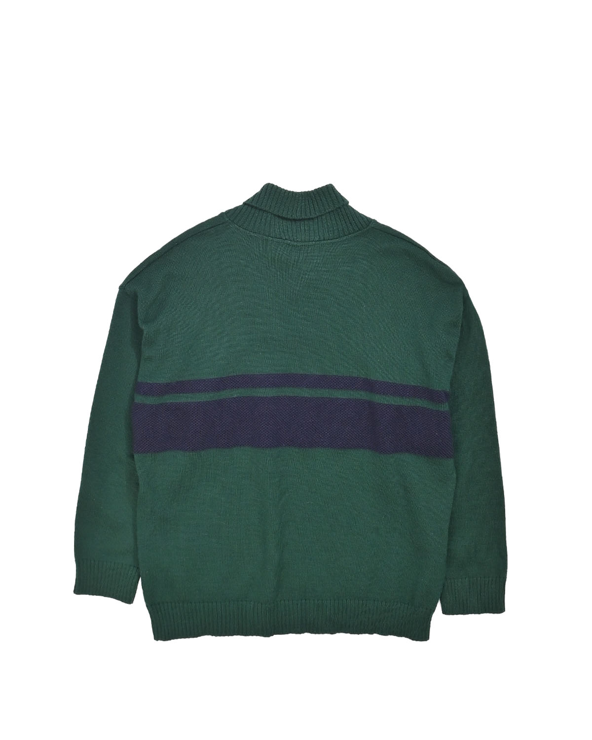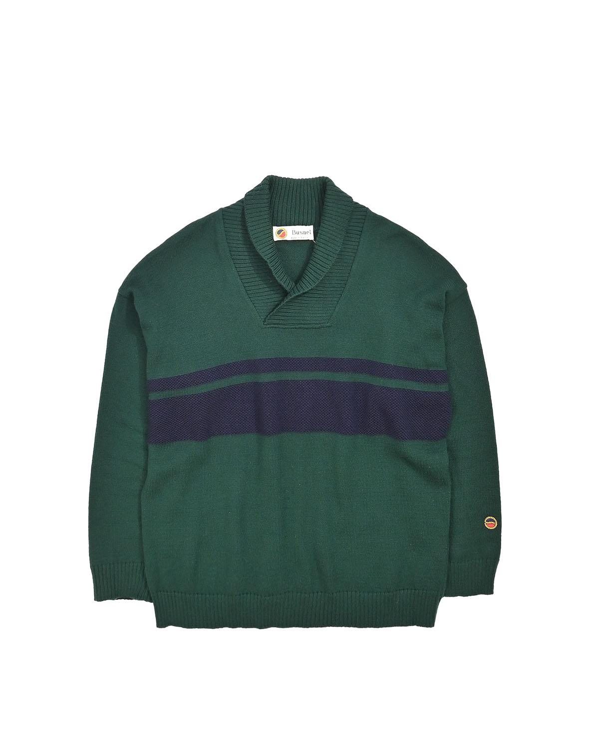 Глубокого зелёного оттенка с контрастной полосой индиго. Французский бренд Busnel — основан в 1920-х и известен морской эстетикой и безупречным качеством трикотажа. Характерный воротник шалька и прямой крой отсылают к стилю спортивных свитеров. Оригинальное французское изделие, сохраняющее дух винтажного casual.