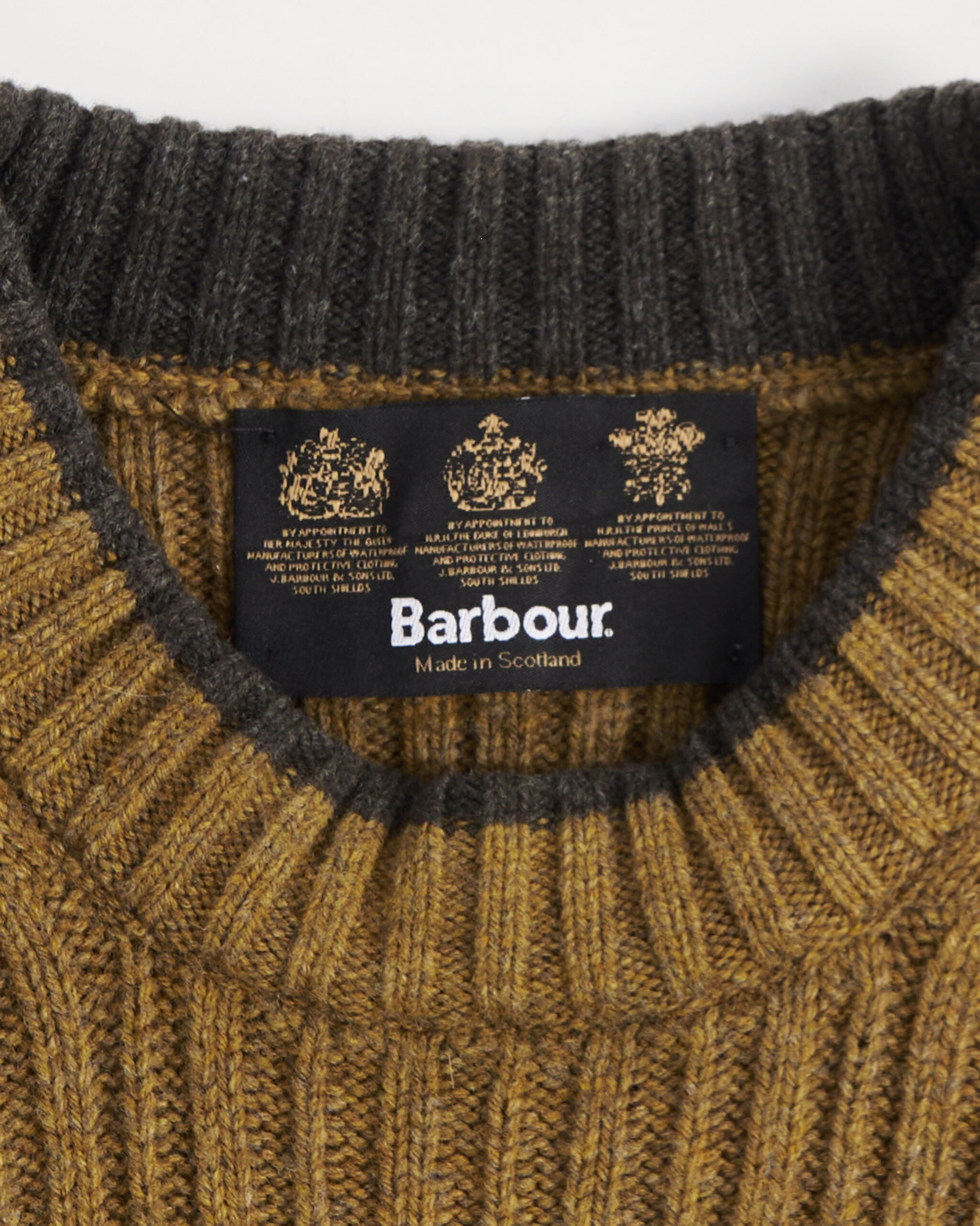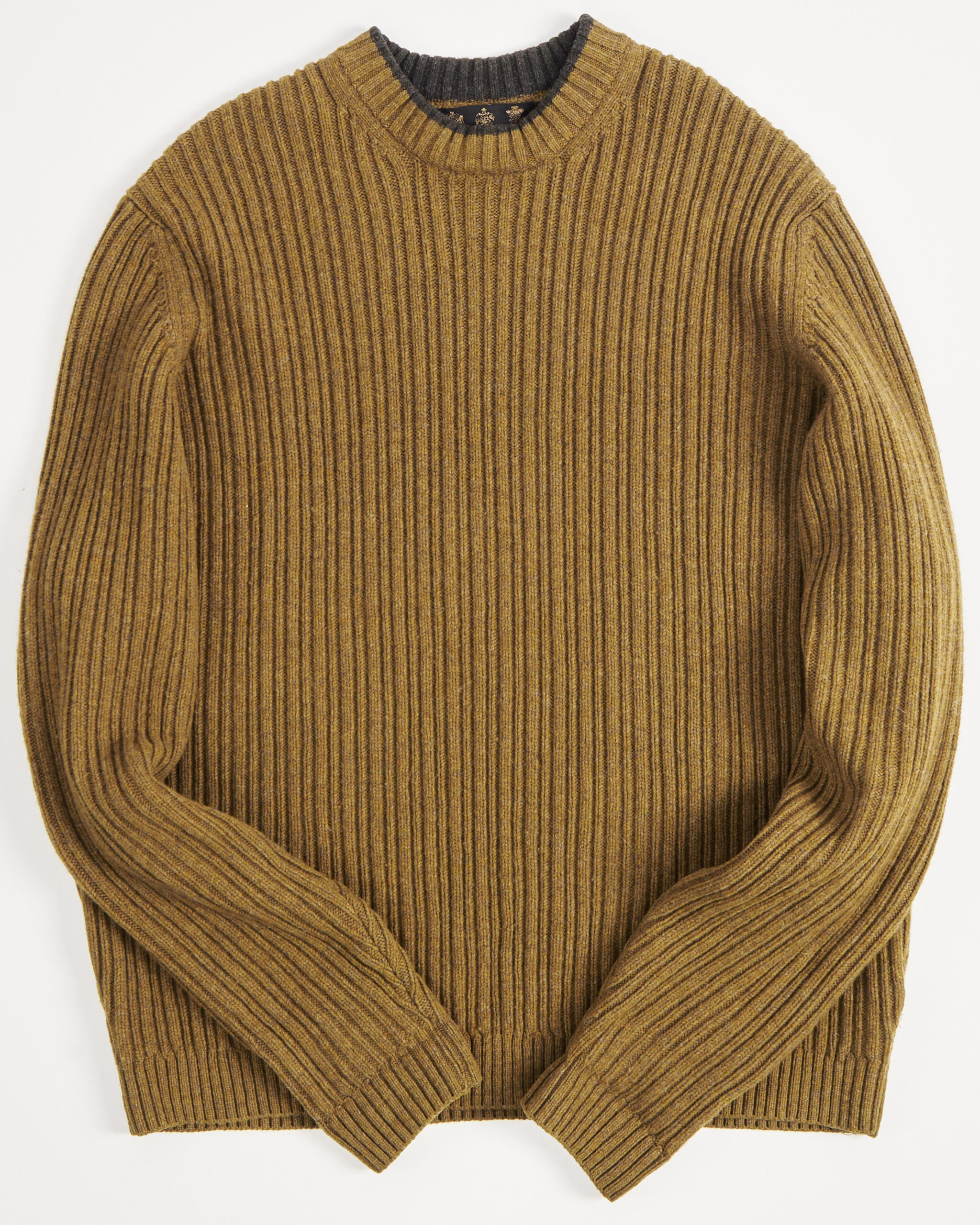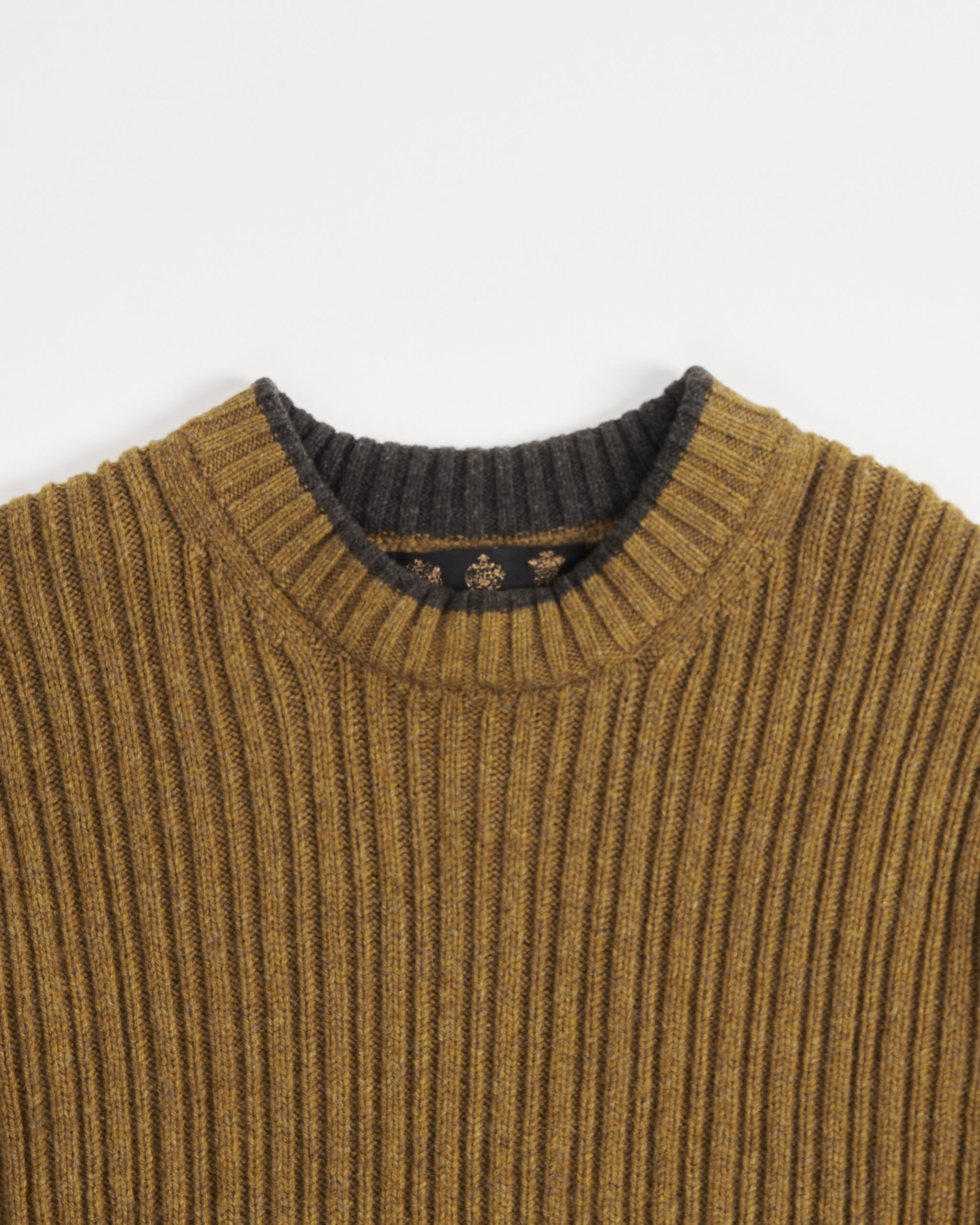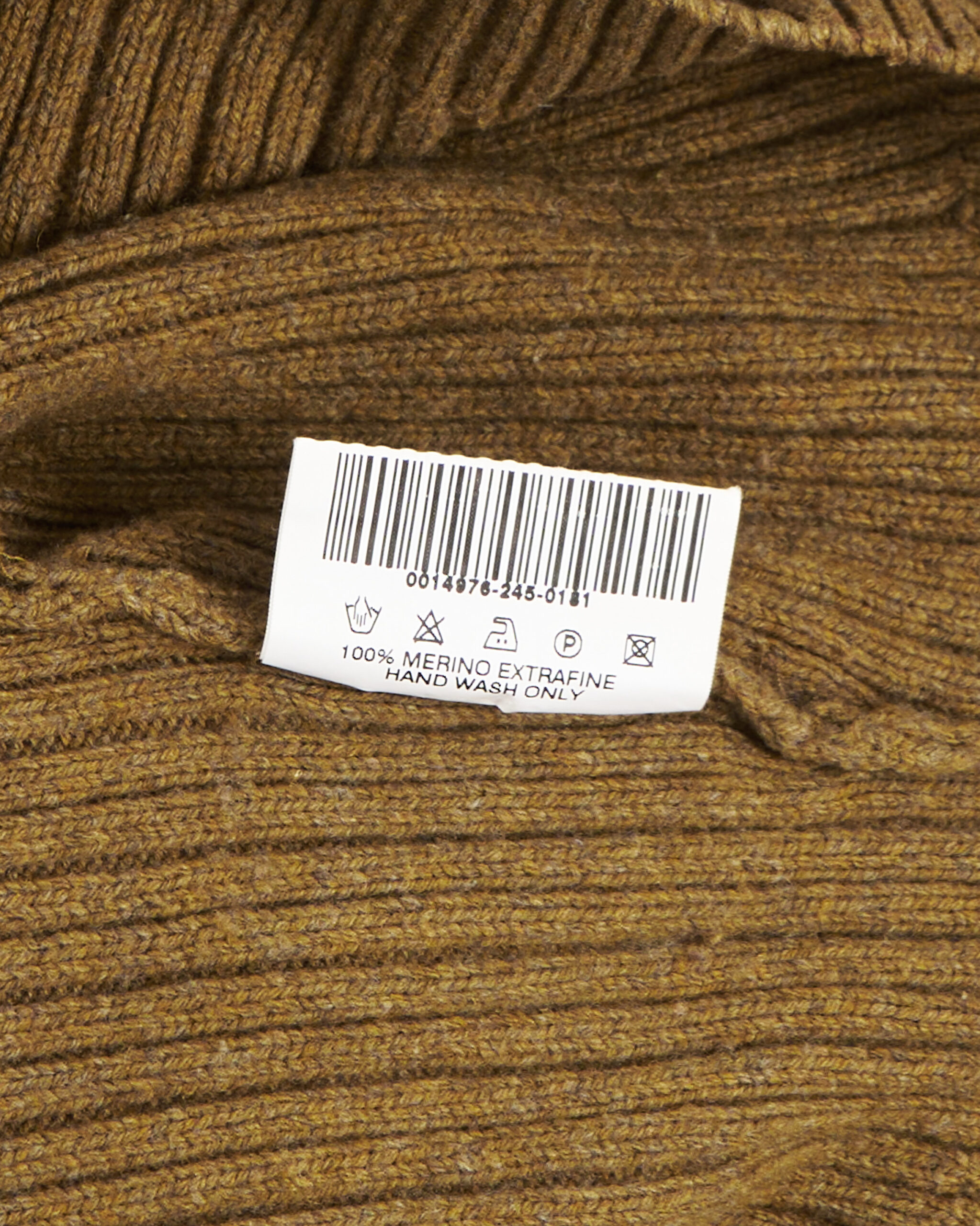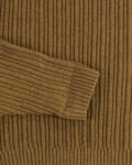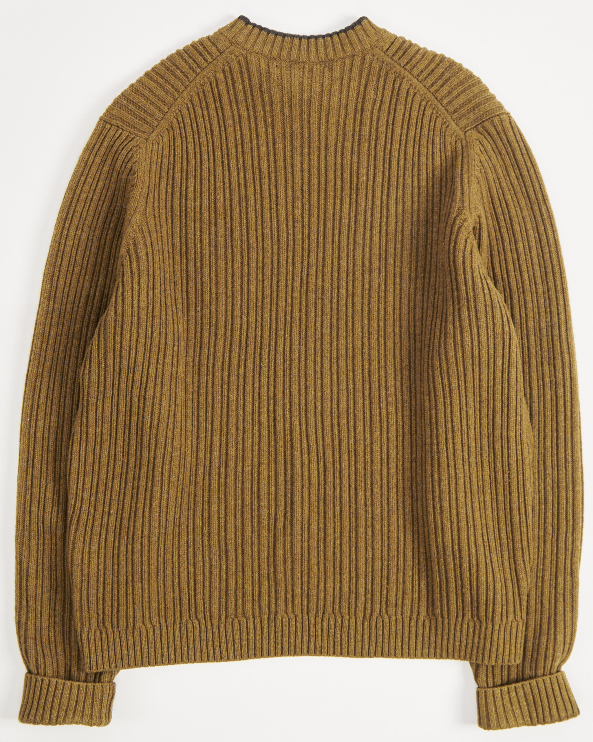 Объёмный свитер из плотной шерсти крупной вязки в тёплом горчичном оттенке. Мягкая текстура и вертикальная фактура вязки. Посадка свободная, со слегка спущенным плечом — характерная черта винтажных моделей девяностых. Материал плотный, немного ворсистый, не колючий.