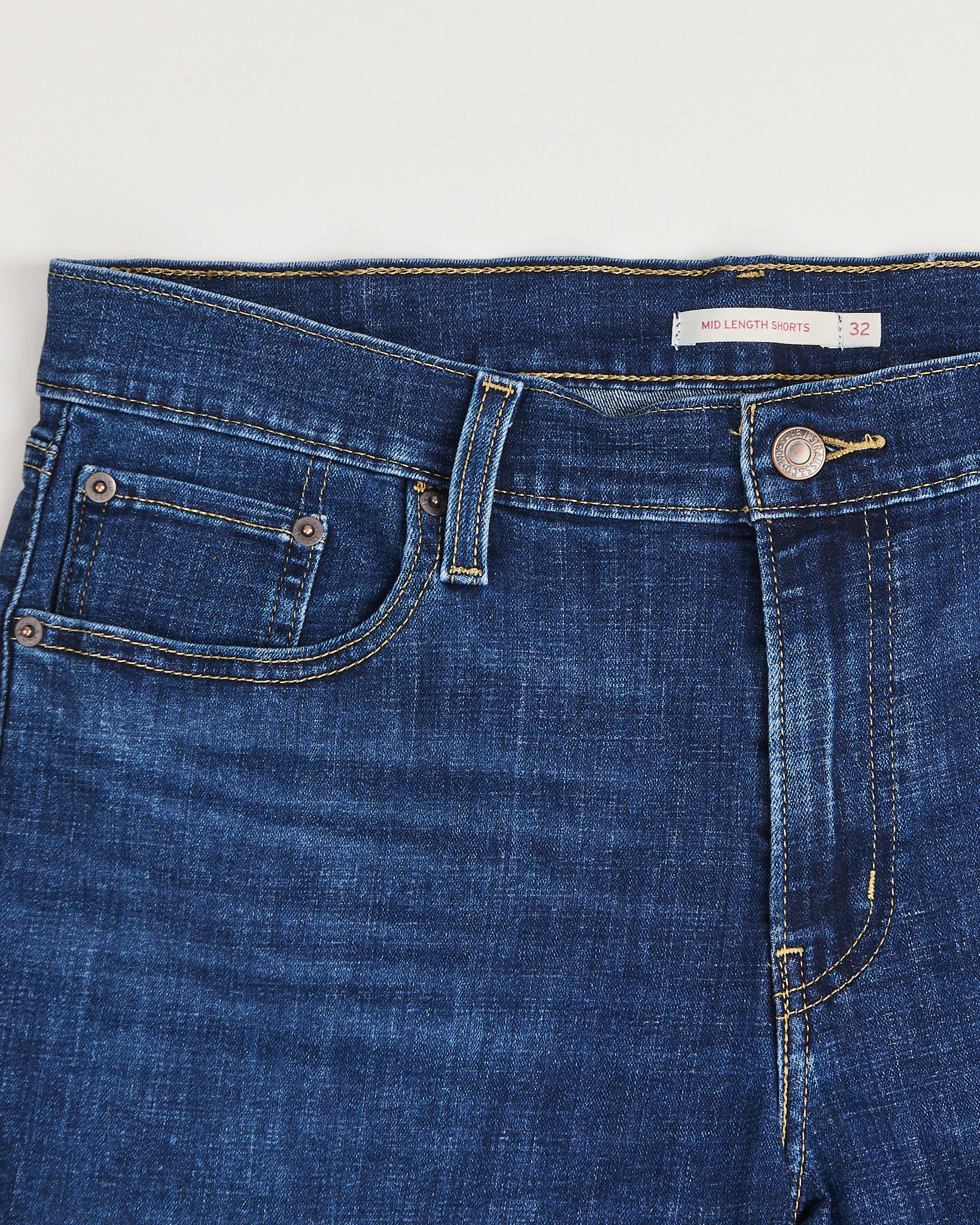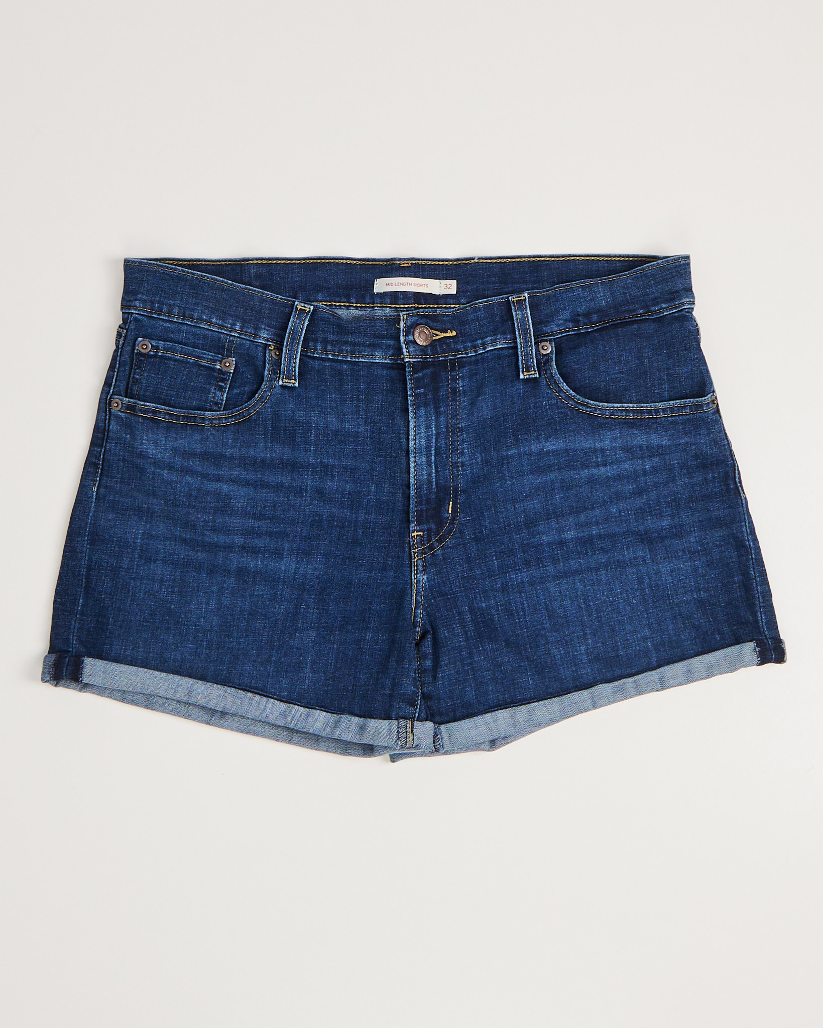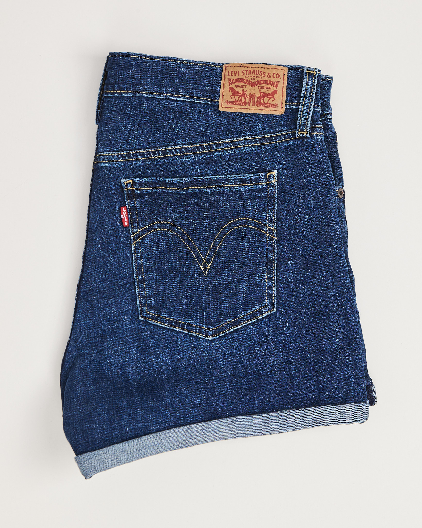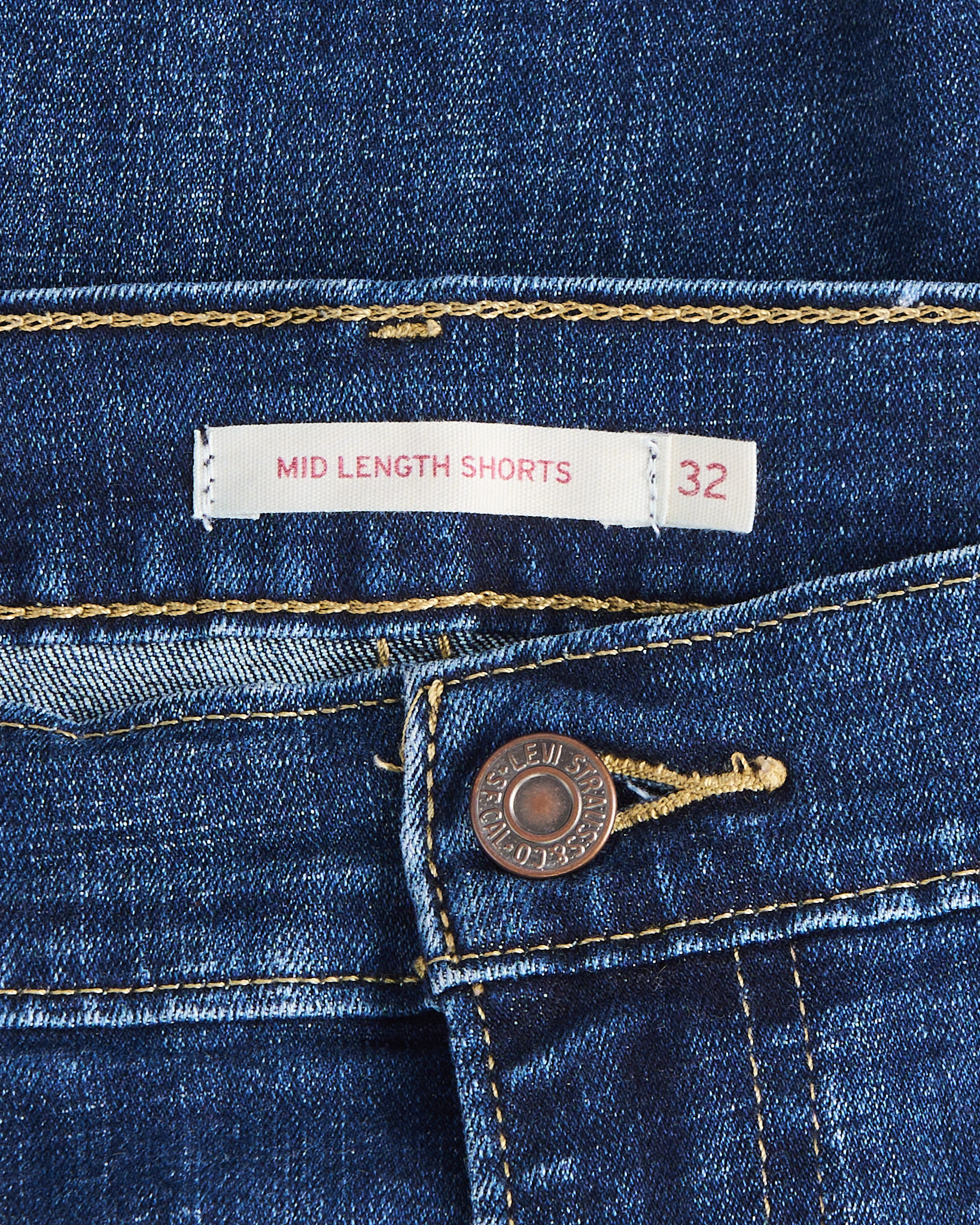 Джинсовые шорты Levi’s насыщенного синего цвета. Посадка на талии. Средняя длина с аккуратным подворотом по низу. Функциональные карманы. Металлические заклепки. На поясе фирменный кожаный патч и красный ярлык на заднем кармане.