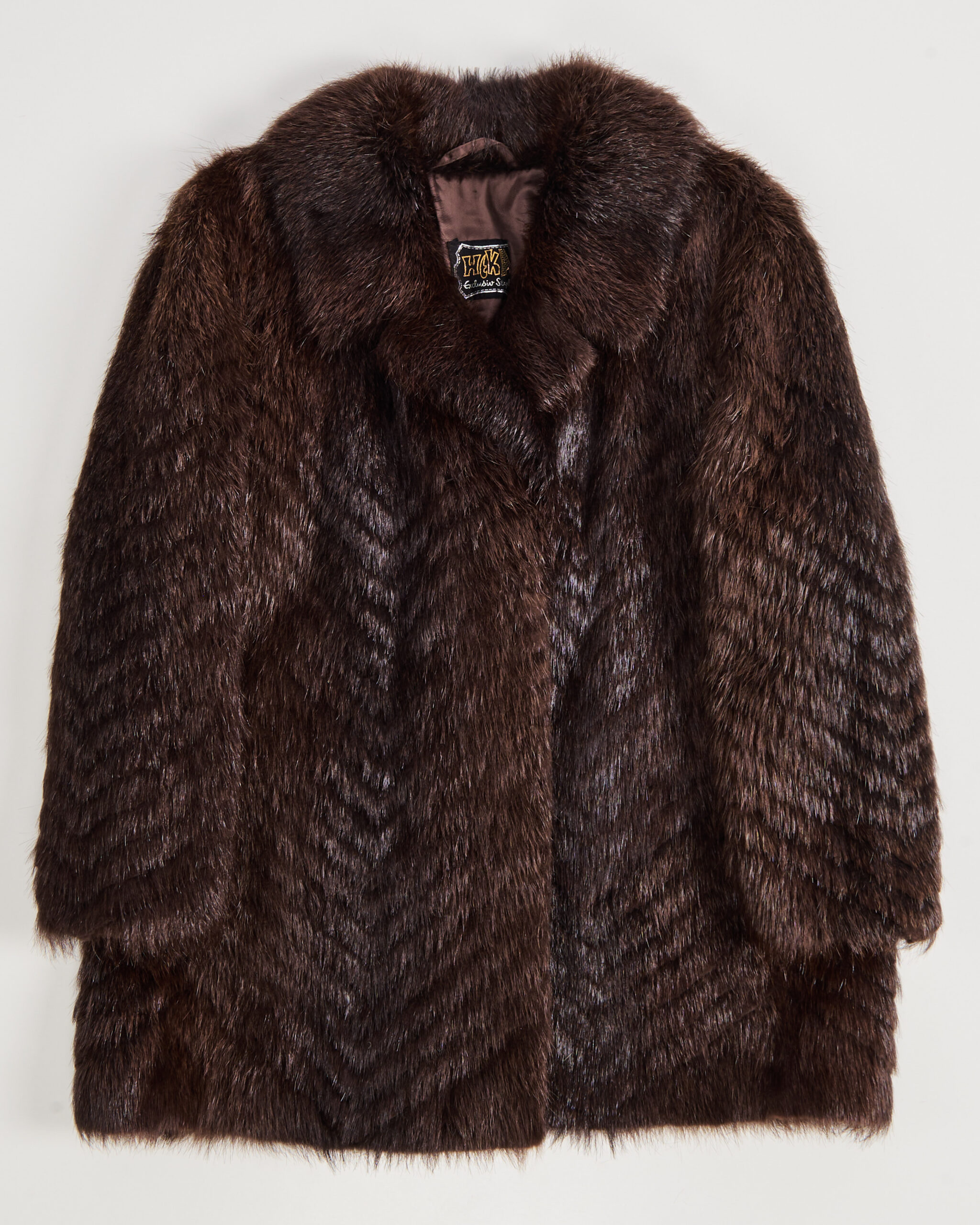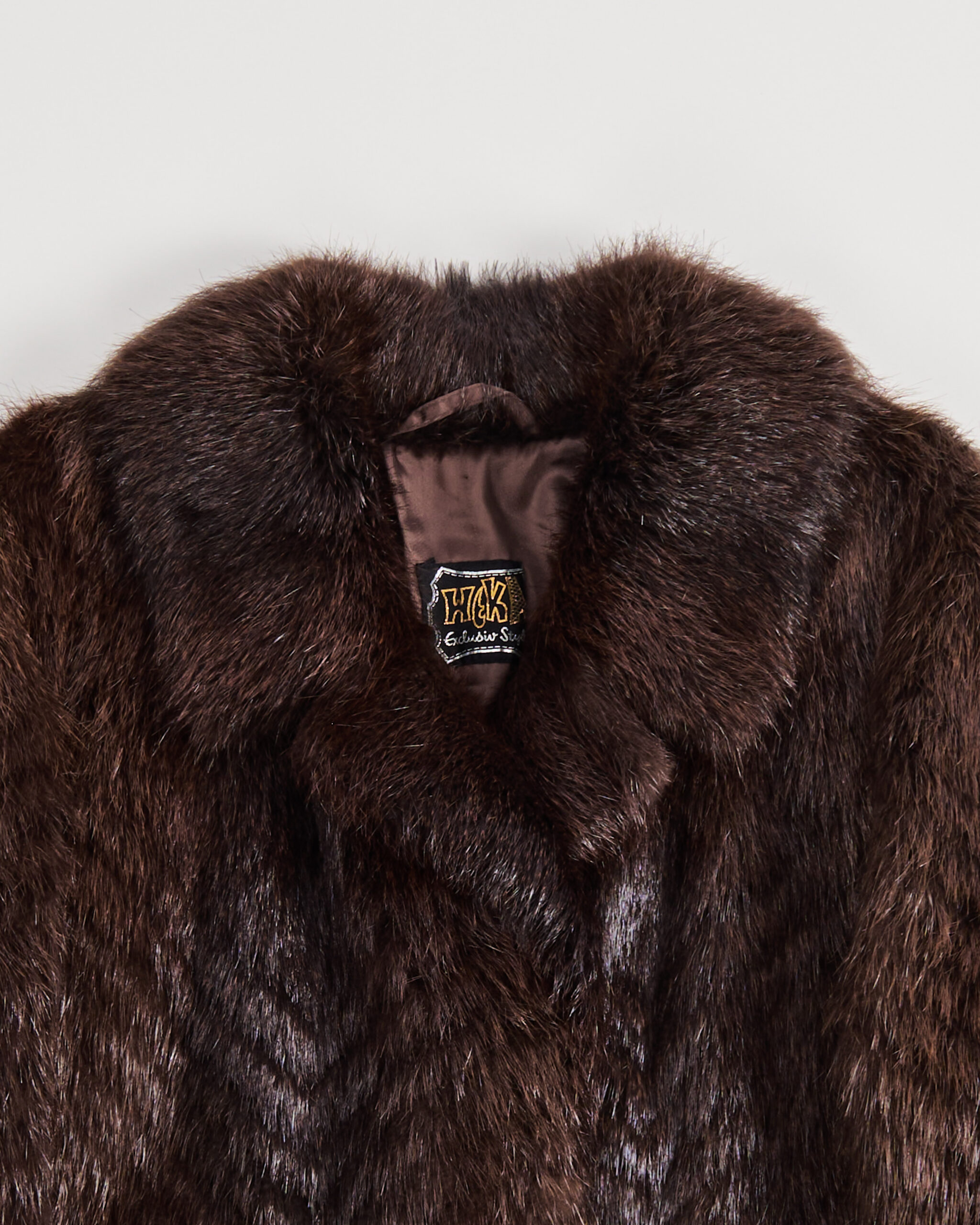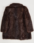 Модель создана из густого меха глубокого шоколадного оттенка. Мех плотный на ощупь, с упругими гладкими волосками, создаёт приятное тактильное ощущение. V-образный рисунок выкладки делает вещь заметной и редкой для современного винтажного рынка. Посадка прямая, крупный воротник формирует выразительный акцент.