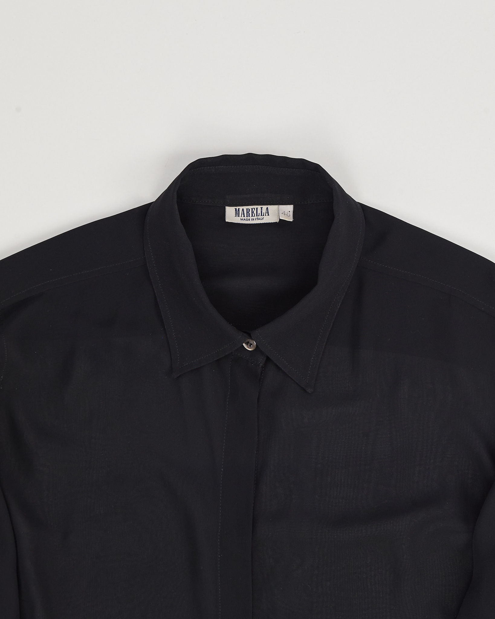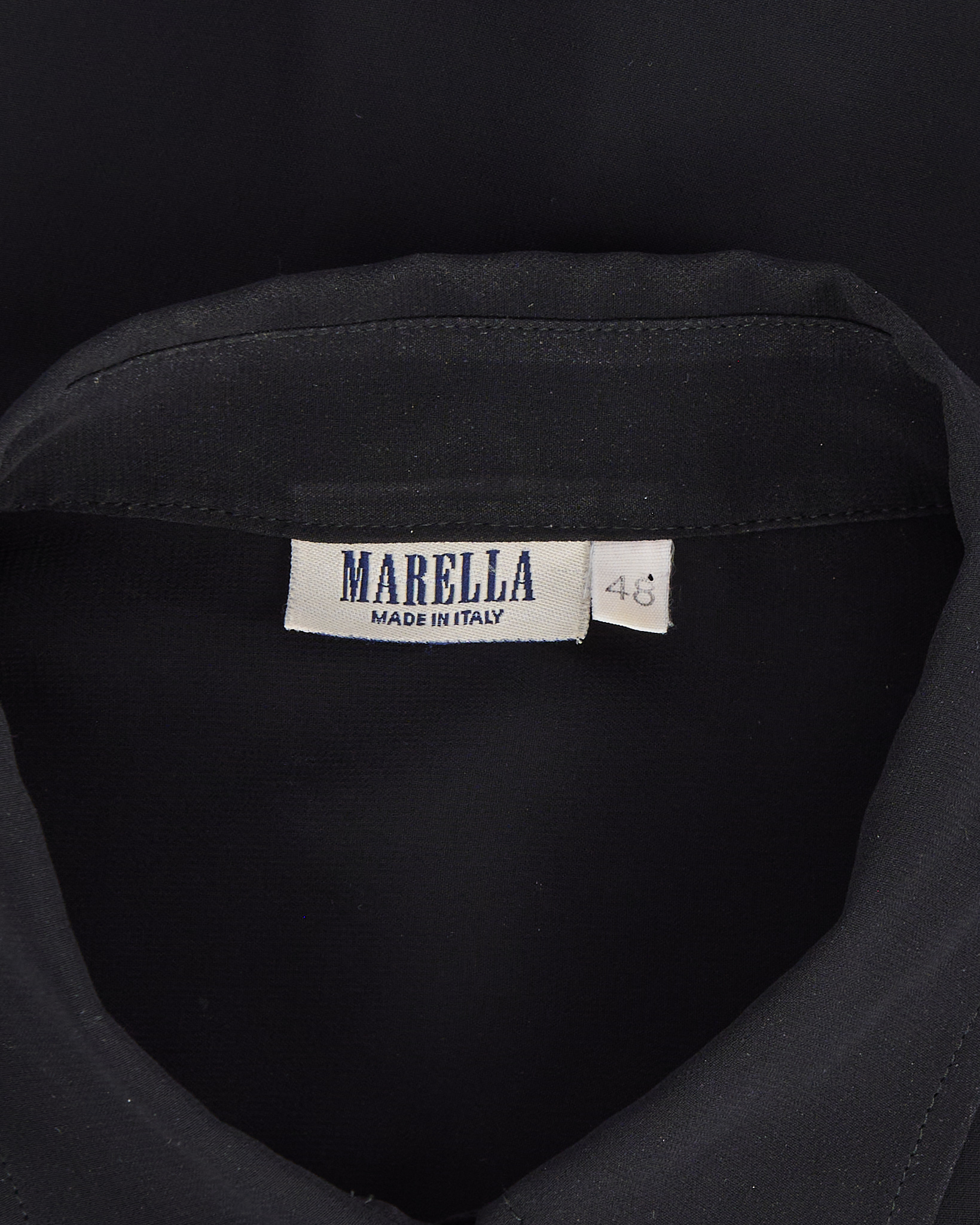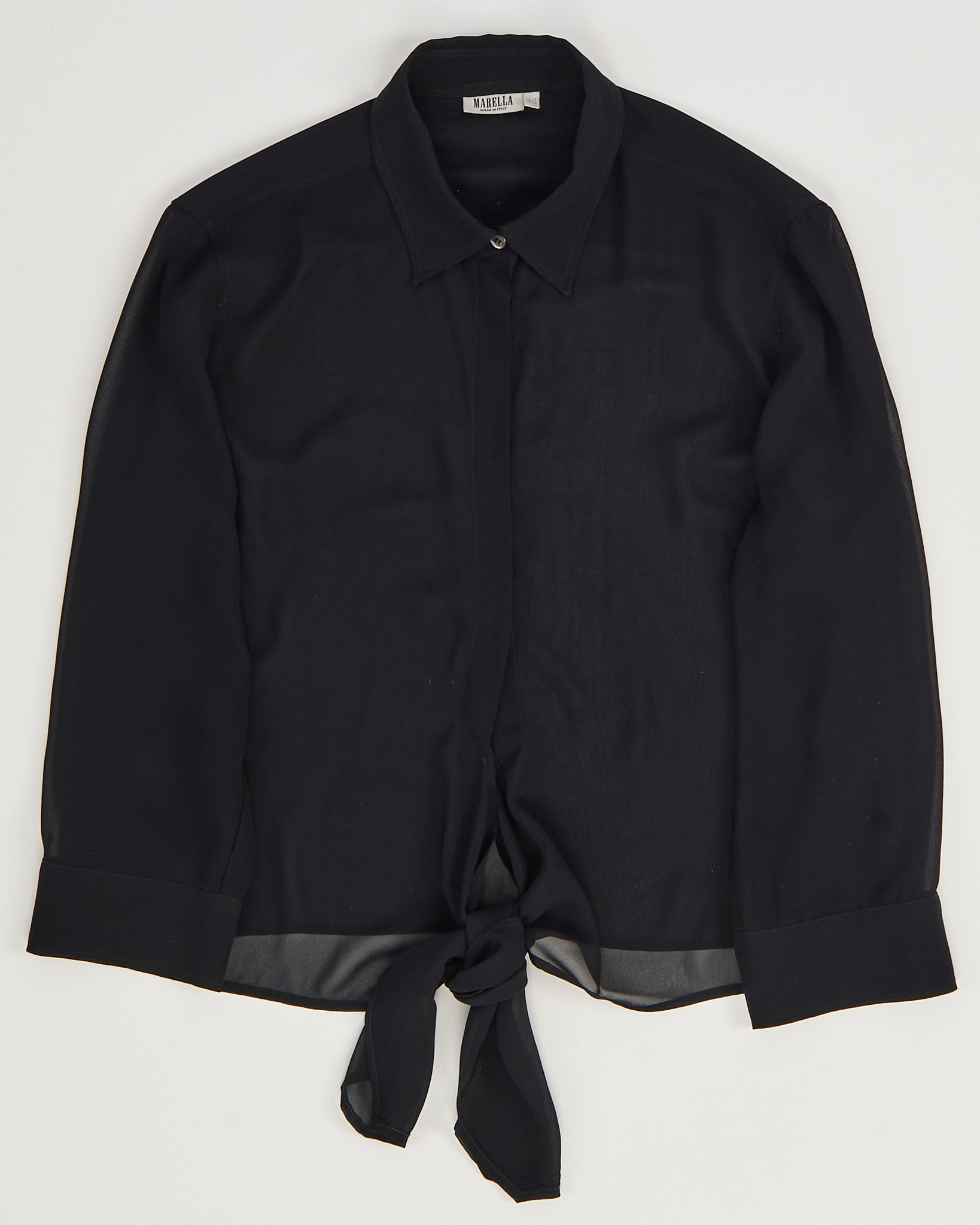 Чёрная блуза Marella из лёгкой ткани. Прямая посадка, завязка по нижнему краю, акцентные вытачки на груди.
