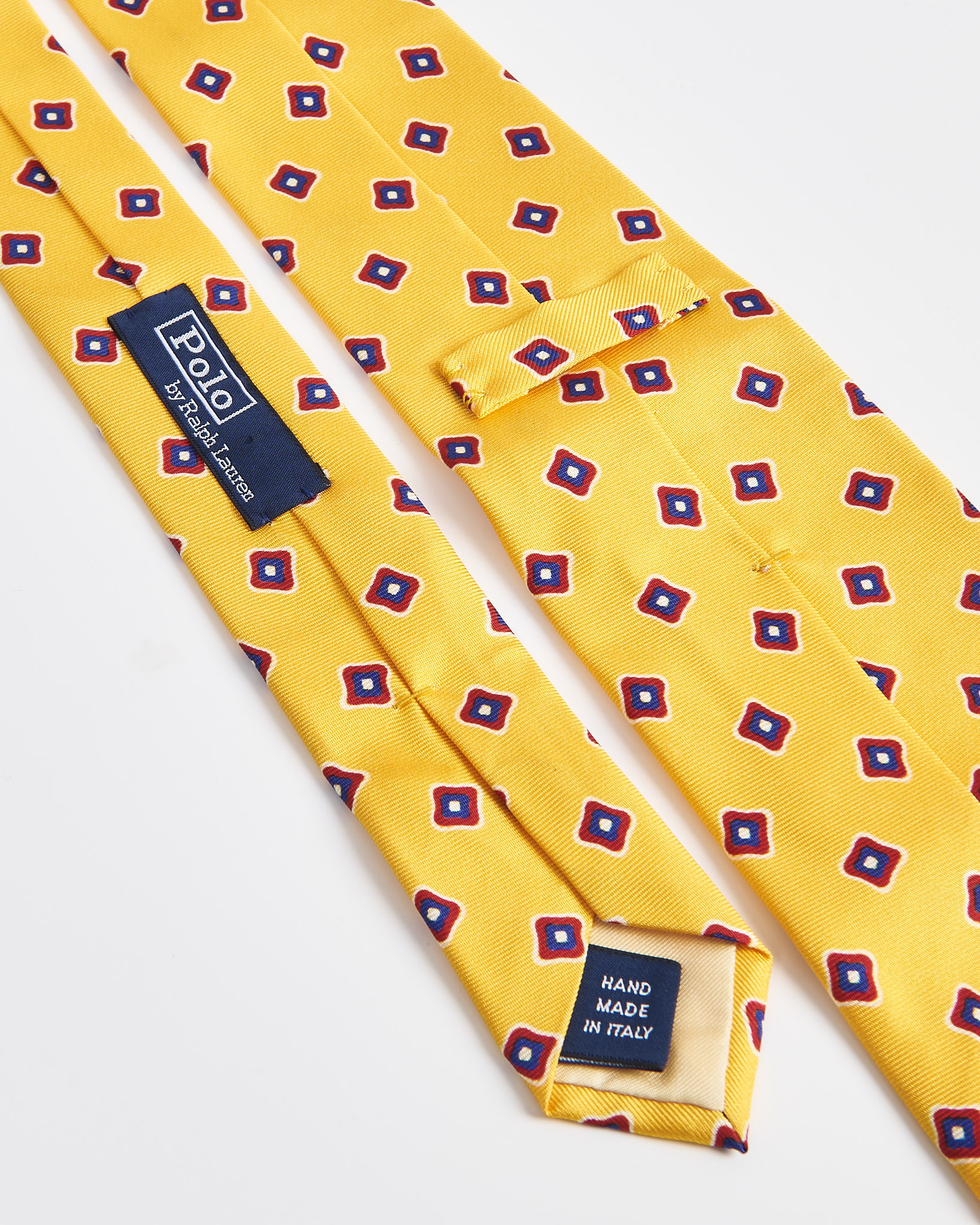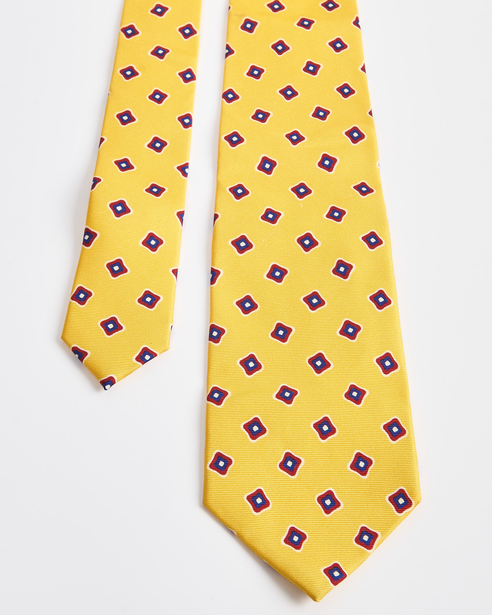 Галстук из плотного шёлка, классическая ширина. Геометрический орнамент на тёплом жёлтом фоне. Ручная работа и производство в Италии.