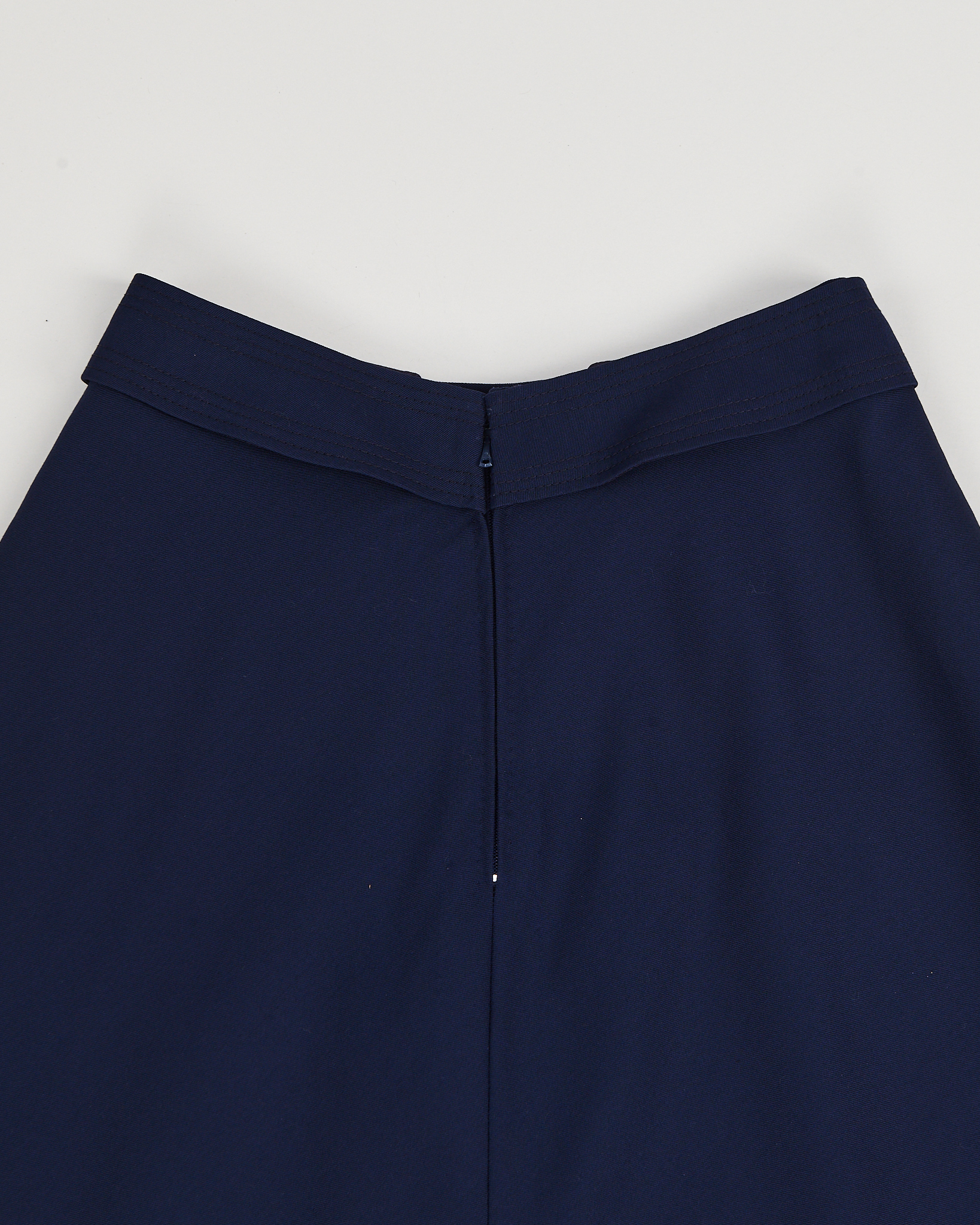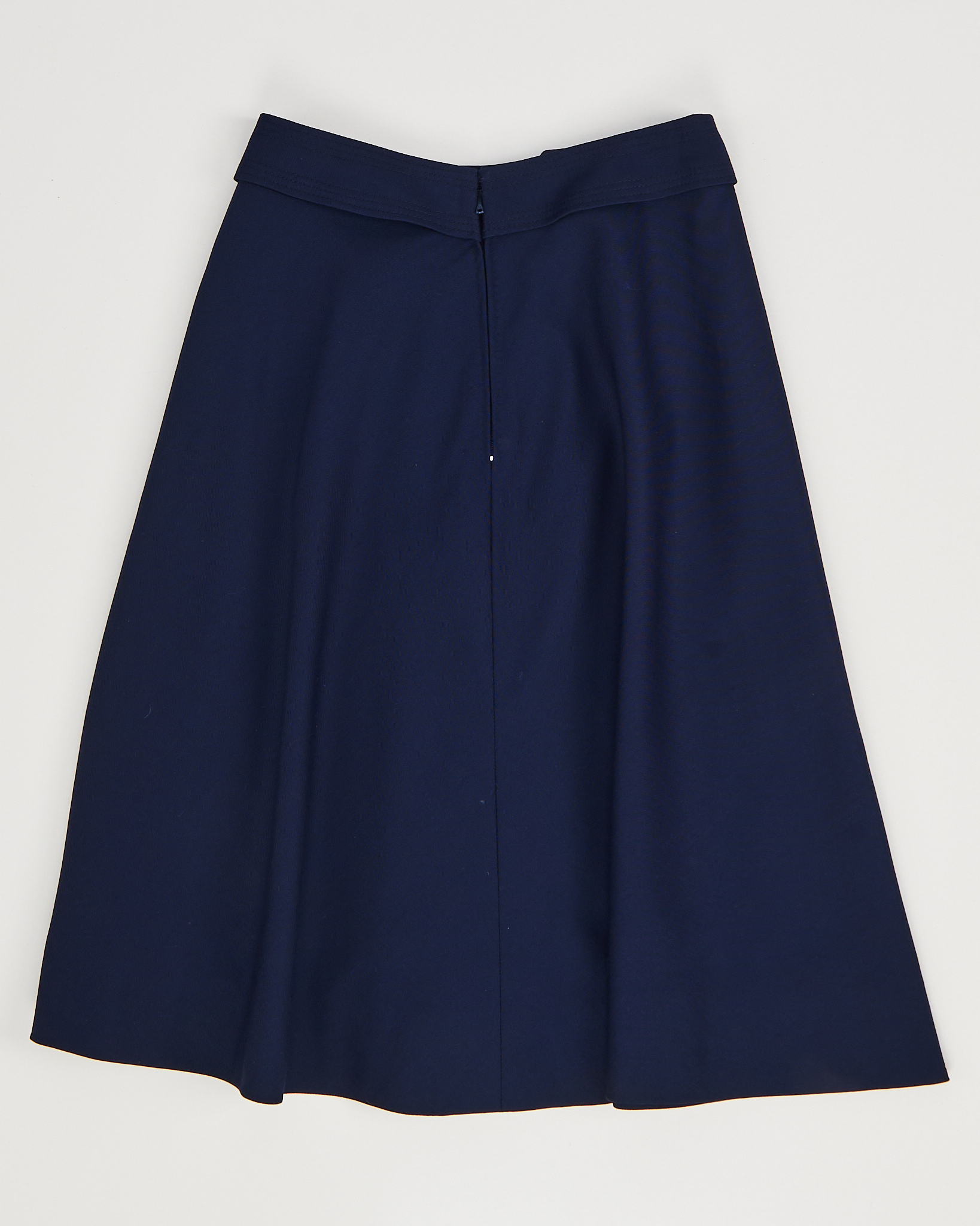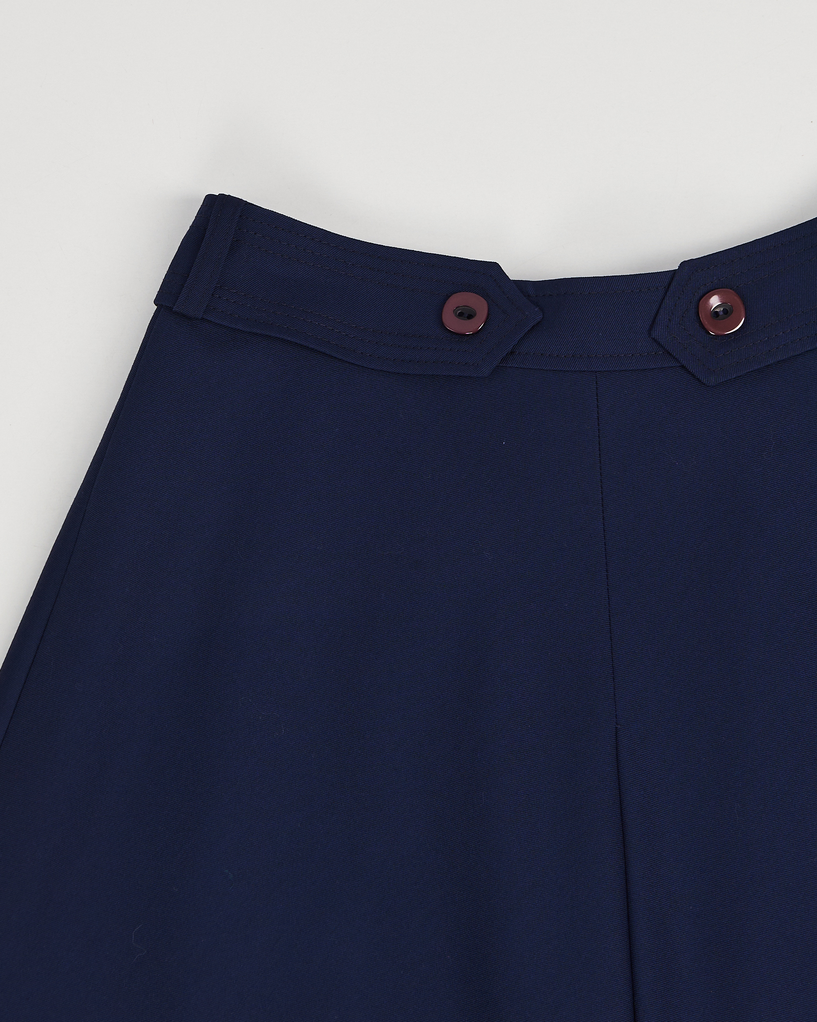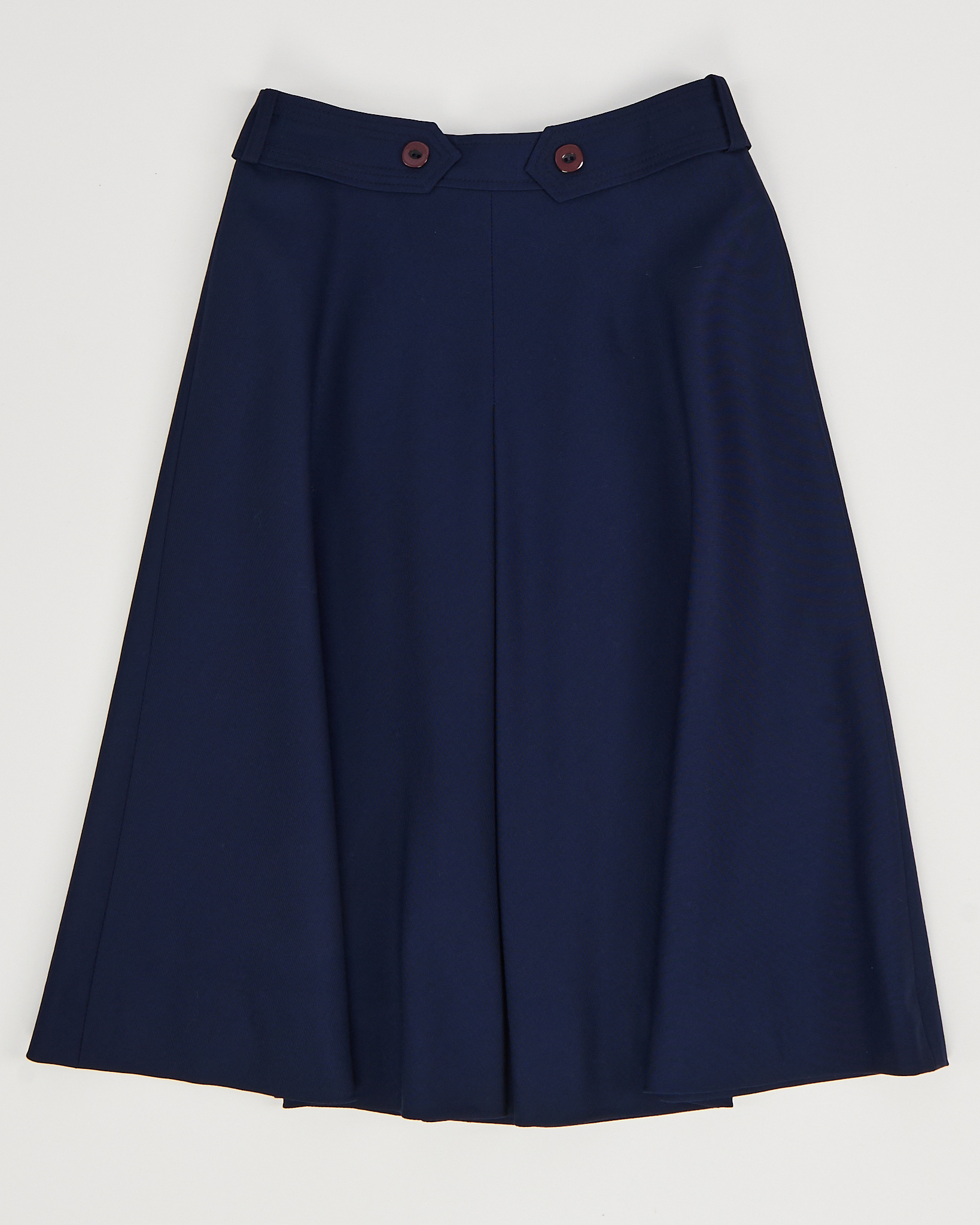 Шерстяная юбка миди в темно-синем цвете. Классический крой, высокая посадка, А-силуэт, плотная ткань, декоративные пуговицы на поясе. Спереди центральная складка, застежка сзади на потайную молнию и крючок.  Строгий ретро и деловой преппи.