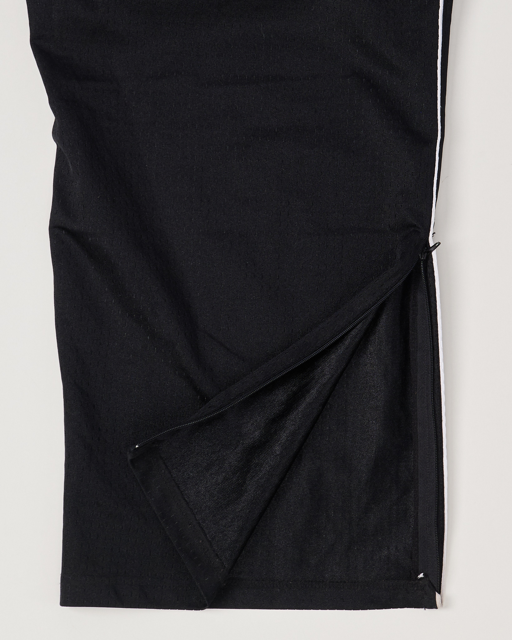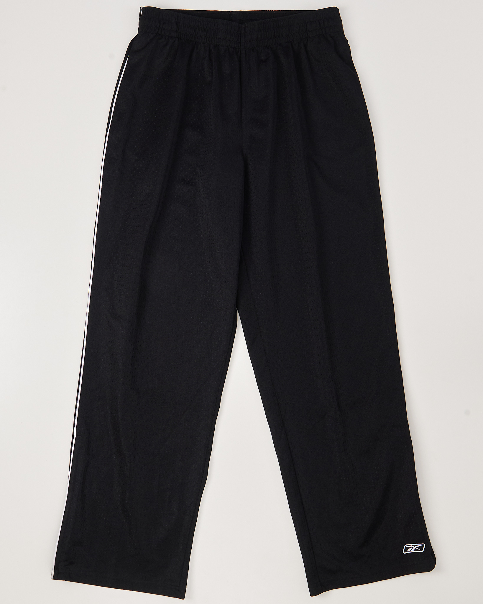 Спортивные брюки Reebok. Модель с поясом на резинке выполнена с белой строчкой по бокам. По линии боковых швов - открытые карманы без молнии.