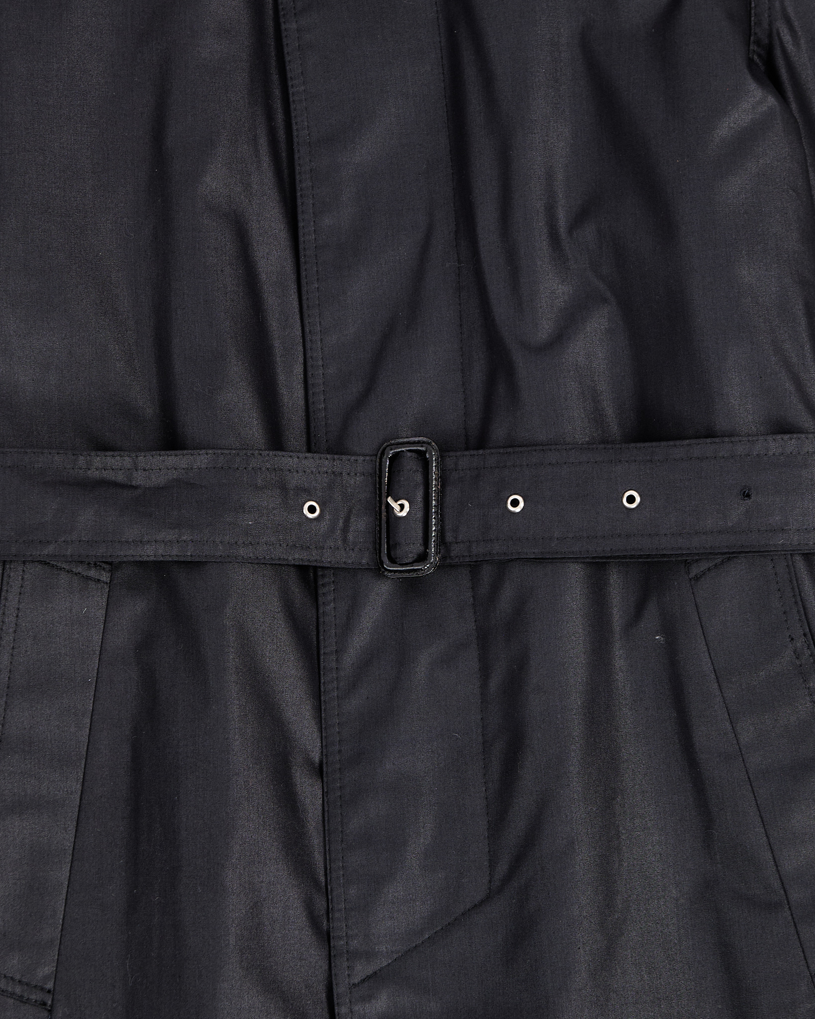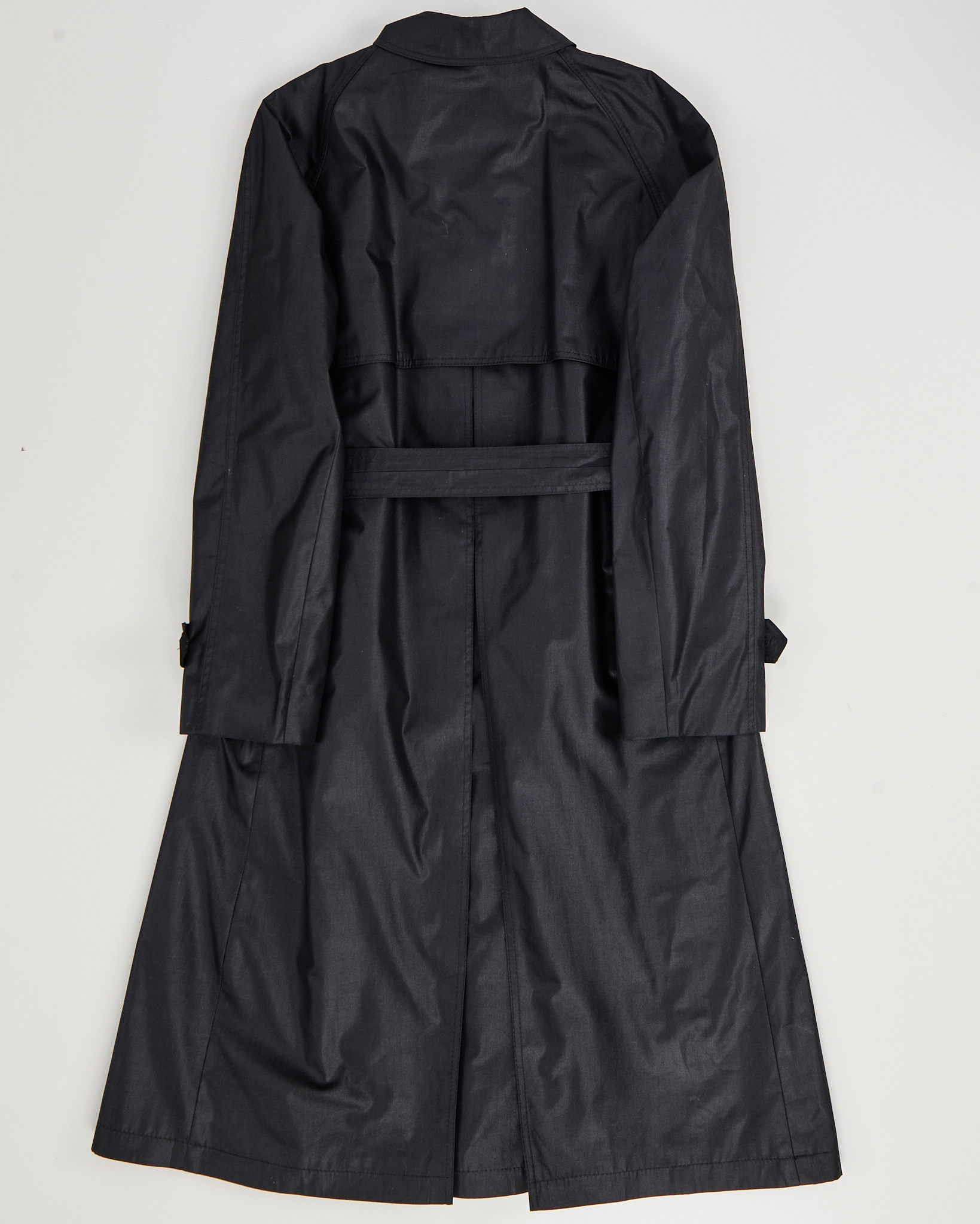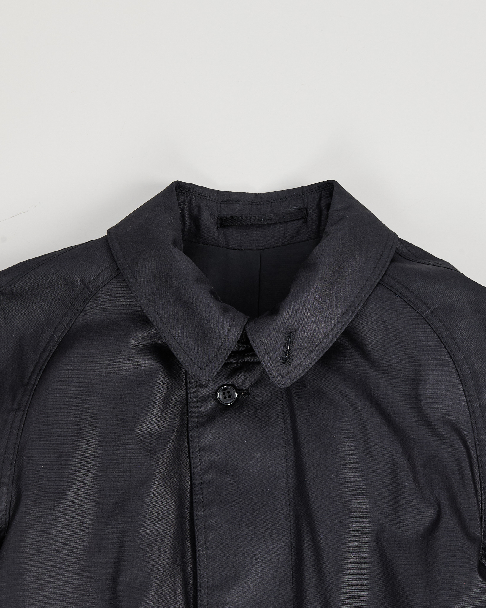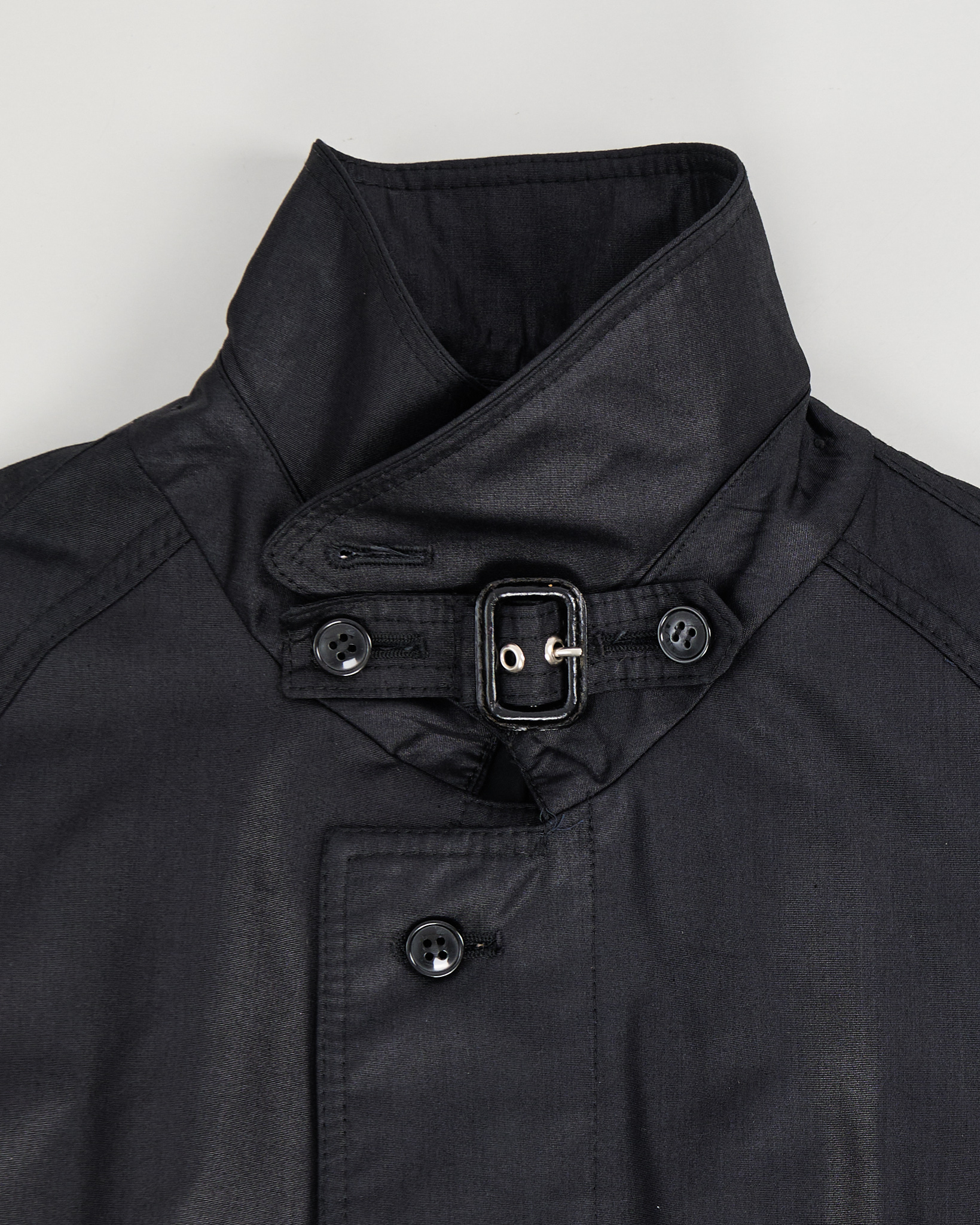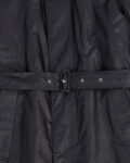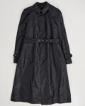 Винтажный черный плащ с акцентным воротником. Гладкая плотная ткань с деликатным блеском. Прямой крой свободно садится по фигуре, а широкий пояс позволяет регулировать посадку. Сложный высокий воротник с металлической пряжкой.