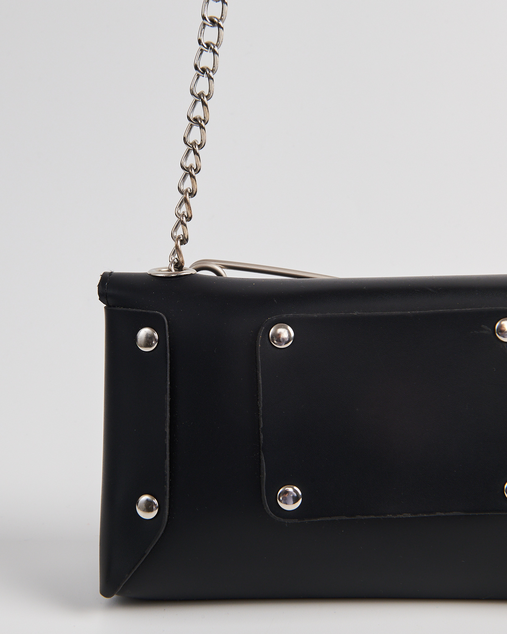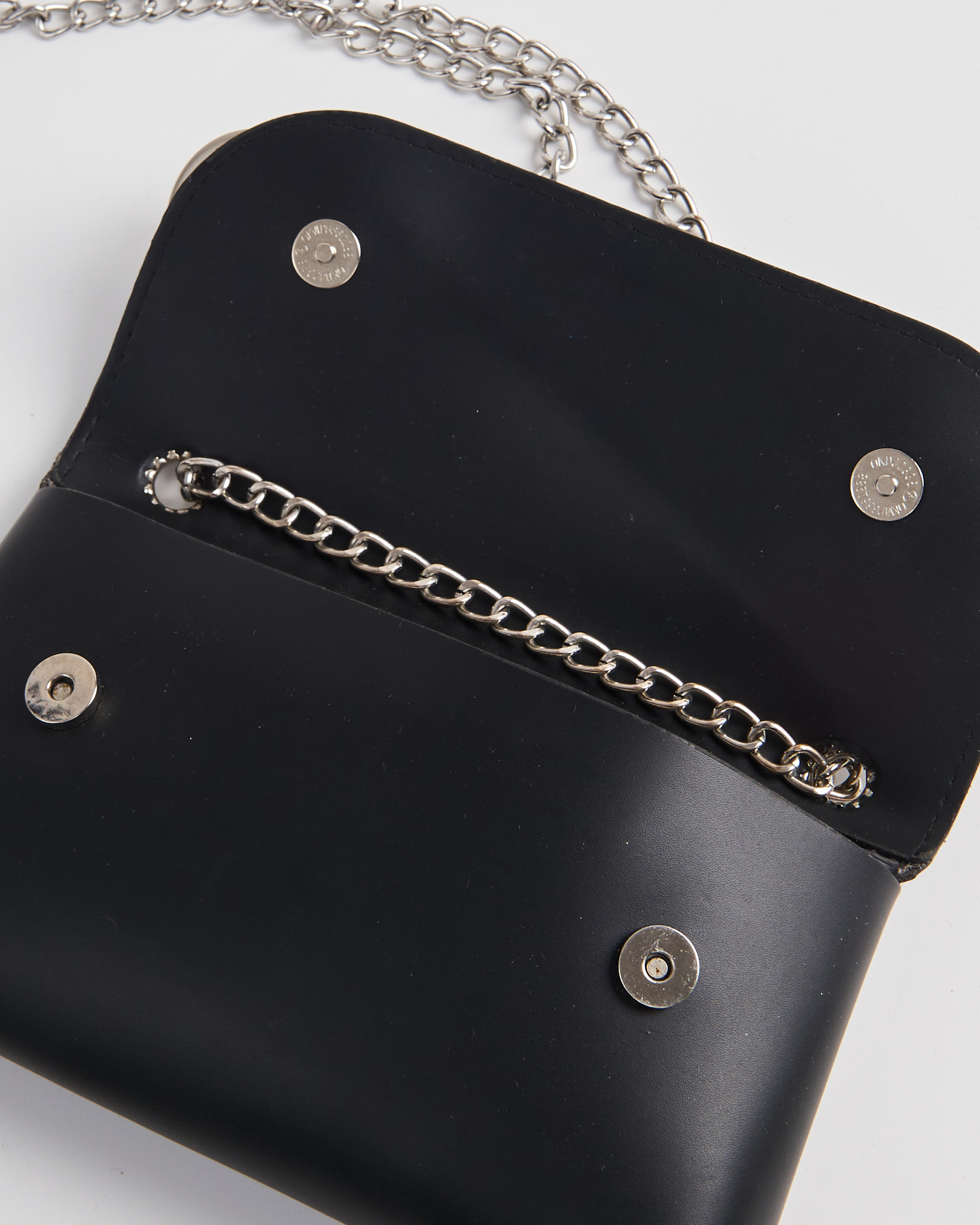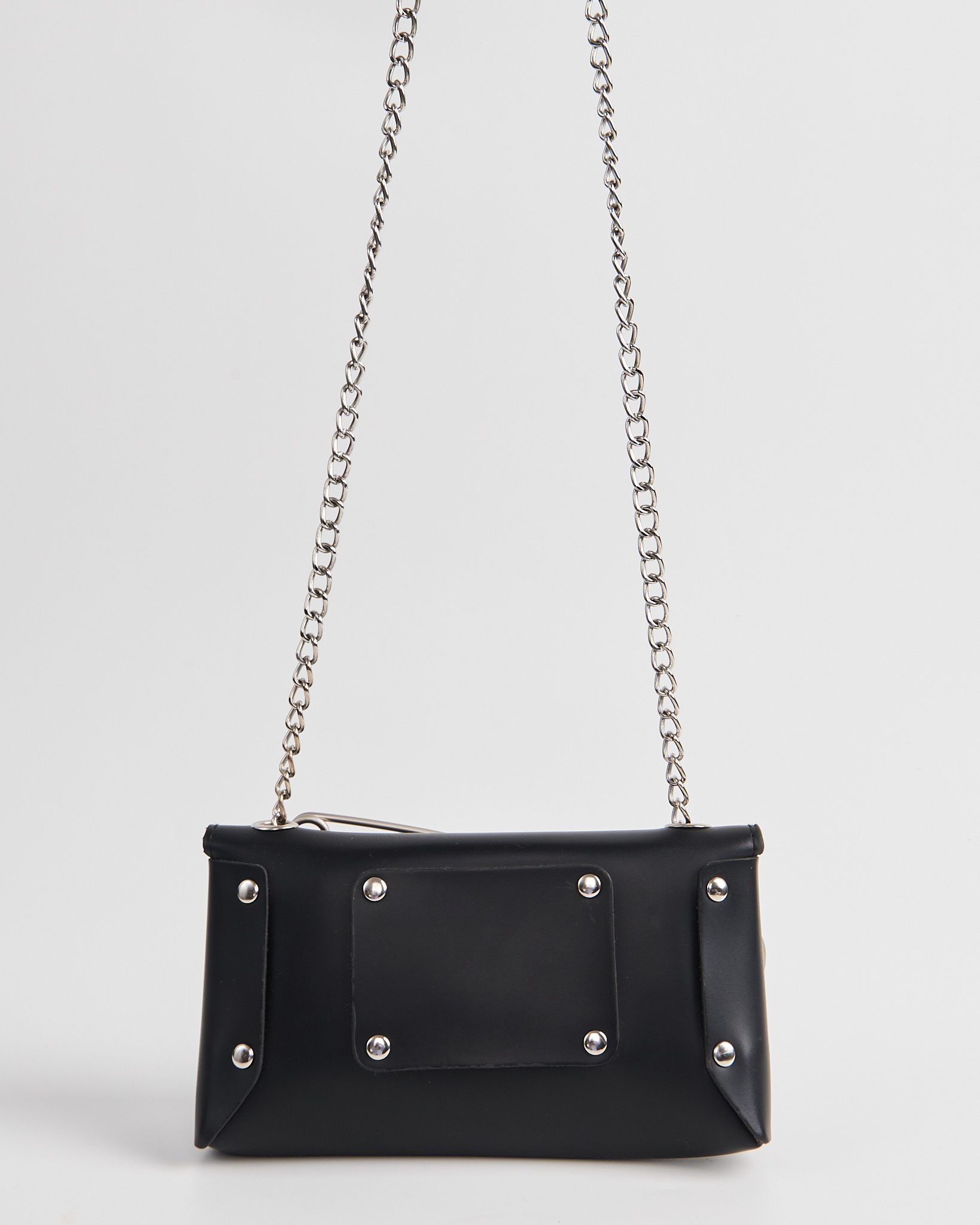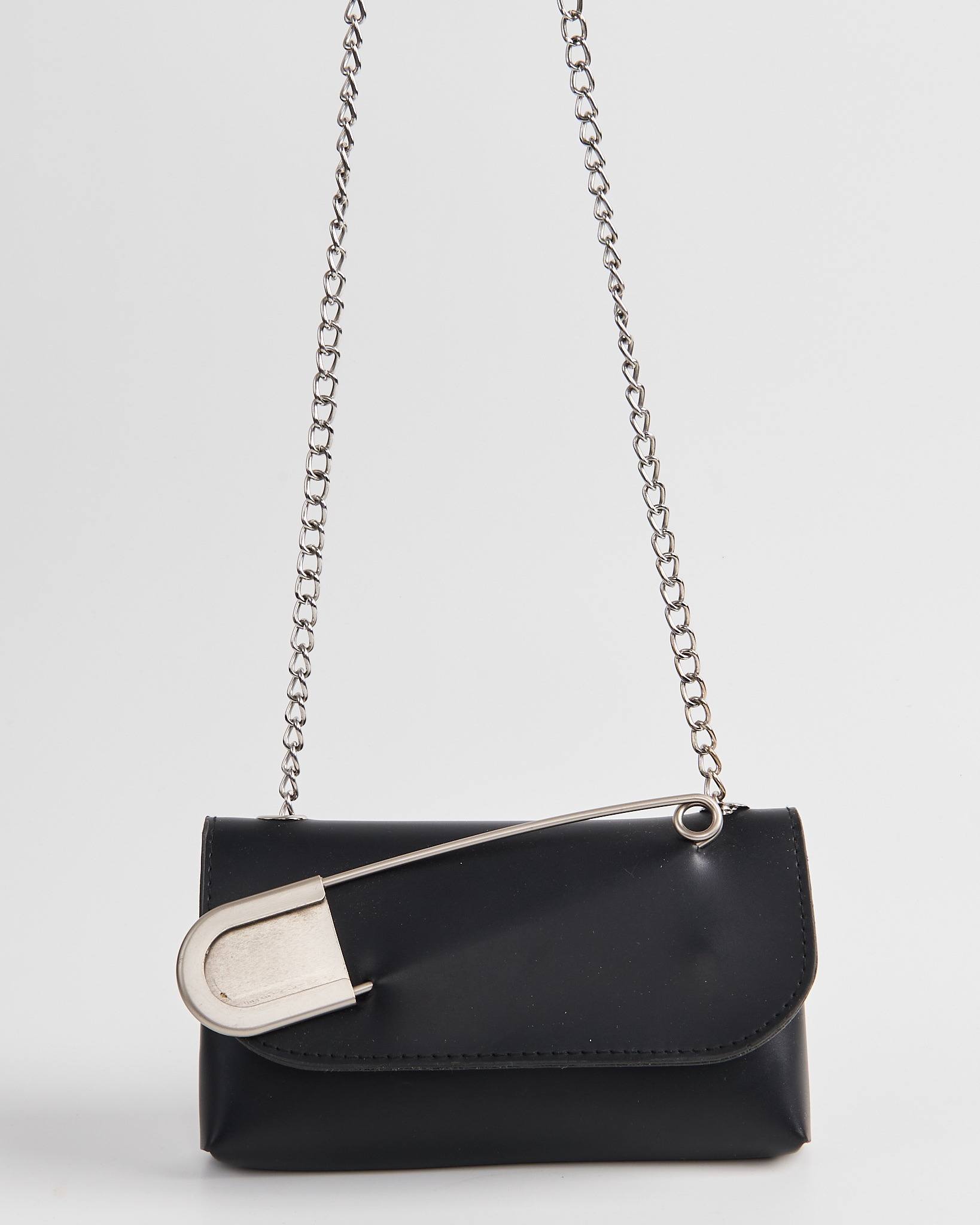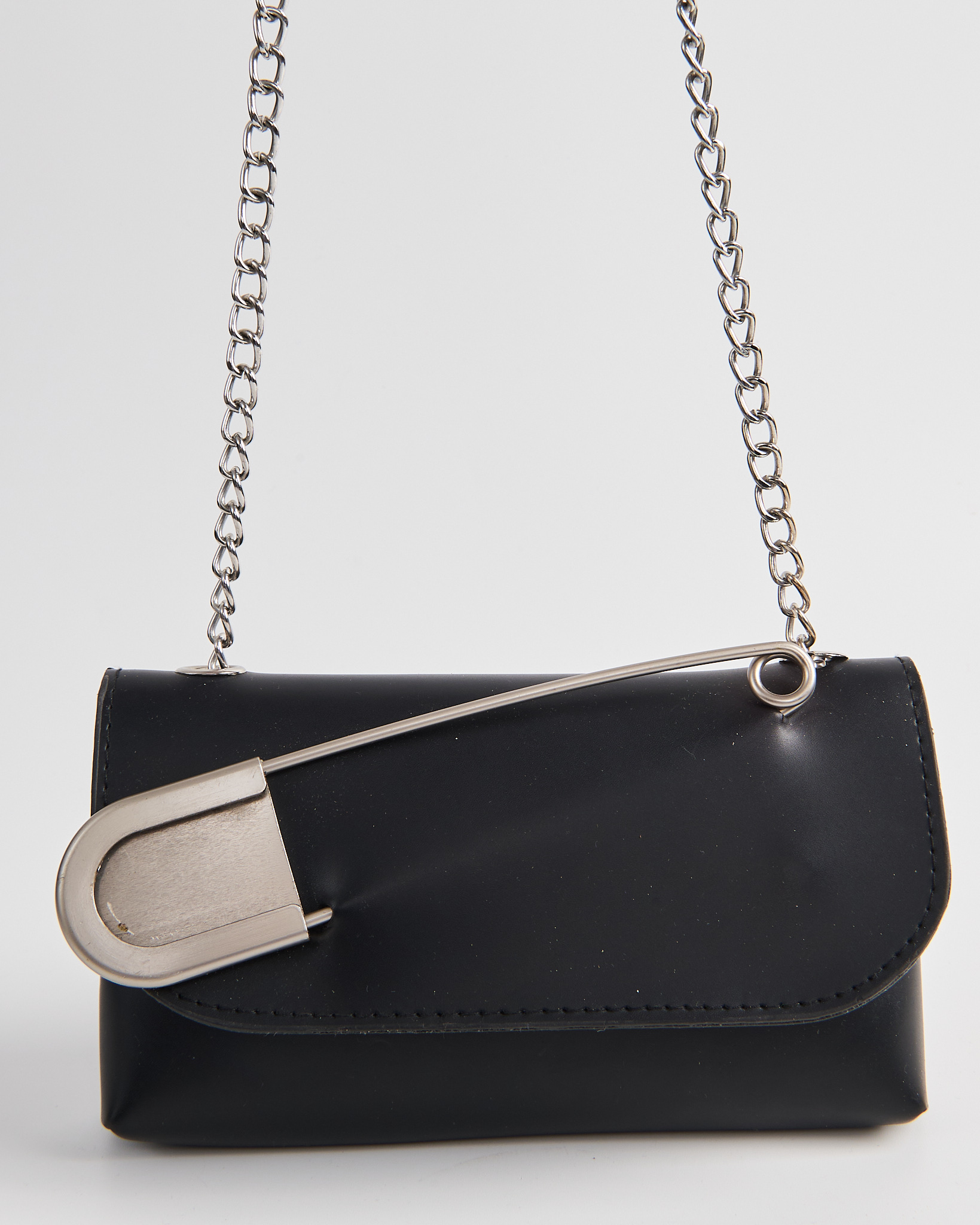 Сумка из искусственной кожи черного цвета. Клапан на магнитных кнопках. Внутри одно отделение. Цепочка крепится на кольца. Металлическая булавка спереди в виде акцента.