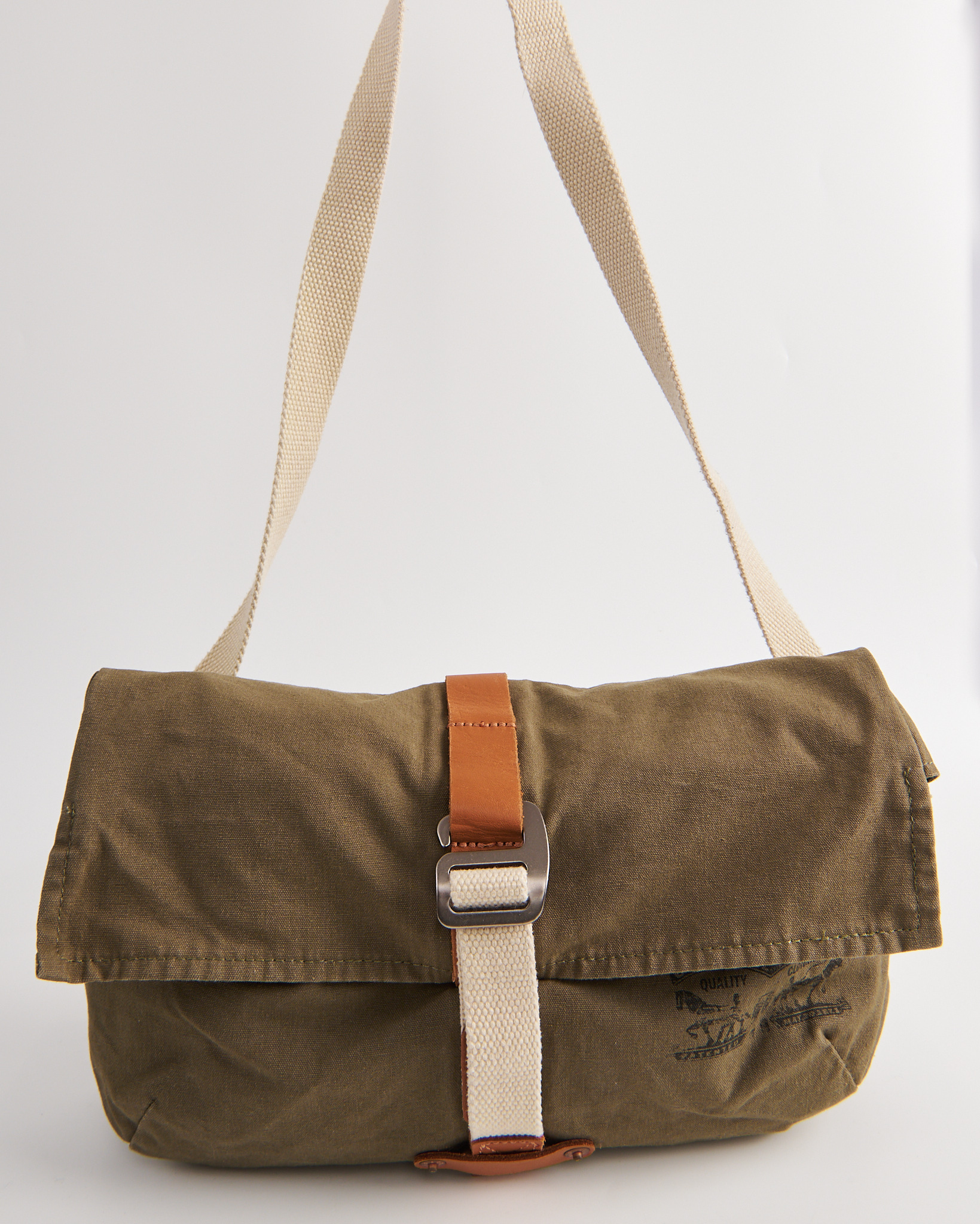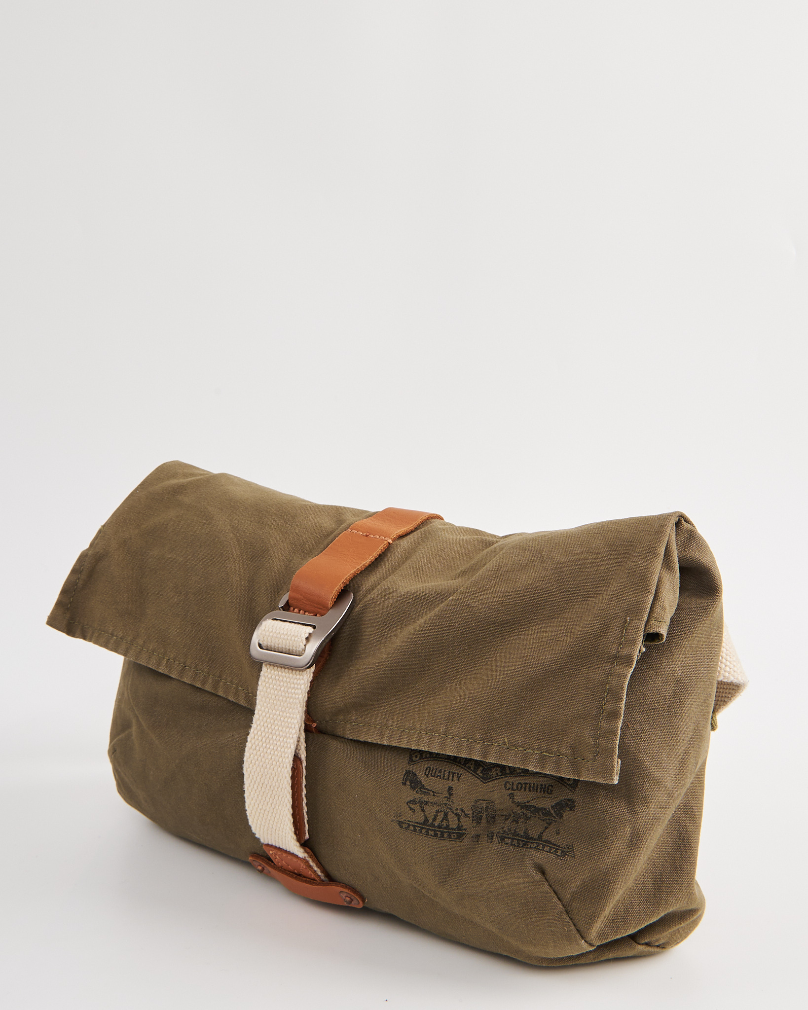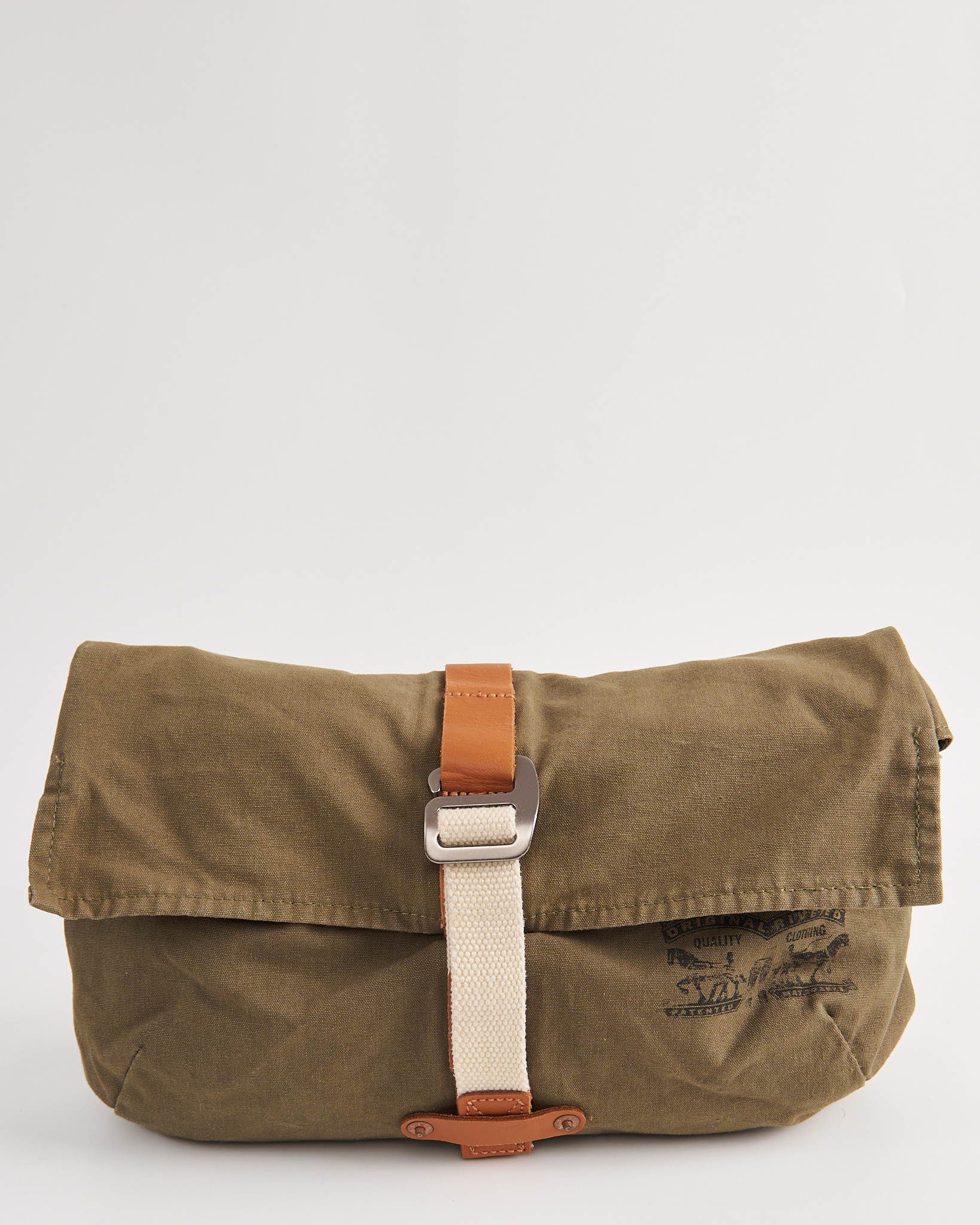 Сумка Levi's цвета хаки. Мягкая форма. Длина ремня регулируется металлической пряжкой. Основное отделение закрывается на молнию. Сверху клапан с фиксирующим ремнем и металлической рамкой. Внутри вместительное пространство. На внешней стороне фирменный принт Levi Strauss & Co.