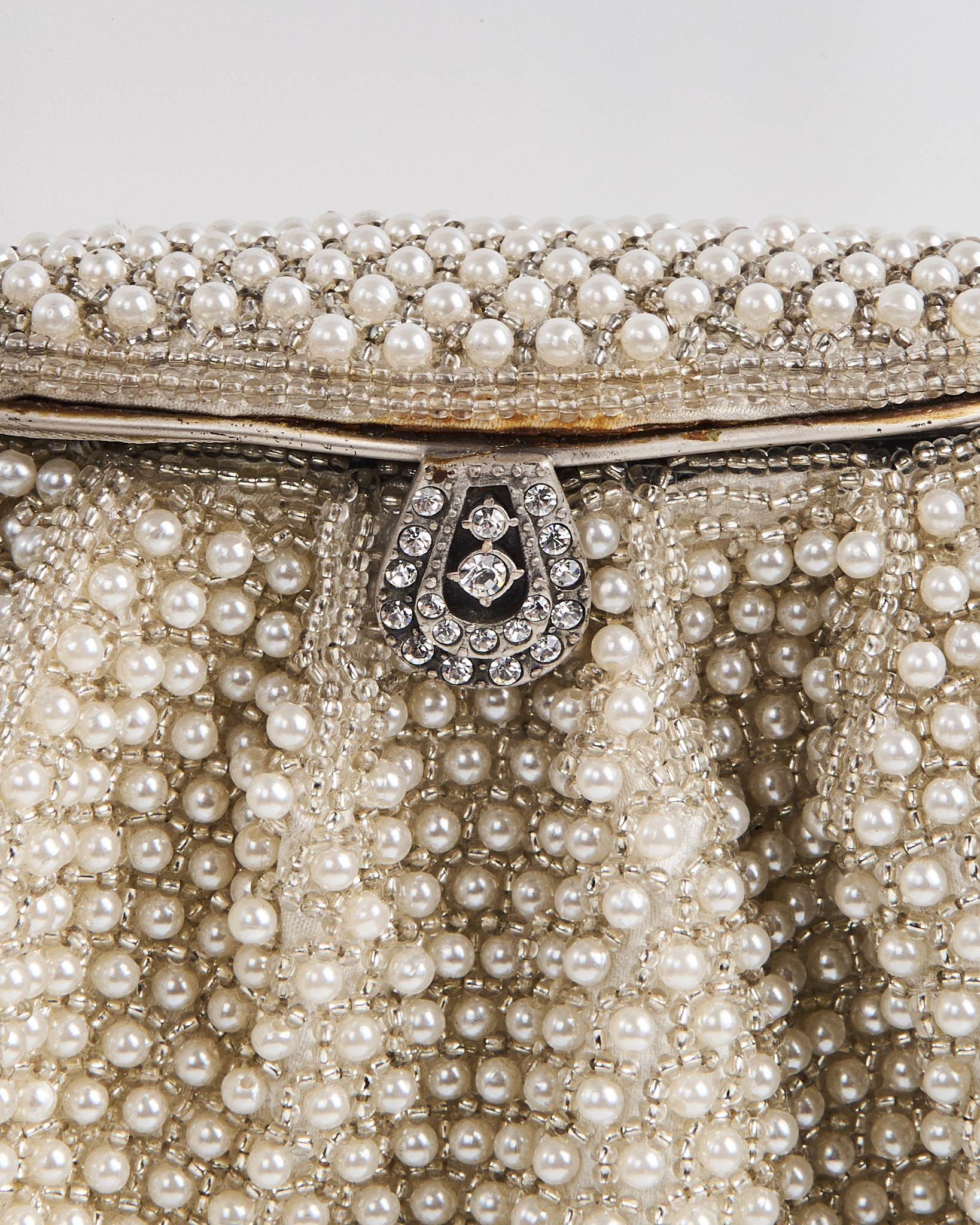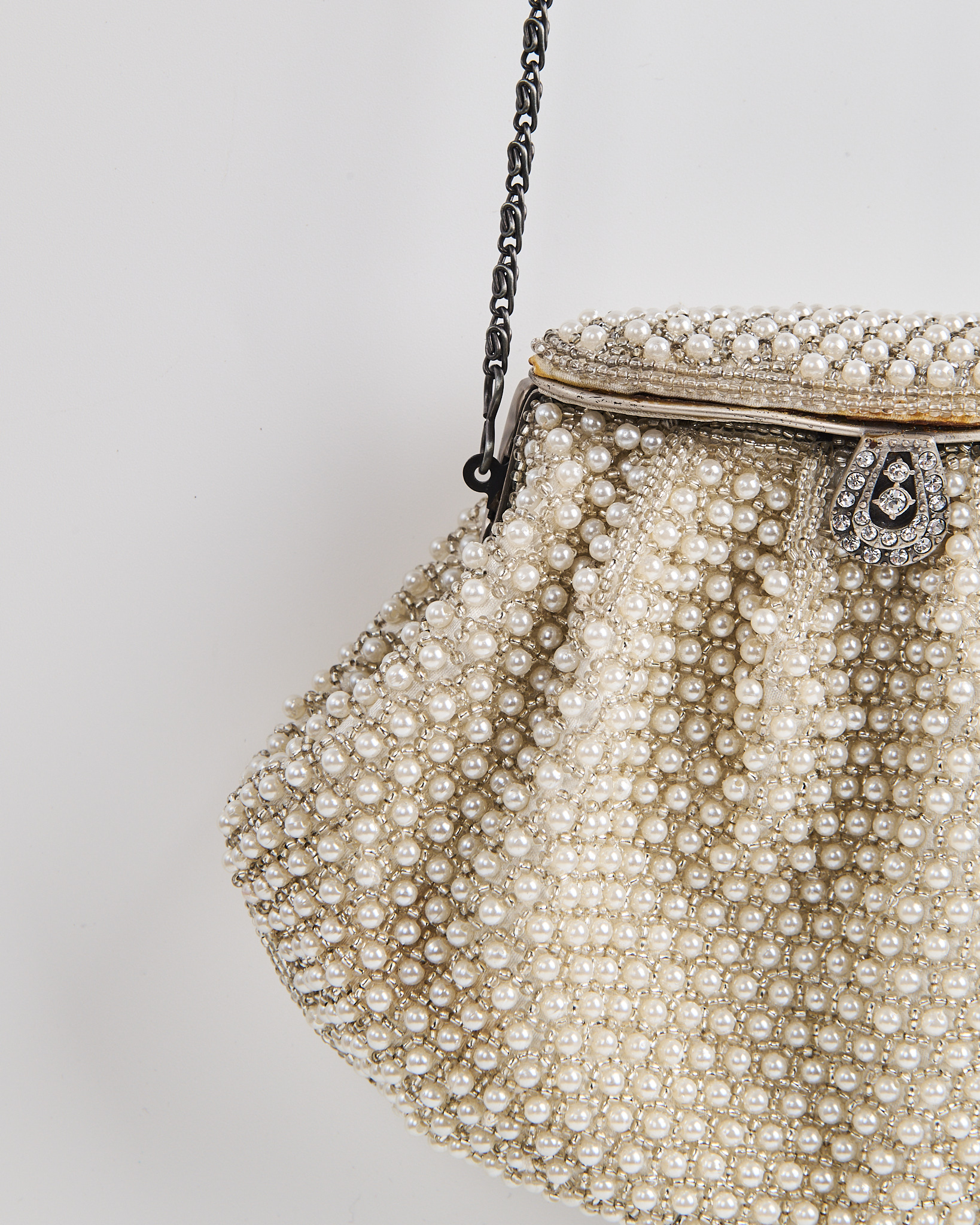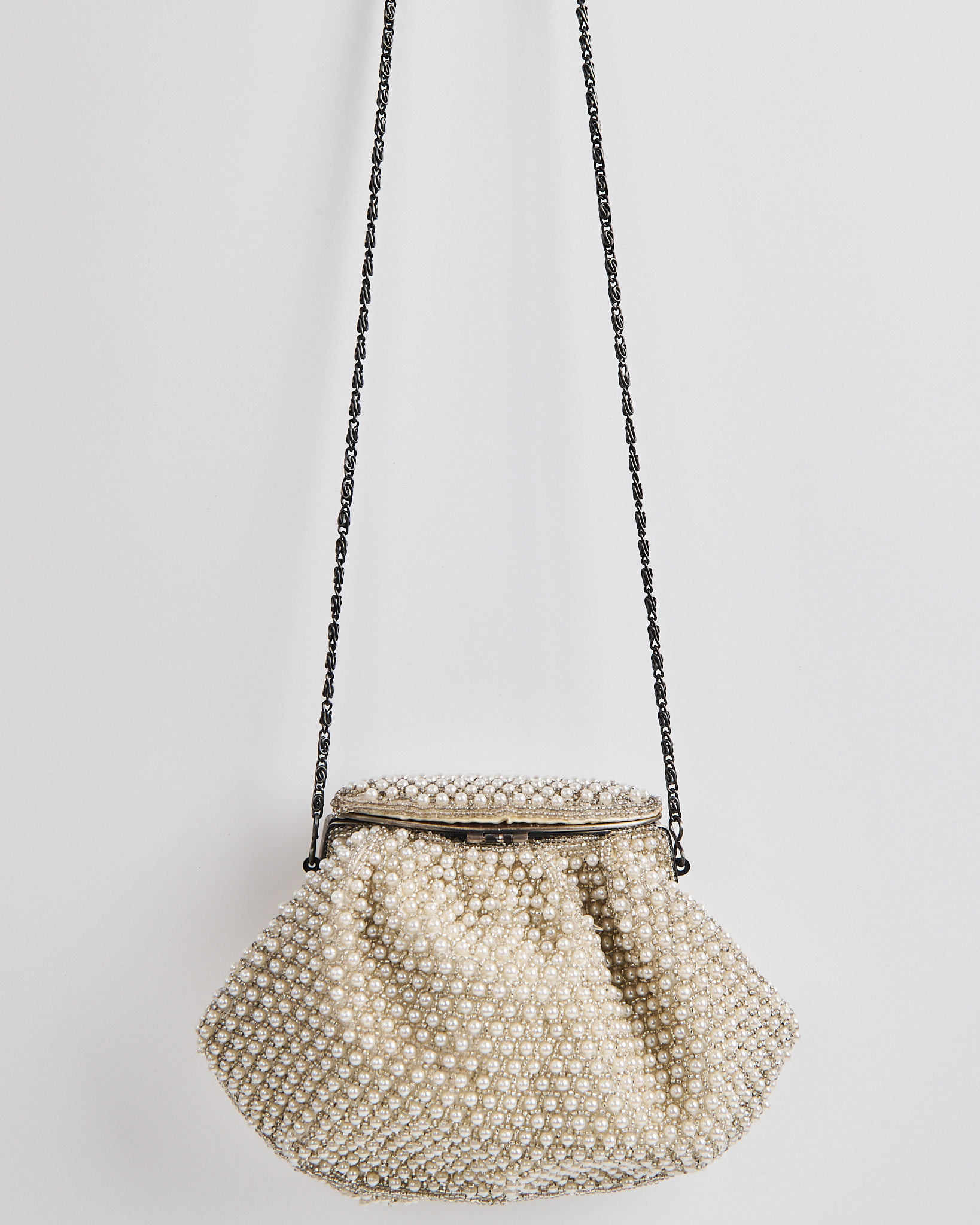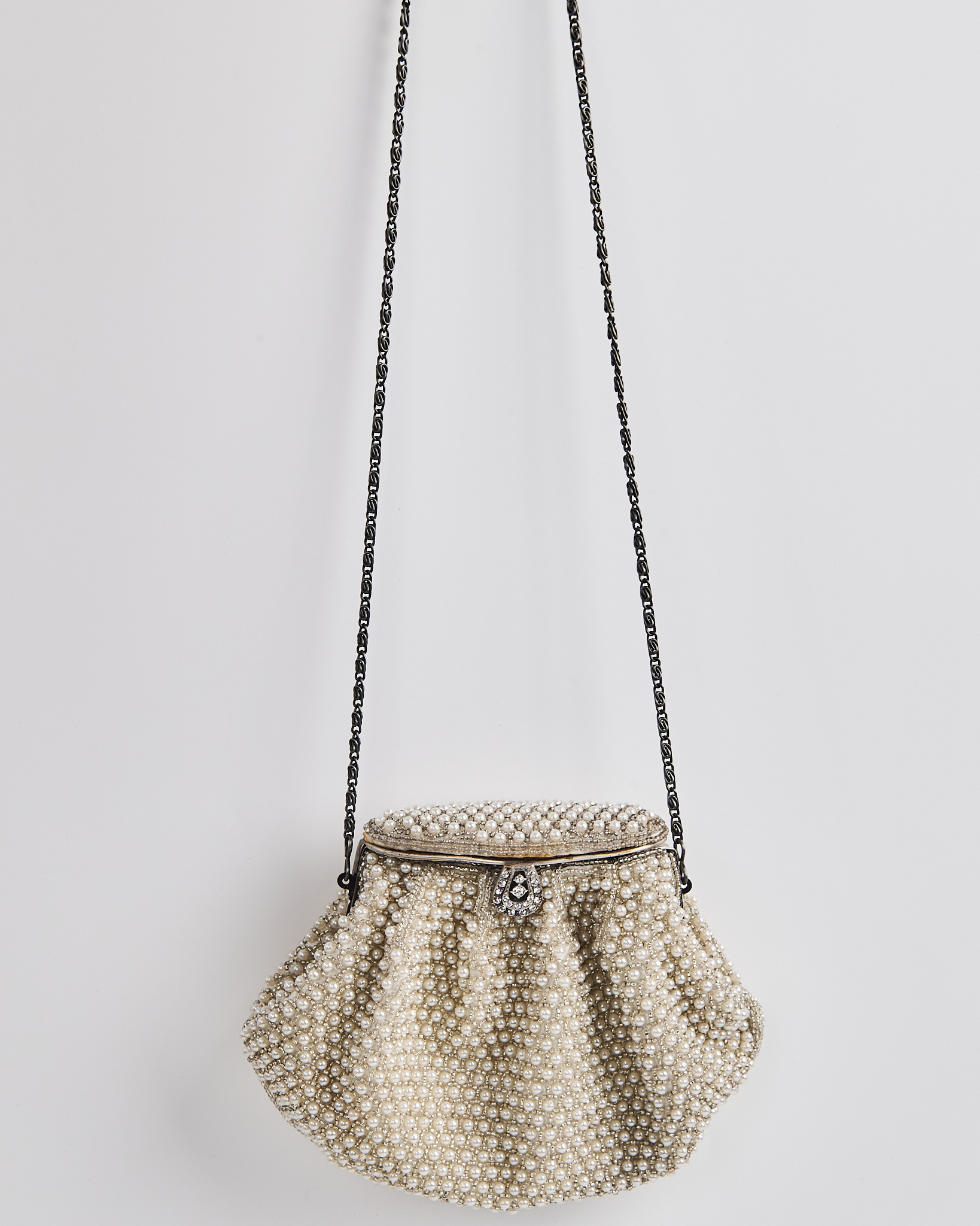 Ридикюль с плотной вышивкой из мелкого жемчуга. Удобная посадка на плече за счёт тонкой цепочки. Металлическая рамка с застёжкой украшена вставками со стразами.