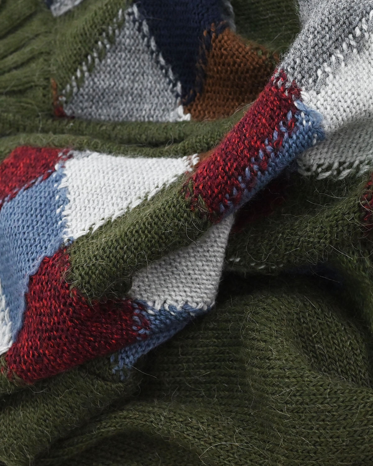 - Контрастные цвета — бордовый, синий, белый и коричневый — создают выразительный акцент в образе.