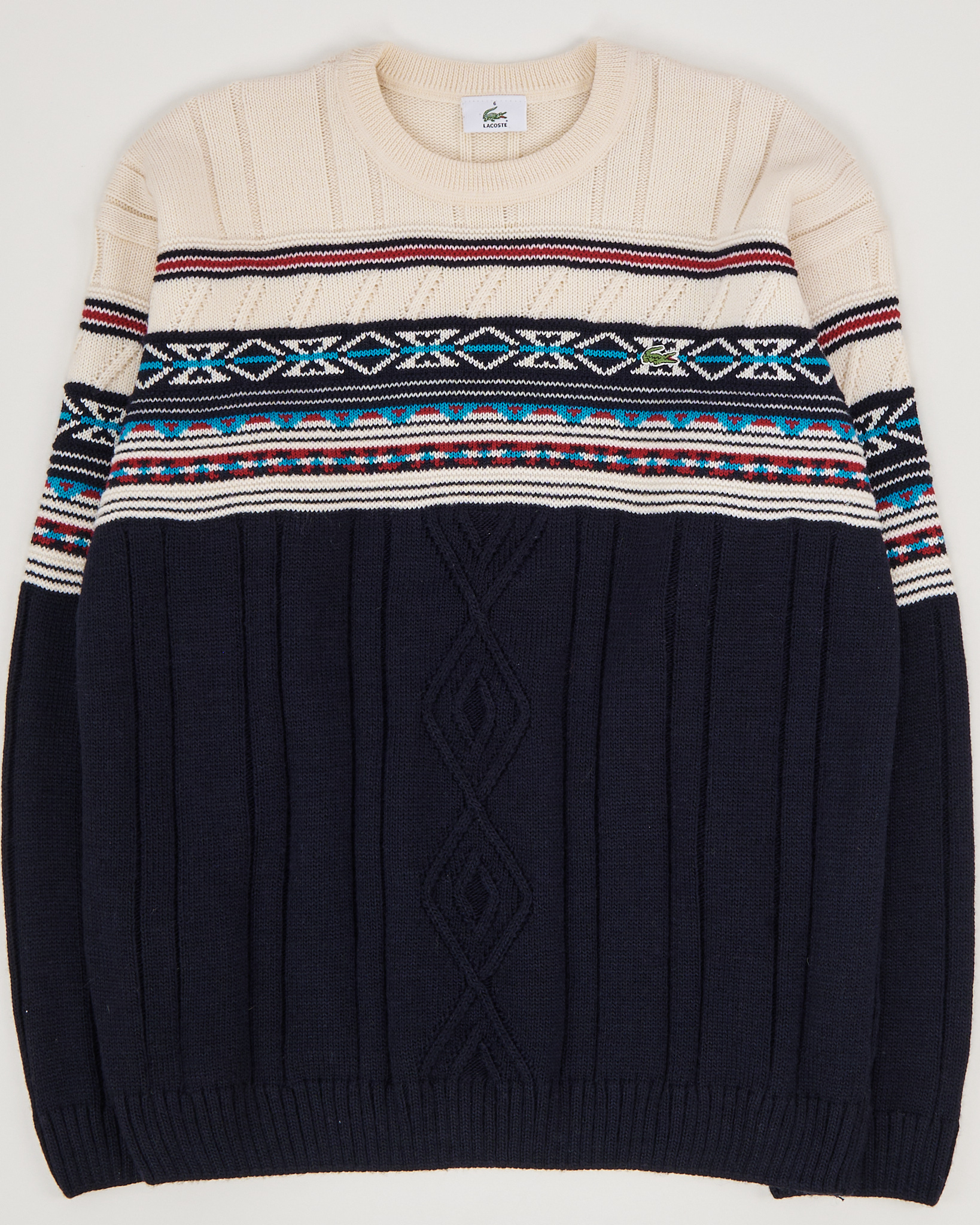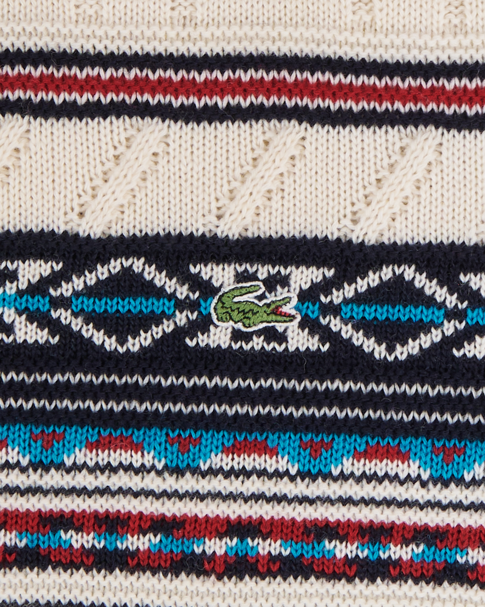 Lacoste свитер с орнаментом и фактурной вязкой. Свитер Lacoste выполнен из плотного трикотажа с выразительной вязкой и контрастным орнаментом в верхней части. Мягкая пряжа приятно ощущается на коже, сохраняет форму и держит структуру даже при активной носке. Прямой силуэт с аккуратной посадкой по плечам и эластичными манжетами создаёт собранный, уверенный образ. Фирменный логотип-крокодил и сложная комбинация узоров делают модель заметной в коллекции и подчёркивают её характер. Вещь для тех, кто ценит продуманные детали и качество исполнения культового бренда.